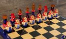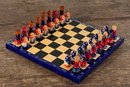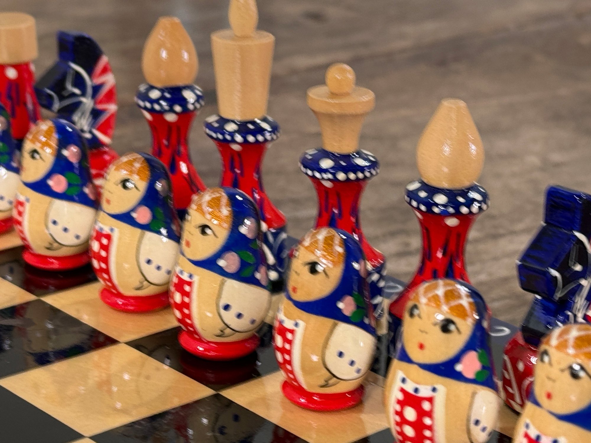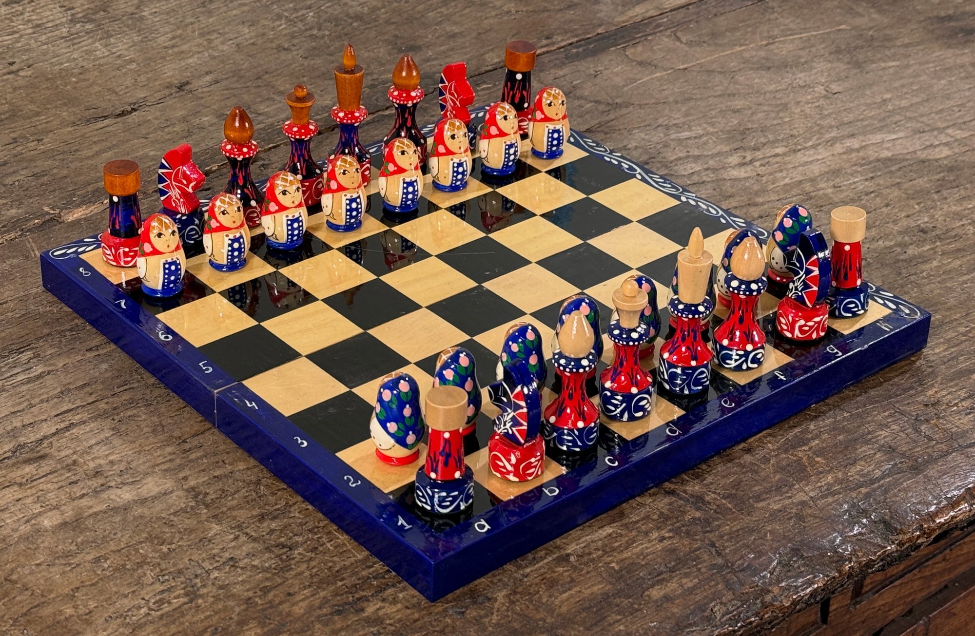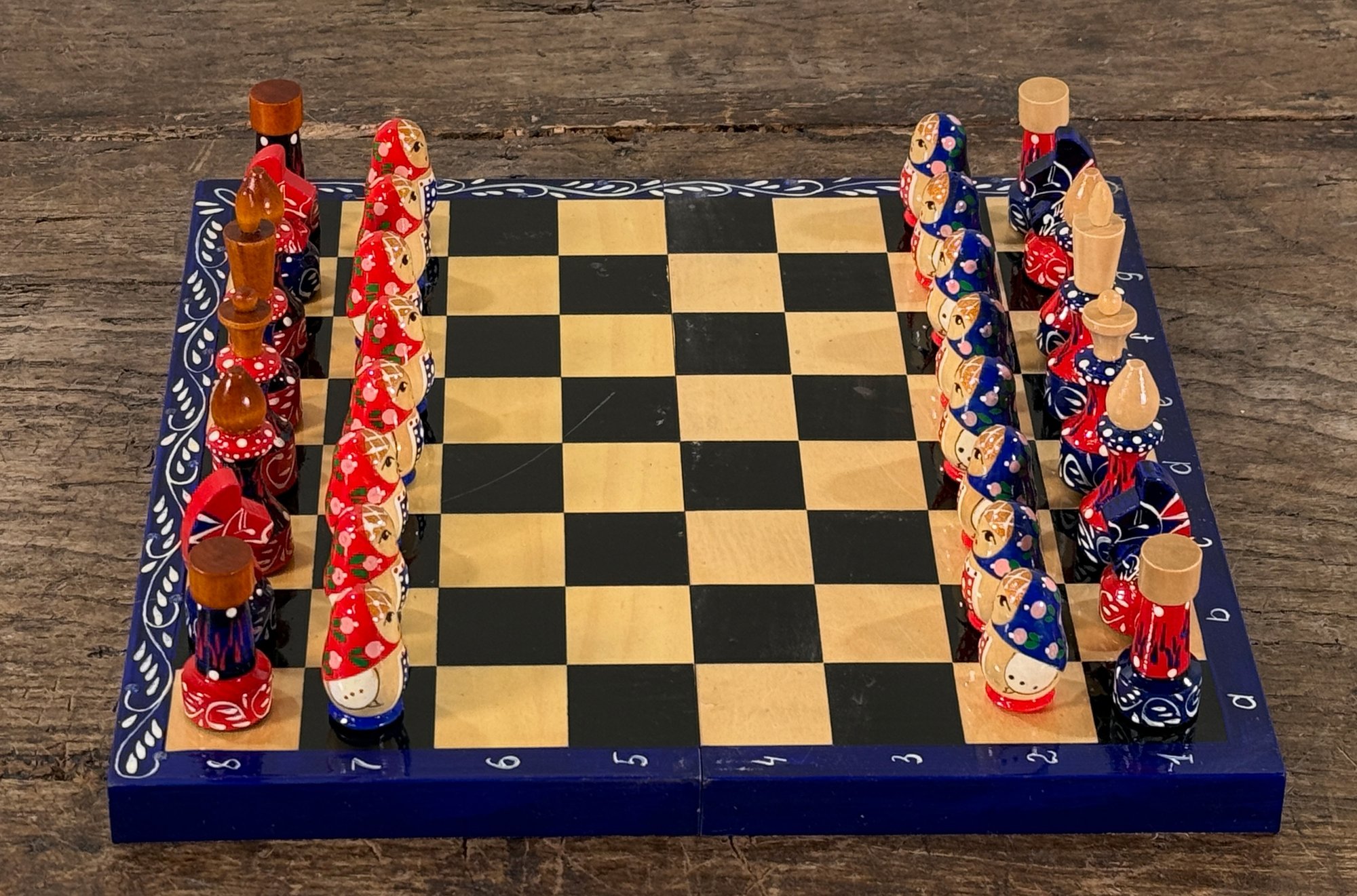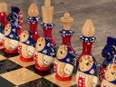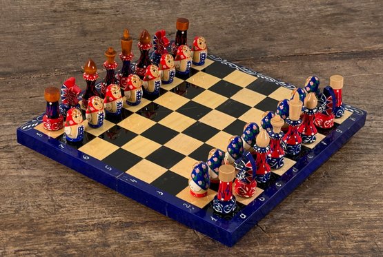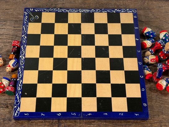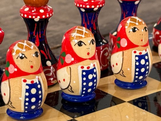 Awesome vintage hand painted Matryoshka Russian nesting doll chess set. The board folds up so you can easily travel with it. Measures 11.25" square. Complete, very good condition as shown.