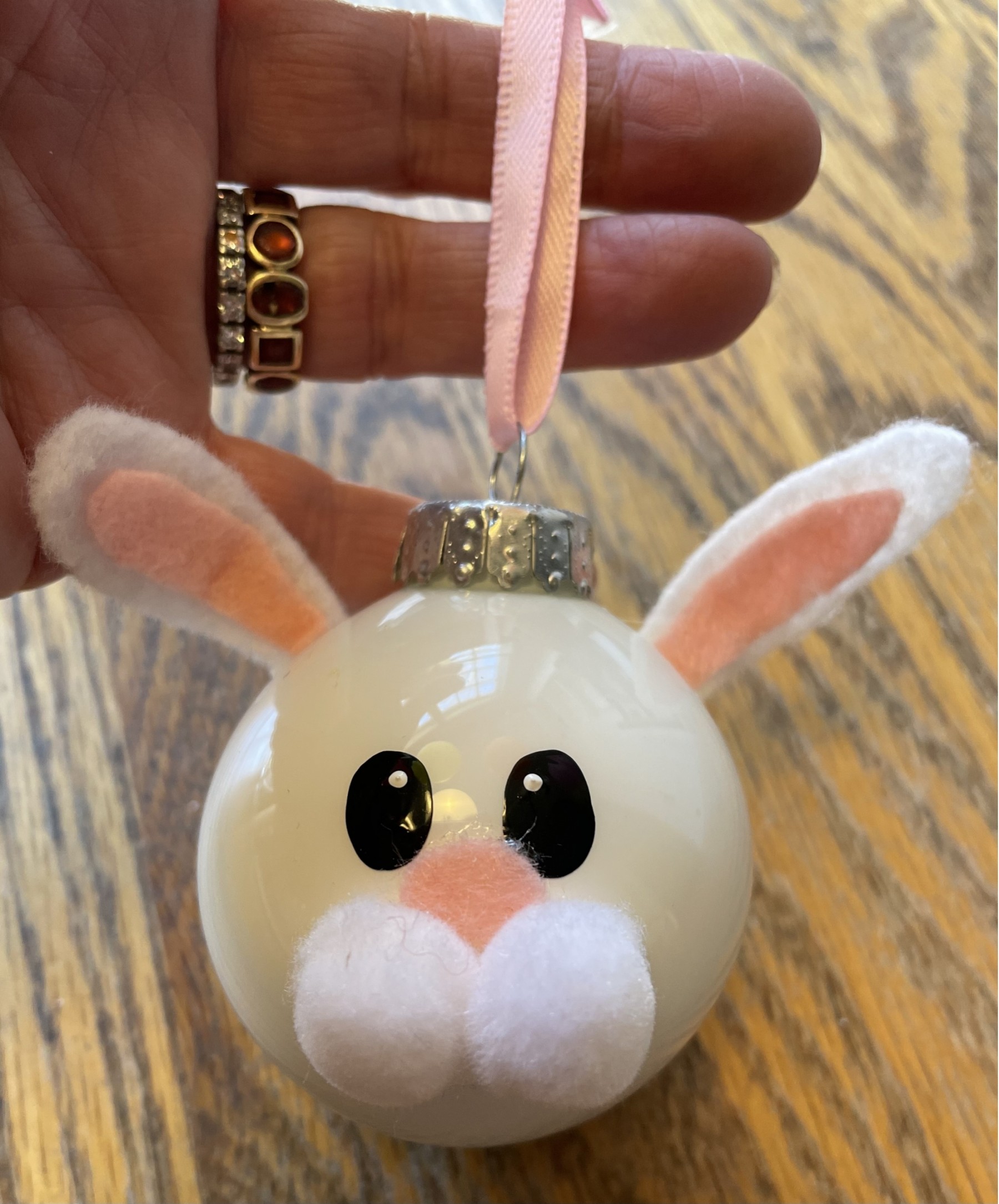 Adorable glass bunny ornament by G & B, and marked on top. The bunny has felt ears and nose. It's in very good condition and it is 2 1/4" in diameter, not counting the ears, etc.