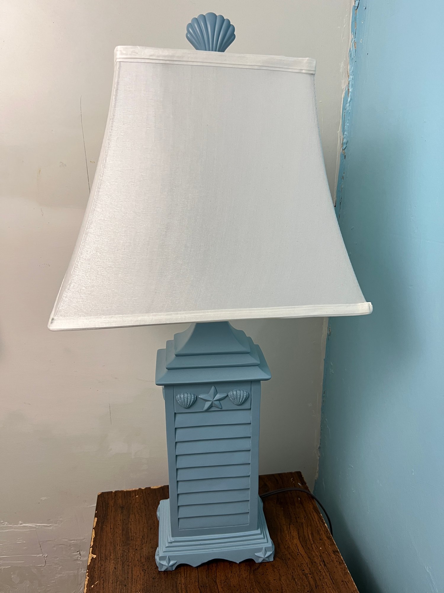 Baby blue painted table lamp with a distinctively New England coastal style featuring a louvered effect on the body topped with a star and a white shade topped with a scallop shell form finial.