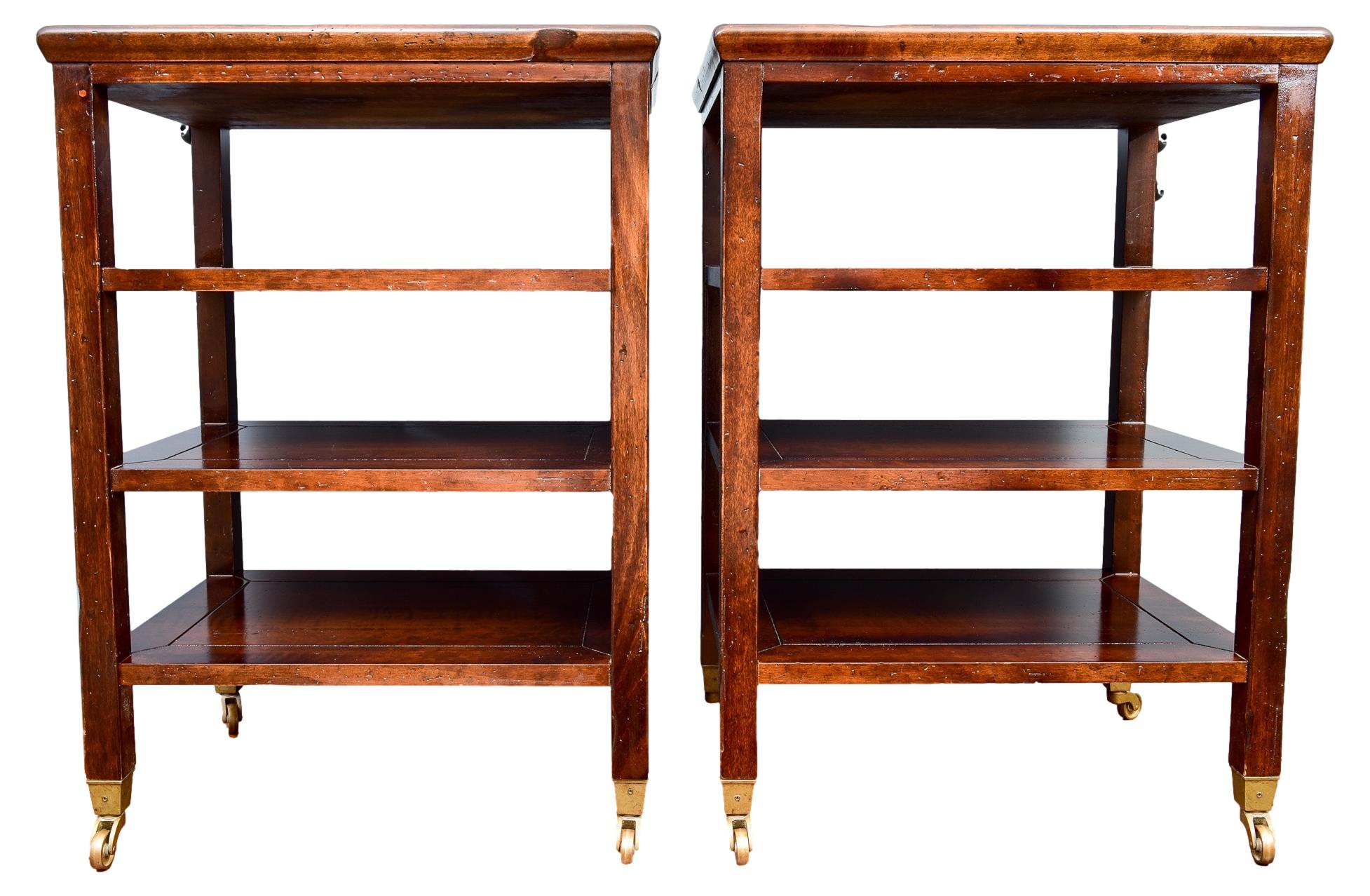 Vintage circa last quarter 20th century Baker Milling Road four tiered side tables made from mahogany with a naturally distressed surface, rectangular tray-form top, raised on brass casters. Labeled on underside.