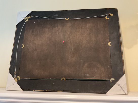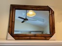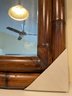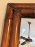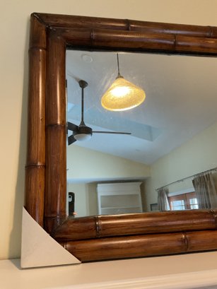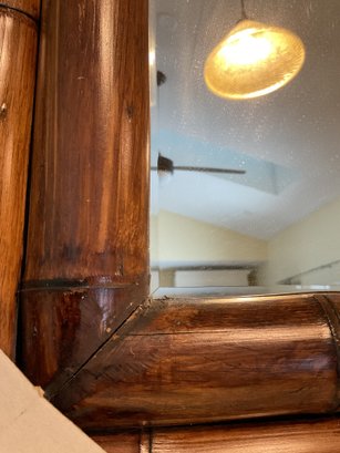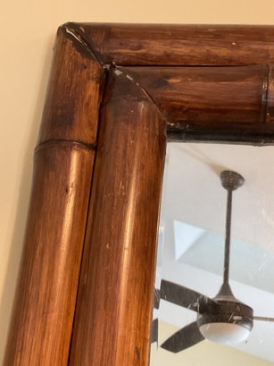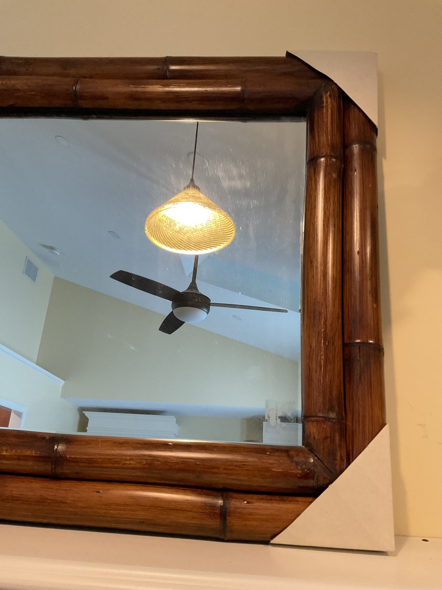 Large mirror still with 3 of 4 protective corner pieces still present. Believed to be unused but in storage for a while. Bamboo frame in good condition with slight scuffs and beveled glass in excellent condition. Can hang either vertical or horizontal. One wire will need repair to hang vertically. Dust and sticker residue to clean off.