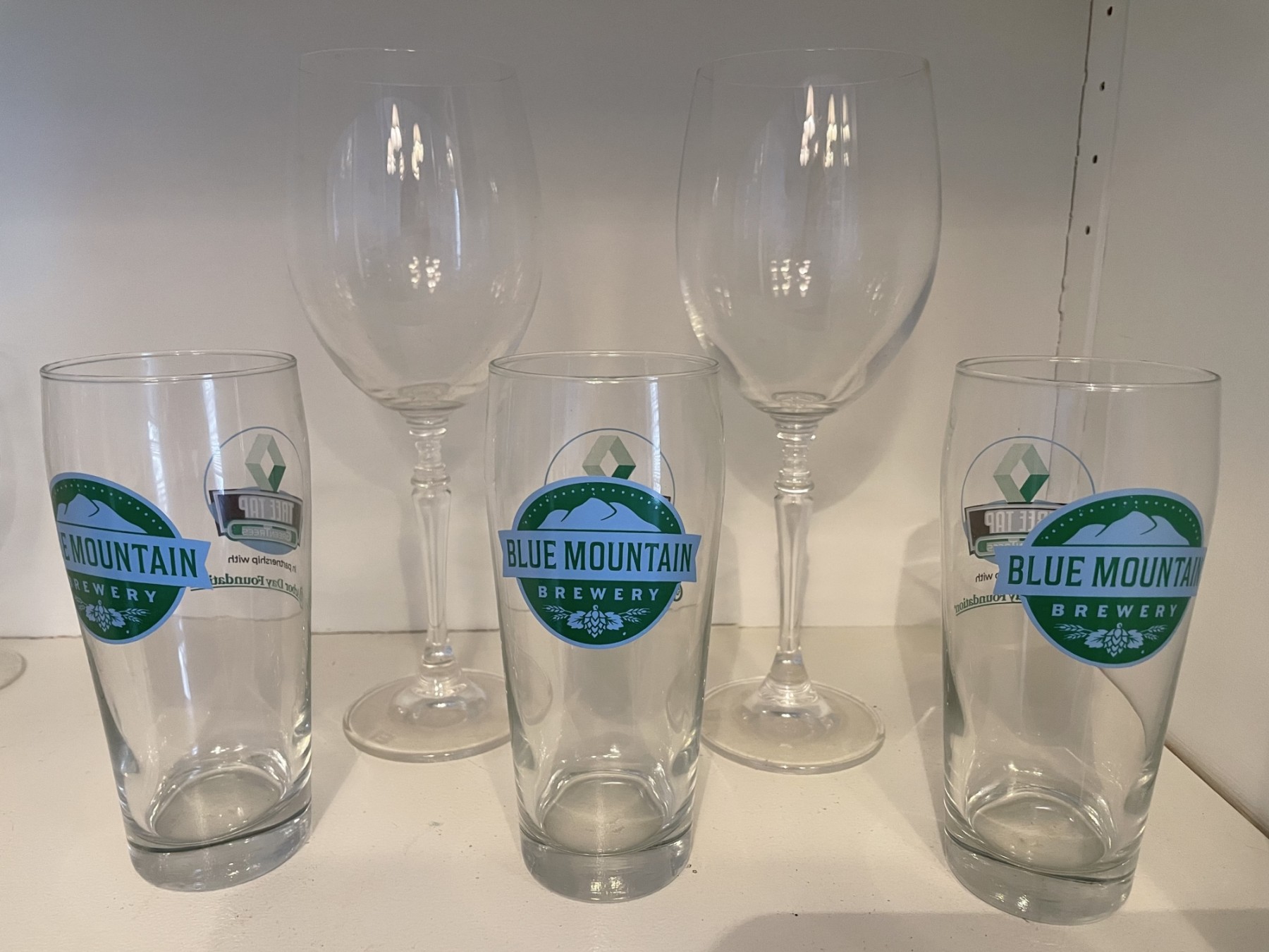 Bar Ware. Two 10 1/2 Inch Wine Glasses And Three Blue Mountain Brewery Wine Glasses