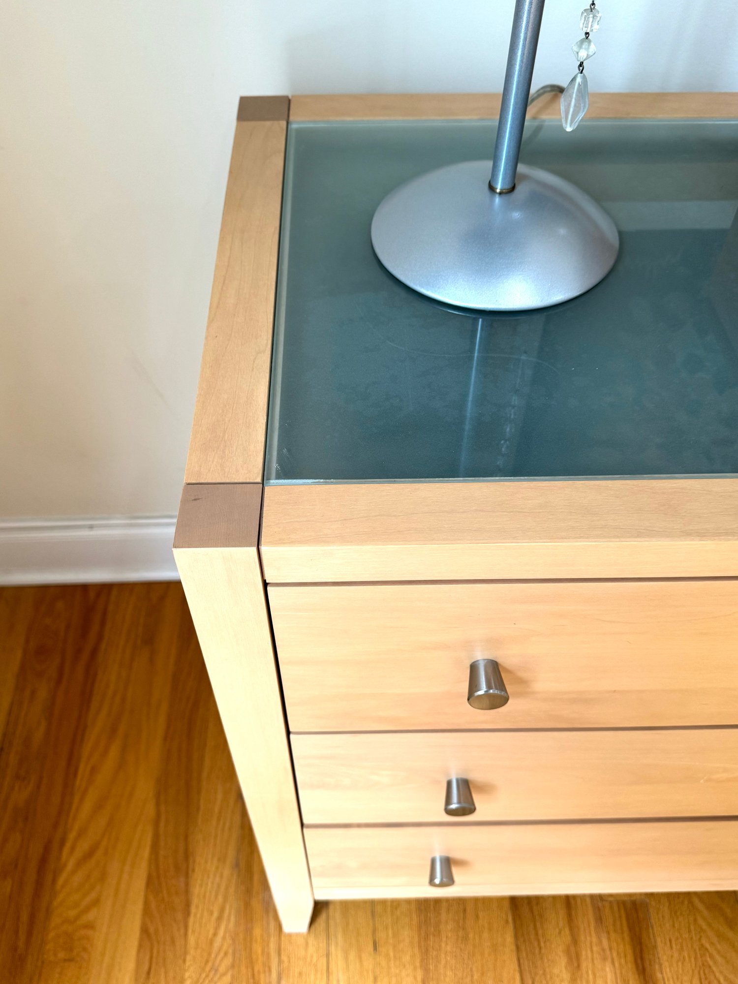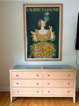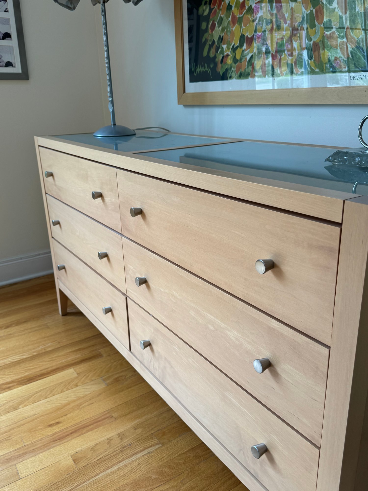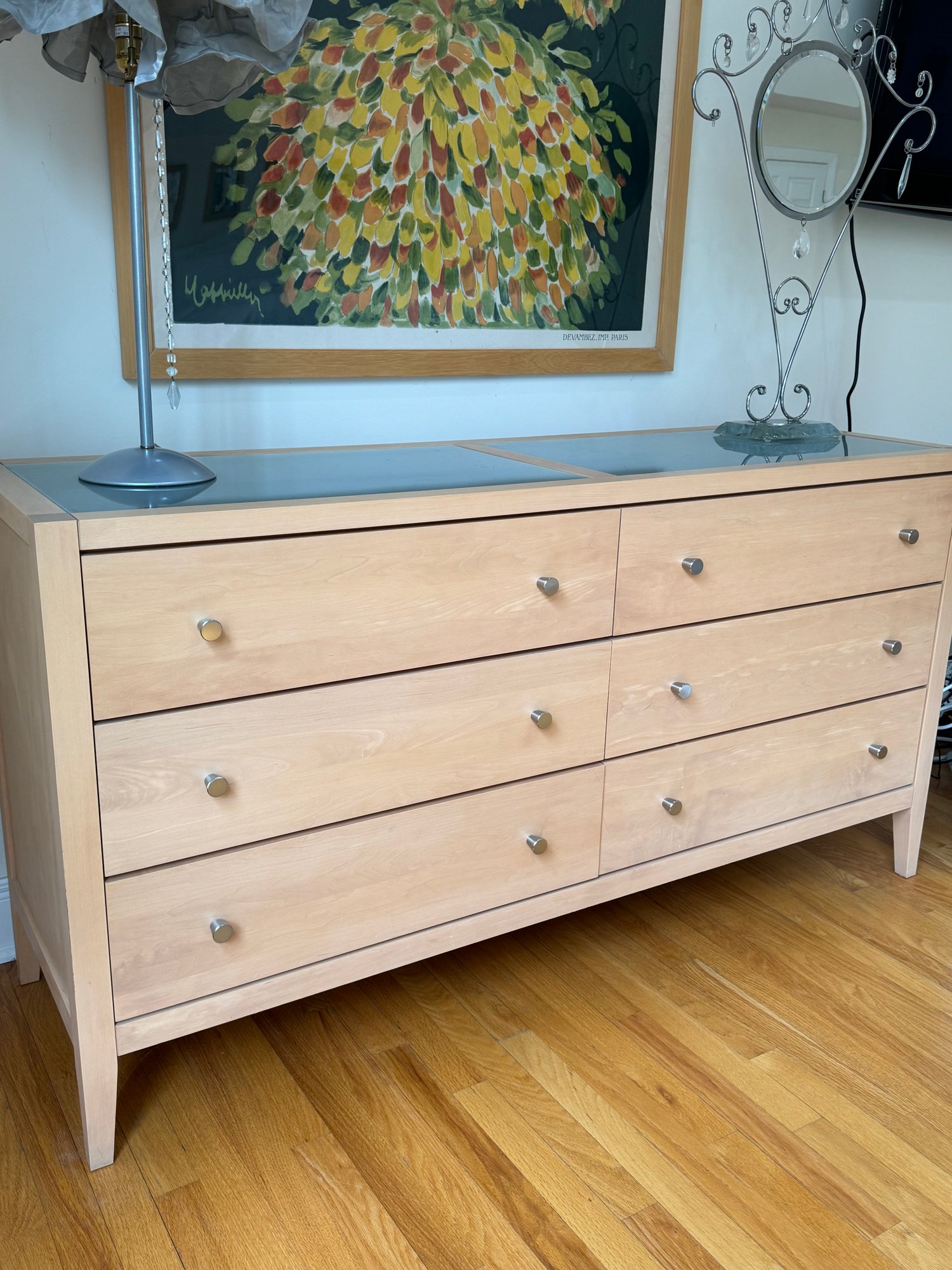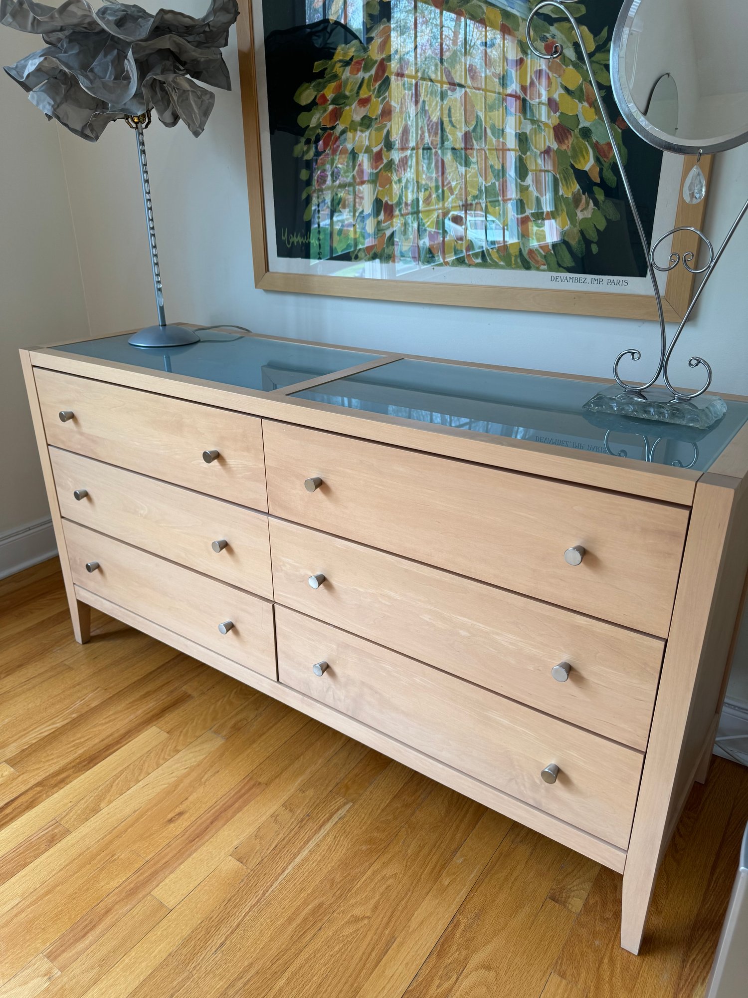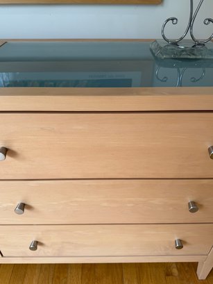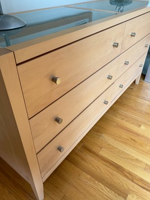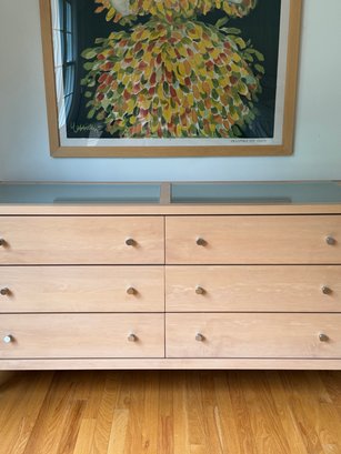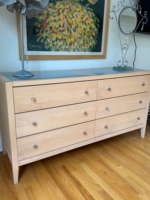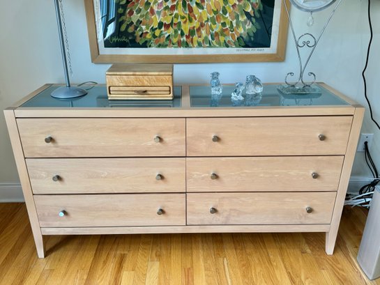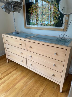 Beautiful contemporary blond wood six drawer chest in lovely condition with a double panel frosted glass top. Drawer pulls are in a brushed nickel finish. Heavy and quality made furniture from Baronet made in Canada. Well cared for and maintained.