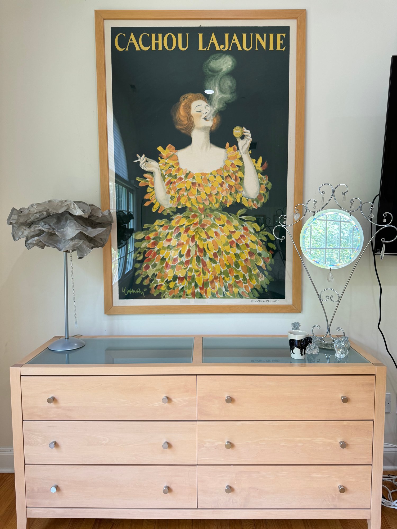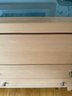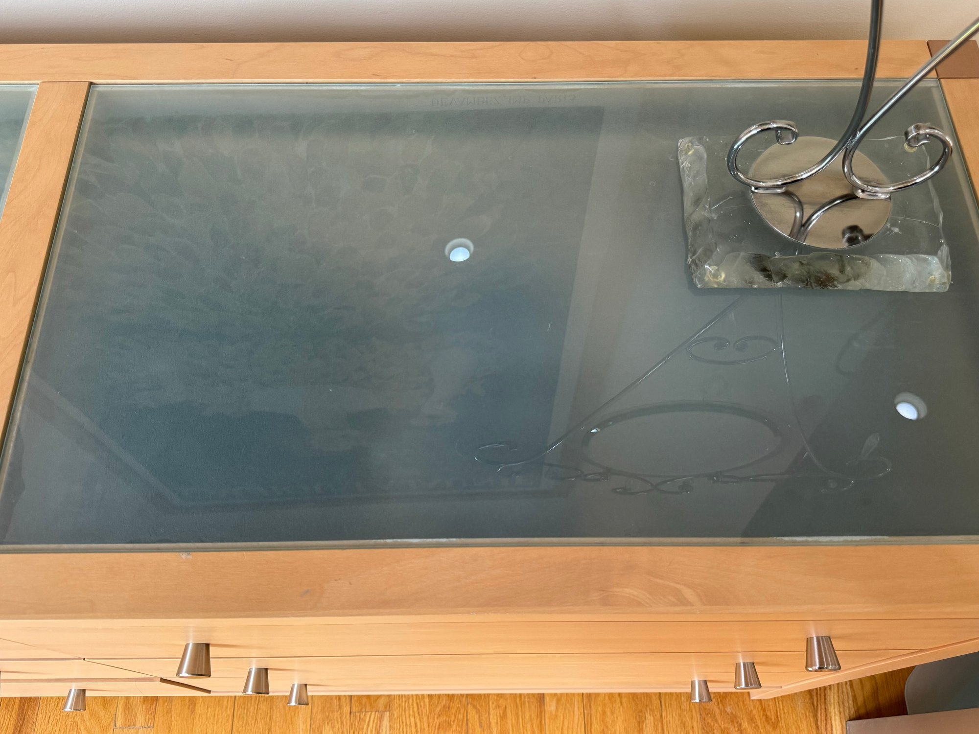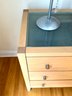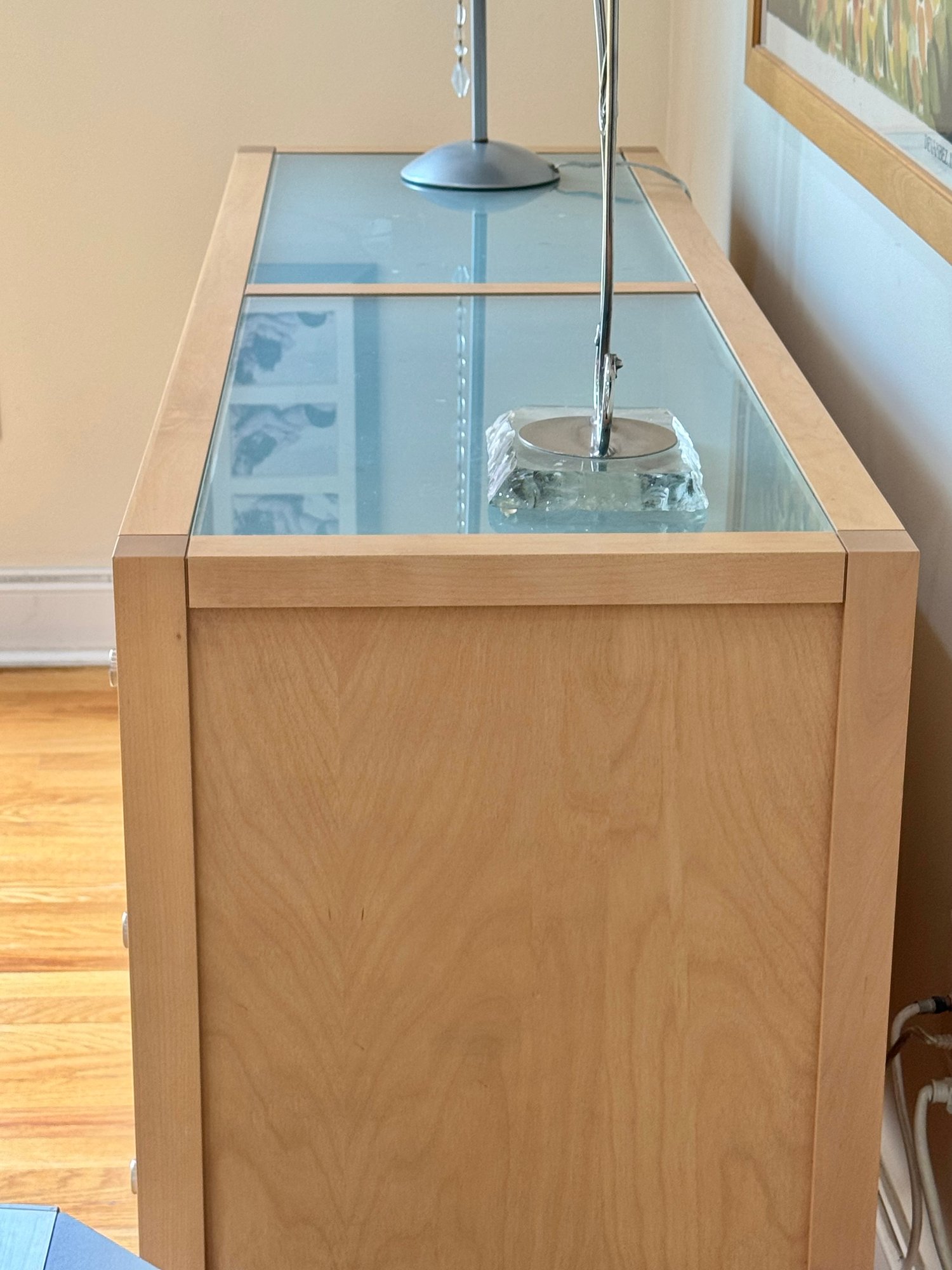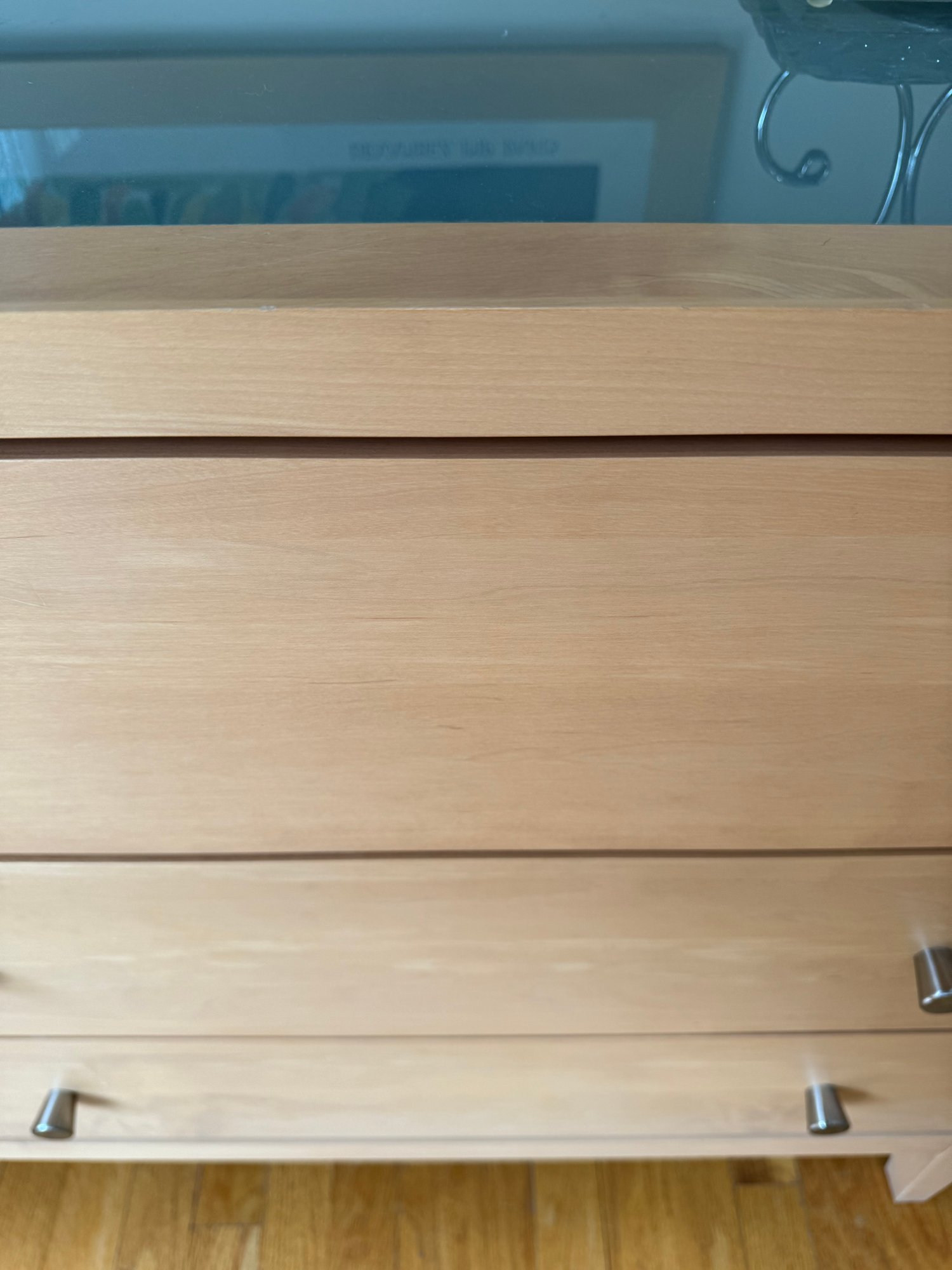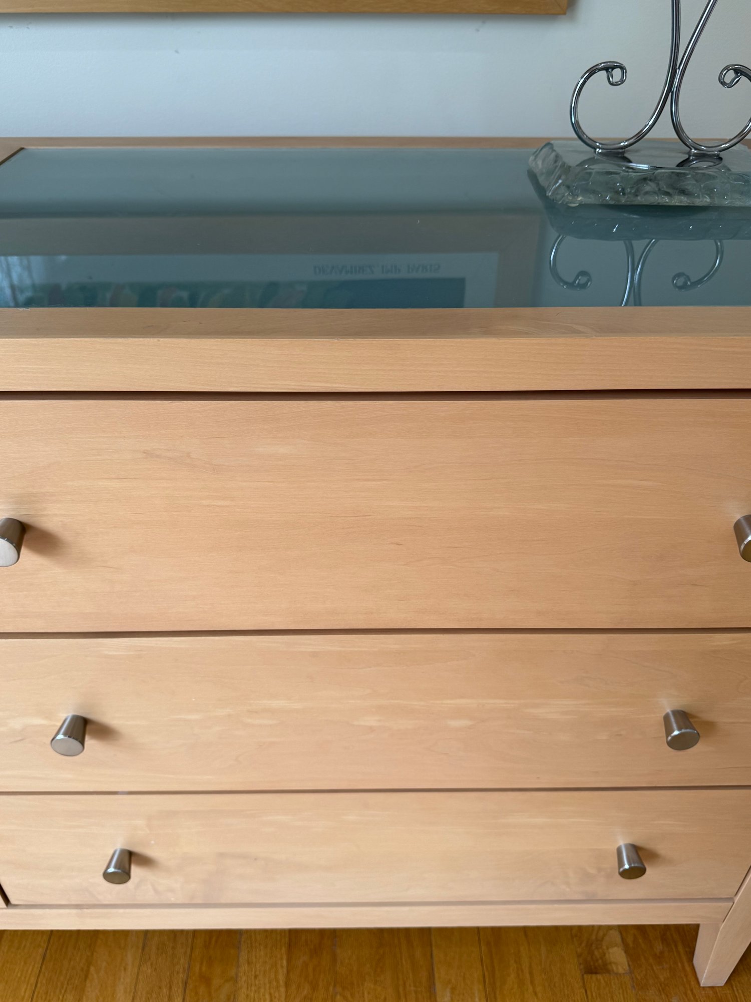 Beautiful contemporary blond wood six drawer chest in lovely condition with a double panel frosted glass top. Drawer pulls are in a brushed nickel finish. Heavy and quality made furniture from Baronet made in Canada. Well cared for and maintained.