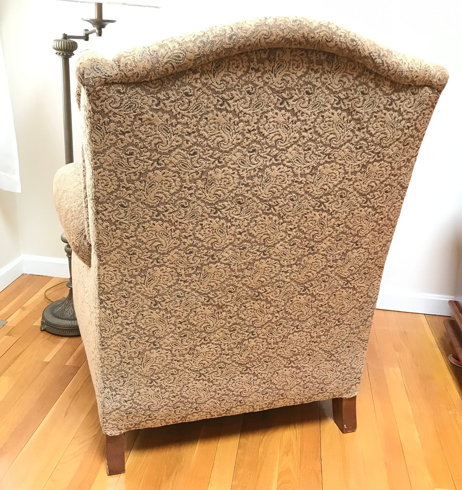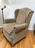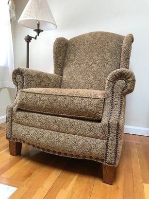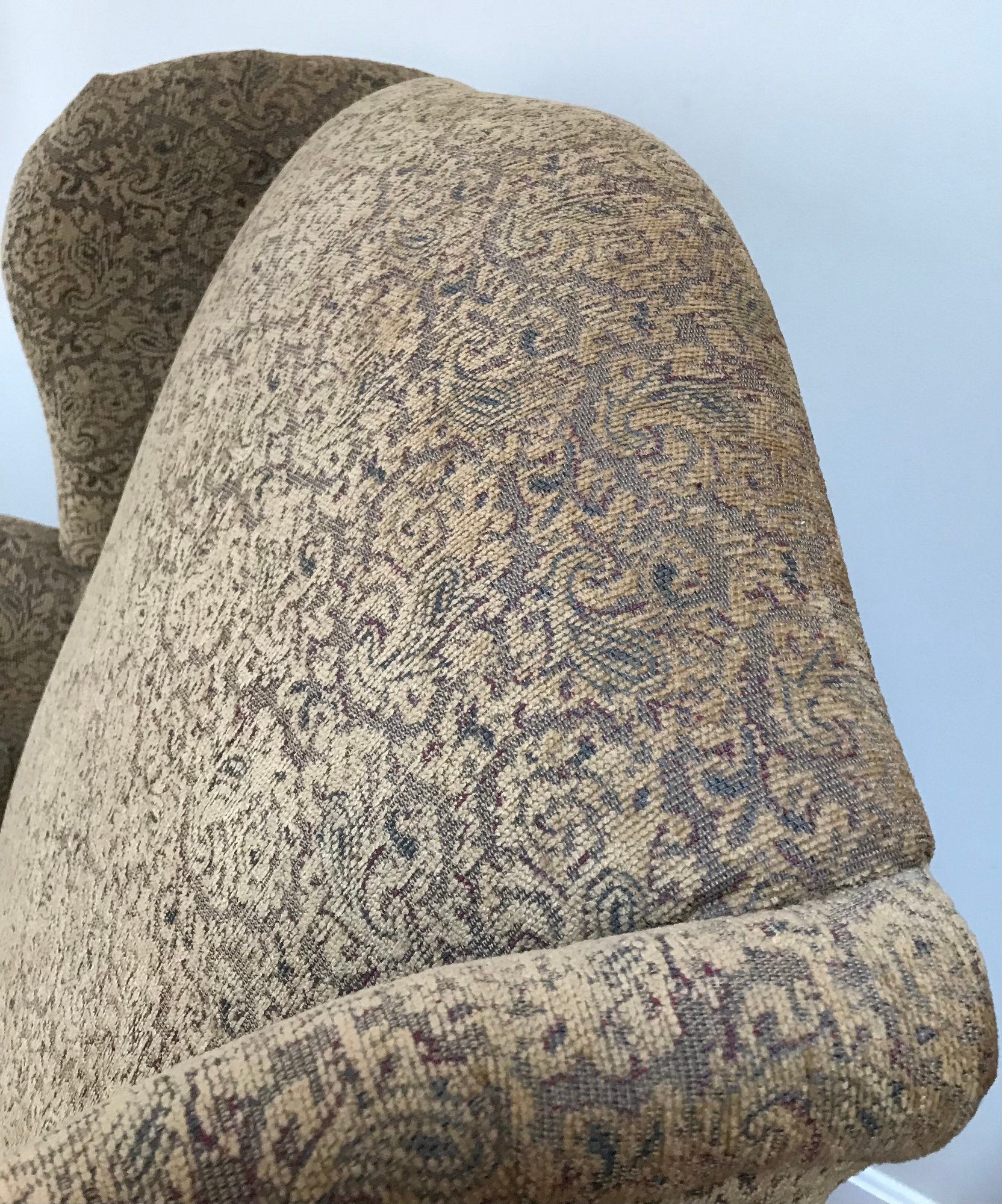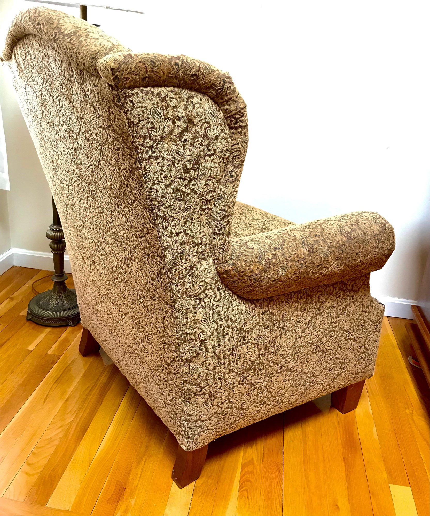 A handsome, high-quality wingback armchair by Bassett Furniture, featuring timeless traditional sBassett Furniture Paisley Upholstered Wingback Chairtyling and a sturdy silhouette. This piece is upholstered in a durable, textured paisley-patterned fabric in warm neutral tones of tan, gold, and chocolate.