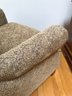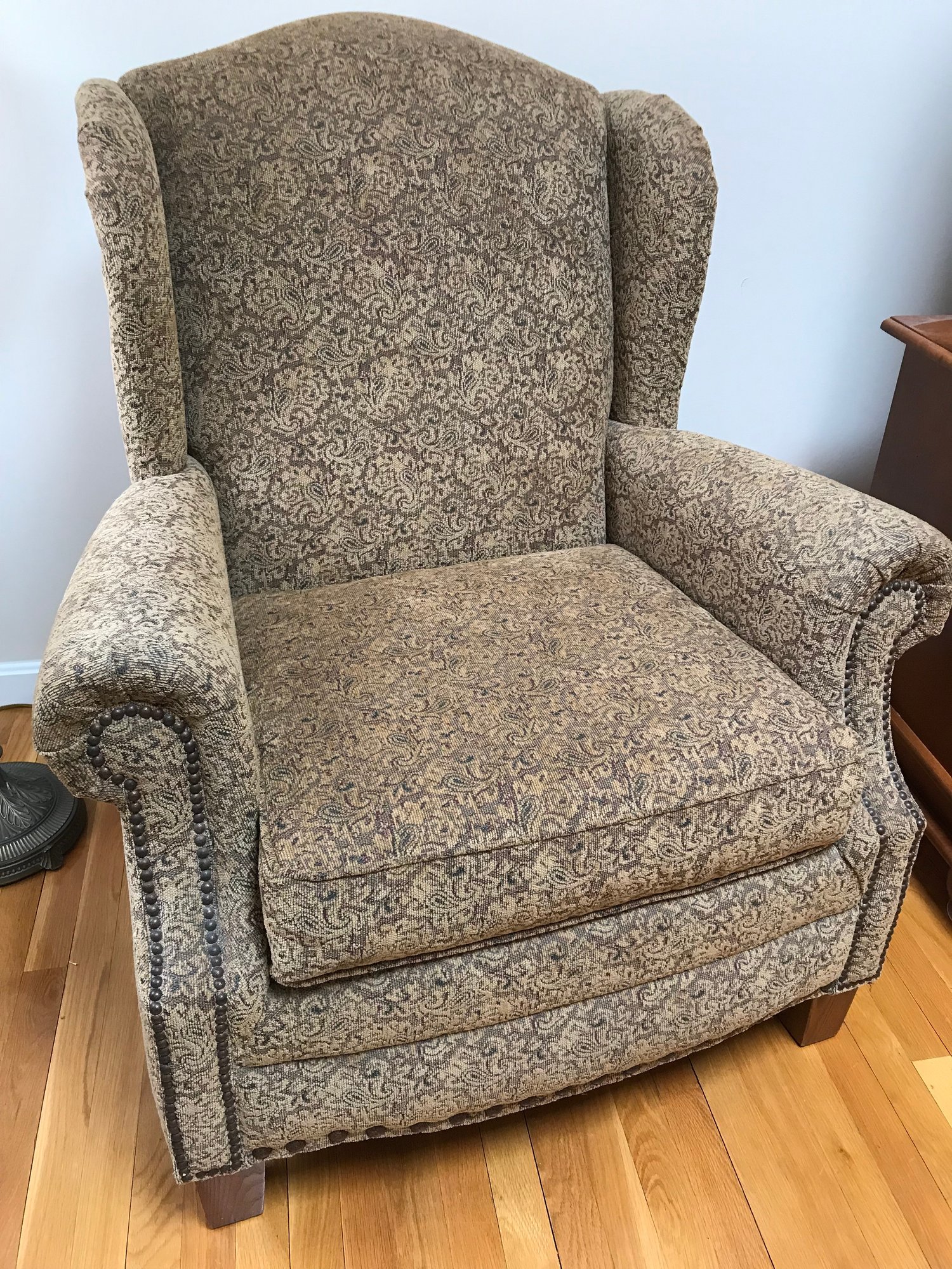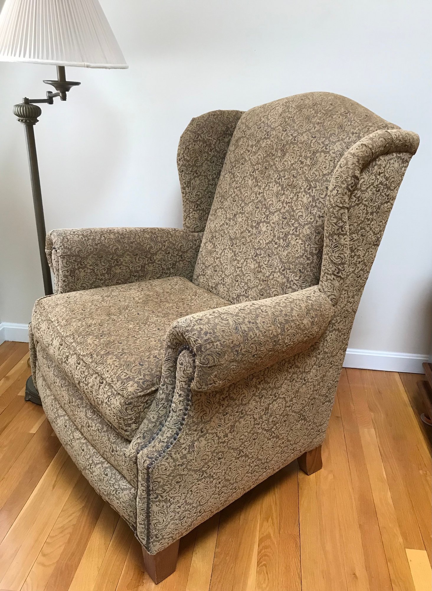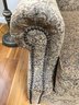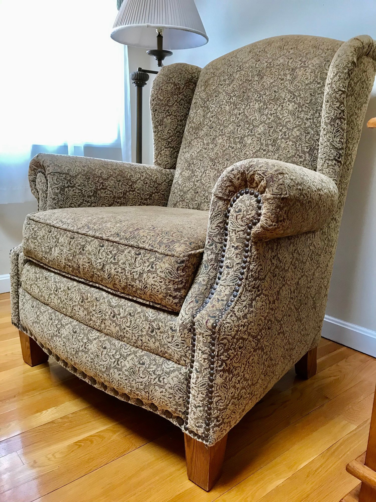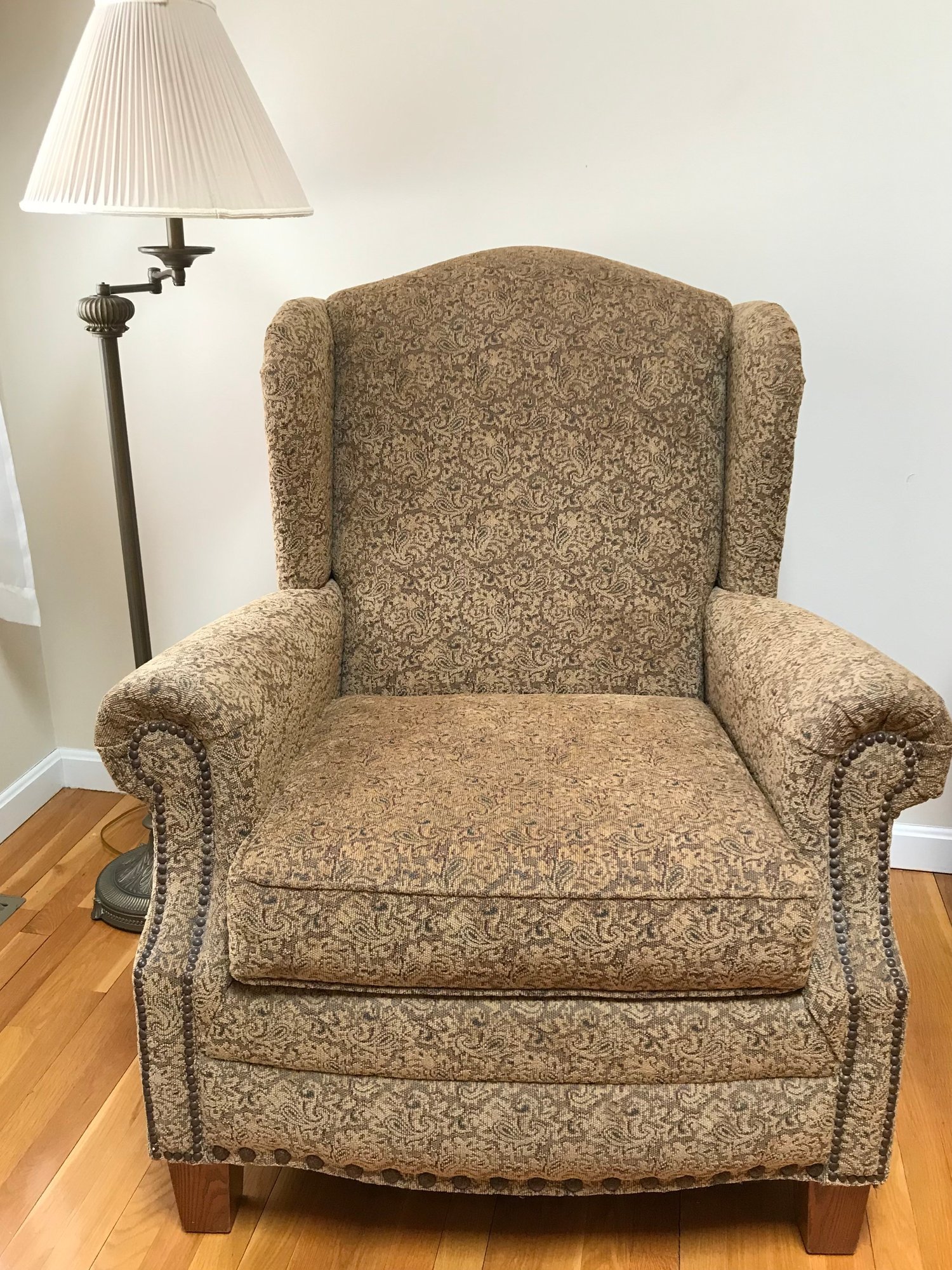 A handsome, high-quality wingback armchair by Bassett Furniture, featuring timeless traditional sBassett Furniture Paisley Upholstered Wingback Chairtyling and a sturdy silhouette. This piece is upholstered in a durable, textured paisley-patterned fabric in warm neutral tones of tan, gold, and chocolate.
