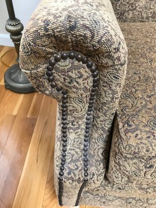 Tailored Details: Accented with antiqued brass-tone nailhead trim along the arm faces and lower base.