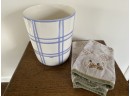 Light Blue and white ceramic wastebasket and two grey hand towels with pinecone embellishment. Wastebasket has scuff, as shown.