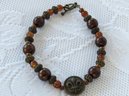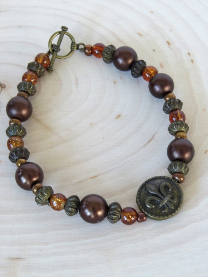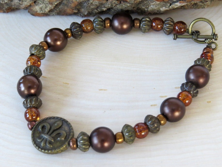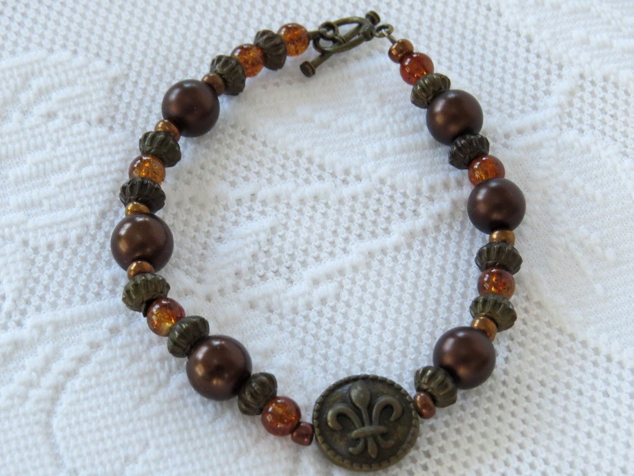 Warm tones of various size bronze, dark copper and topaz beads complement the center Fluer de Lis bead for a unique design. Measures 8 1/2" long including the toggle clasp.