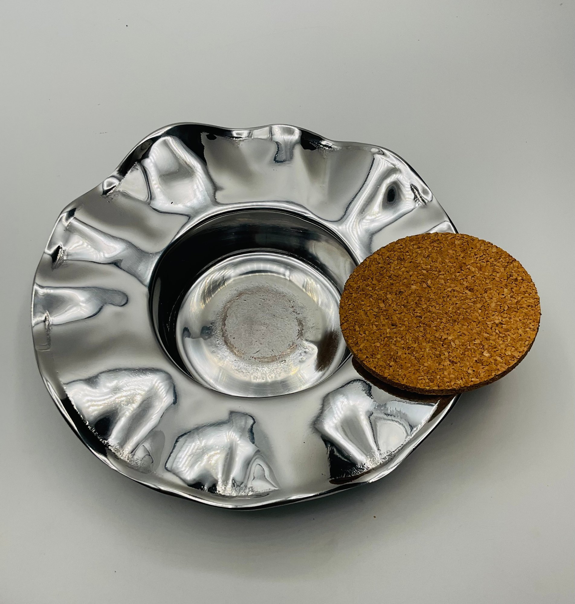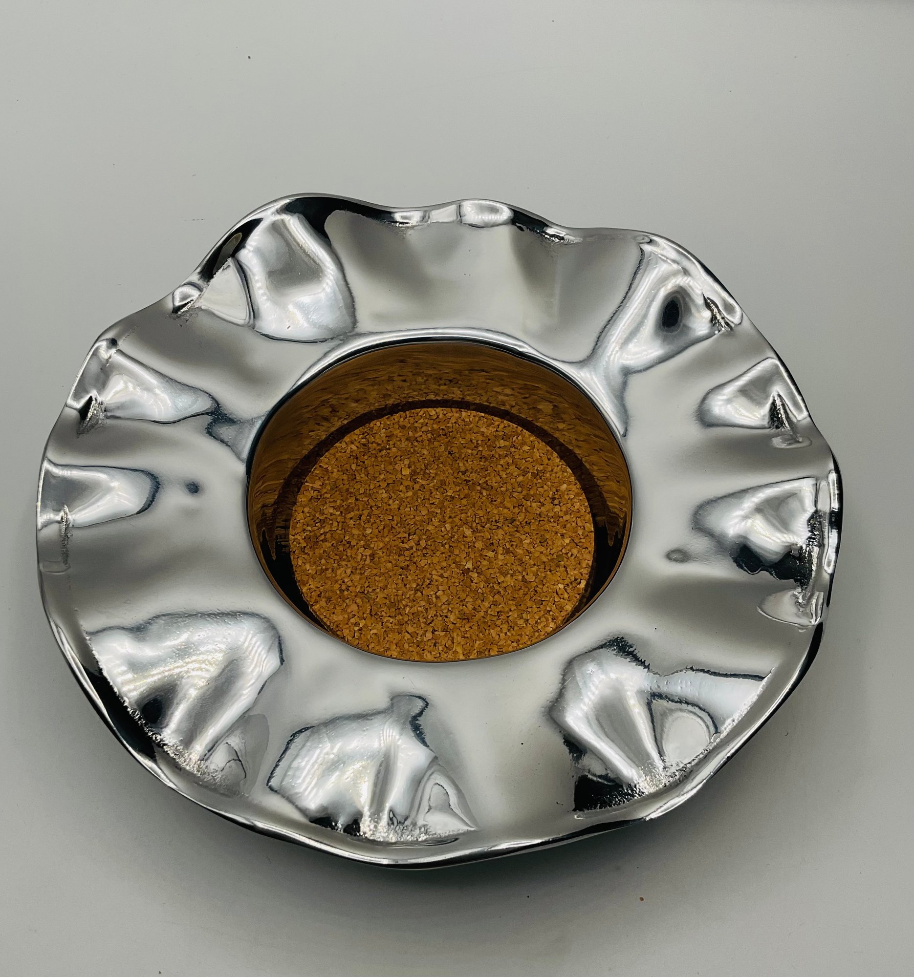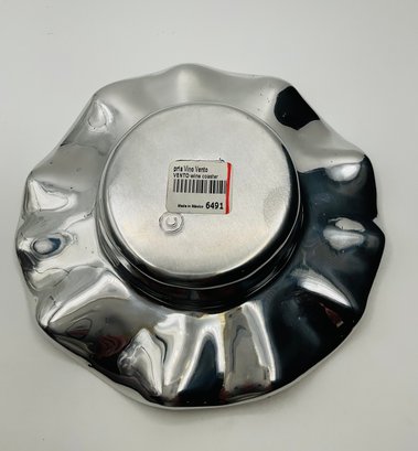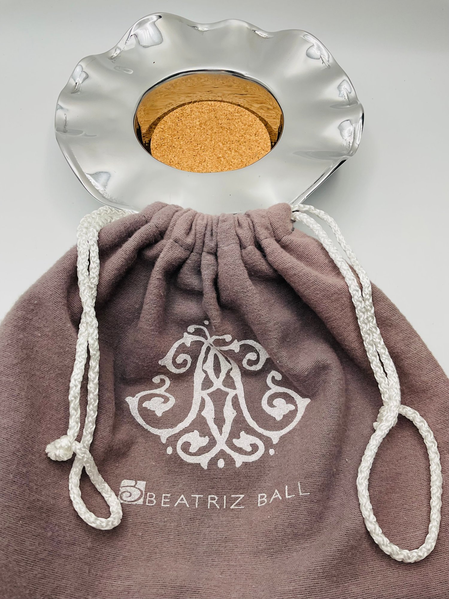 This elegant Beatriz Ball VENTO wine coaster features the collection’s signature organic, wavy rim and a high-polish, mirror-like finish. Hand-crafted from a sand-cast aluminum alloy, it is designed to hold a standard wine bottle while the integrated removable cork insert catches drips and protects your table surfaces.