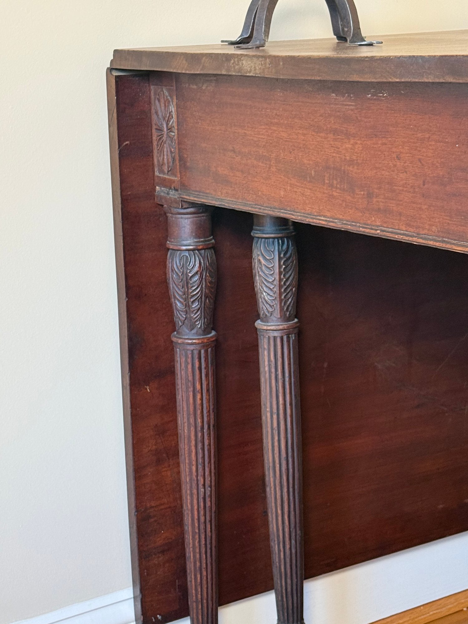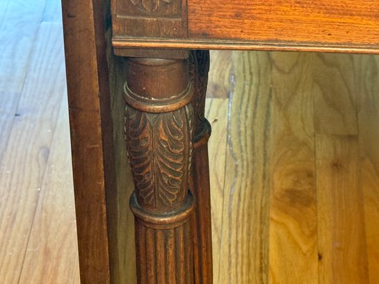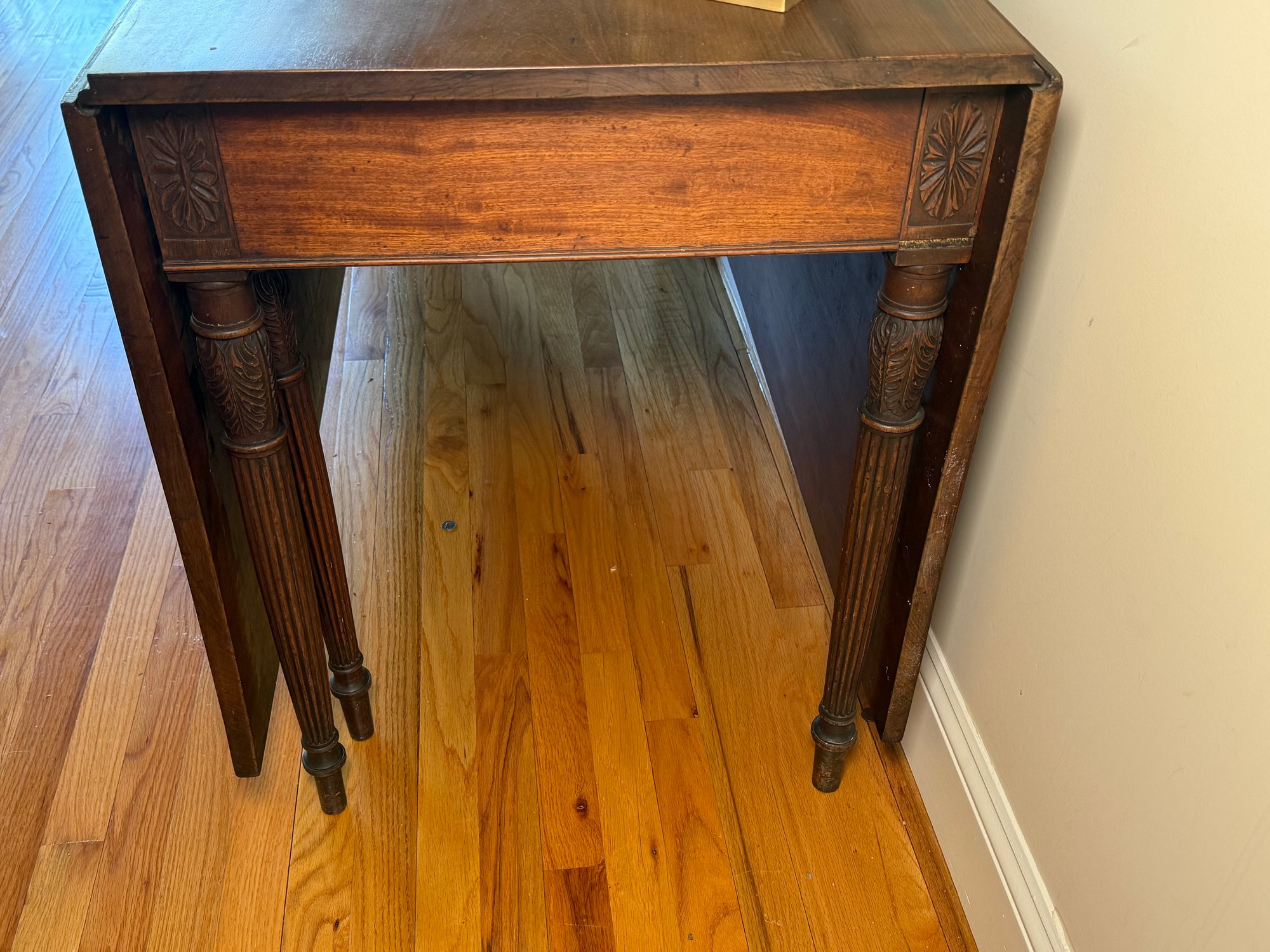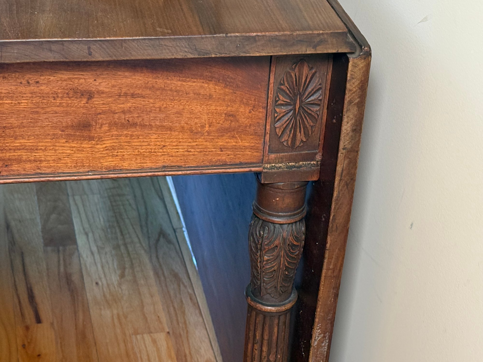 This drop leaf table has beautiful carved wood detail, and amazing wood grain. You can use it as an entry table in its smallest position or extend it by putting both leaves up with the gate legs.