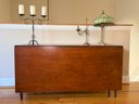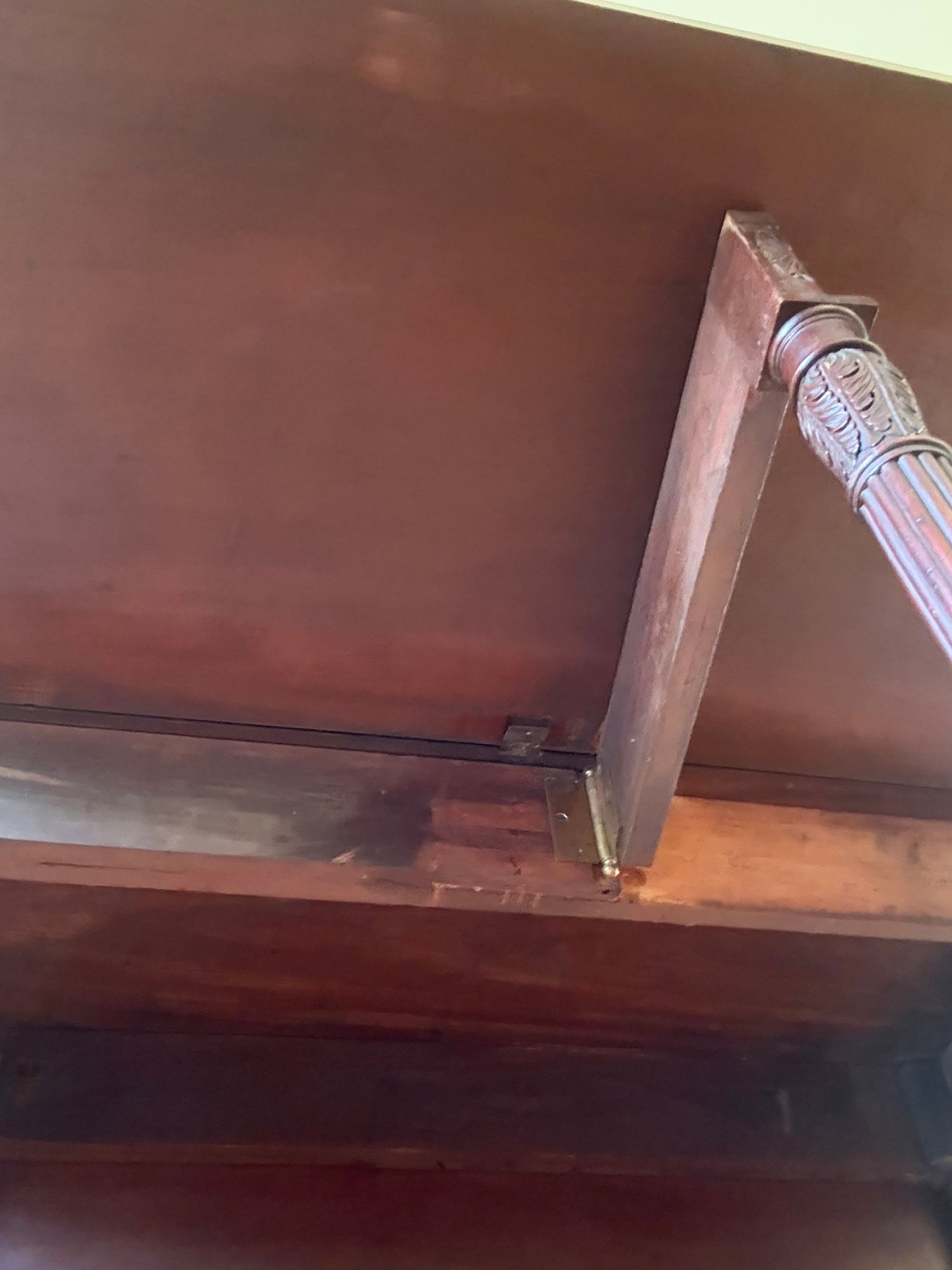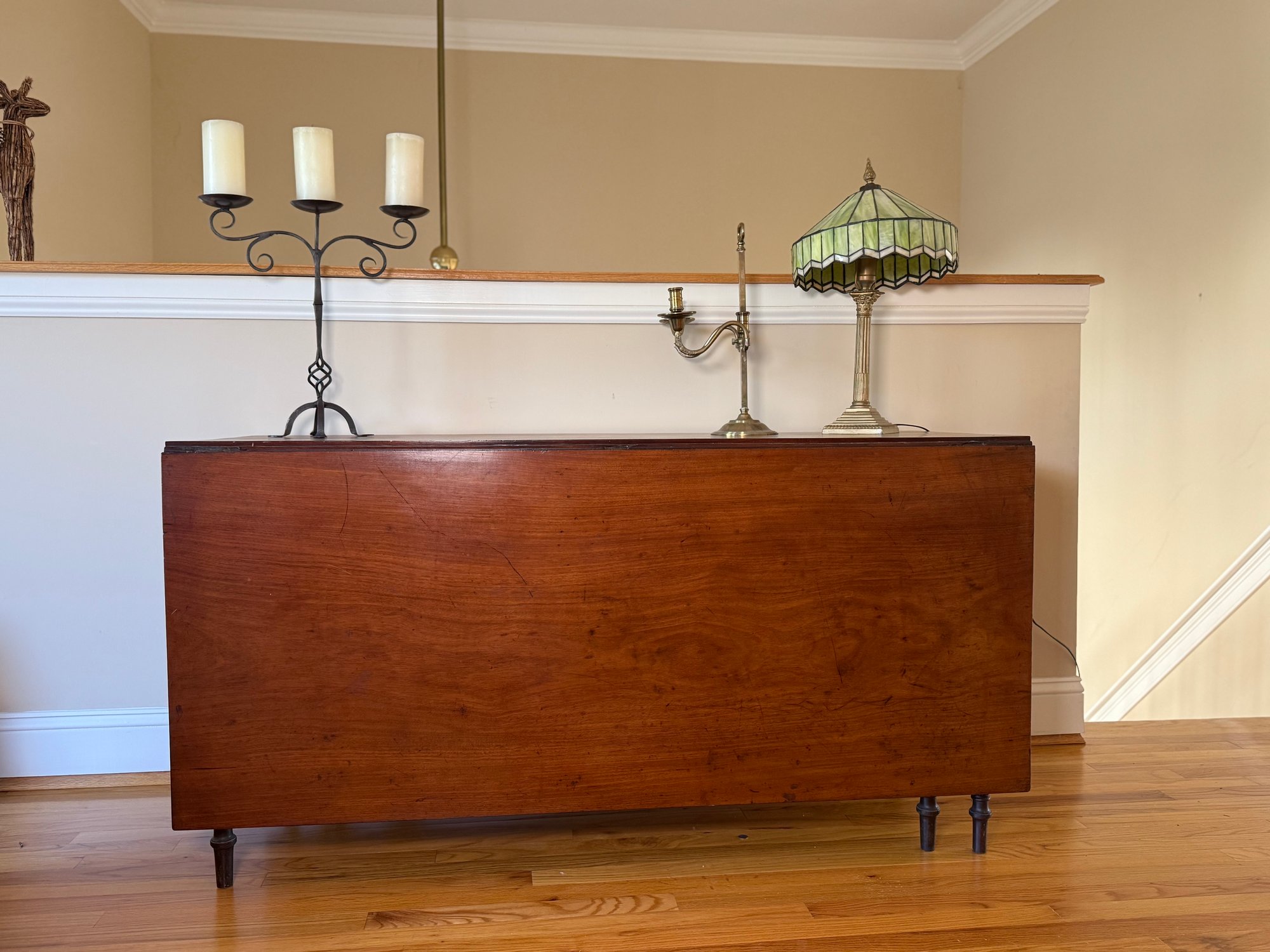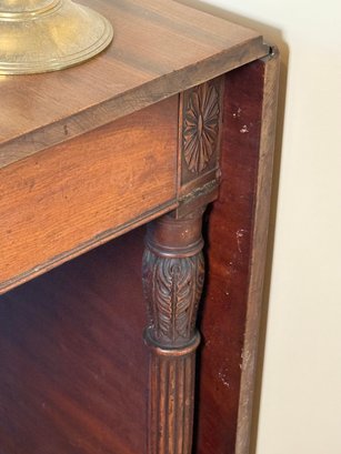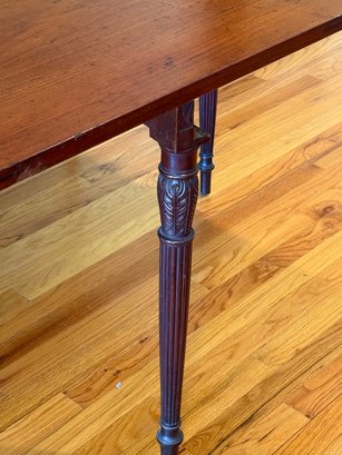 This drop leaf table has beautiful carved wood detail, and amazing wood grain. You can use it as an entry table in its smallest position or extend it by putting both leaves up with the gate legs.