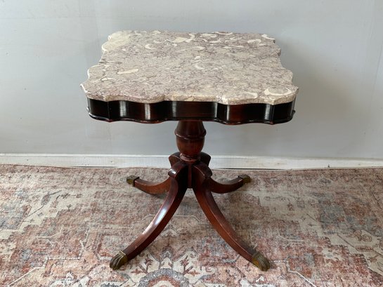 A beautiful marble top table circa 1920s-30s, reproduction of mid 1800s table. It has a beautiful wooden frame and base with brass claw feet. The marble sits on frame but could use more adhesive to secure better. Some normal signs of wear to base but overall looks good. There is a matching table in prior lot.