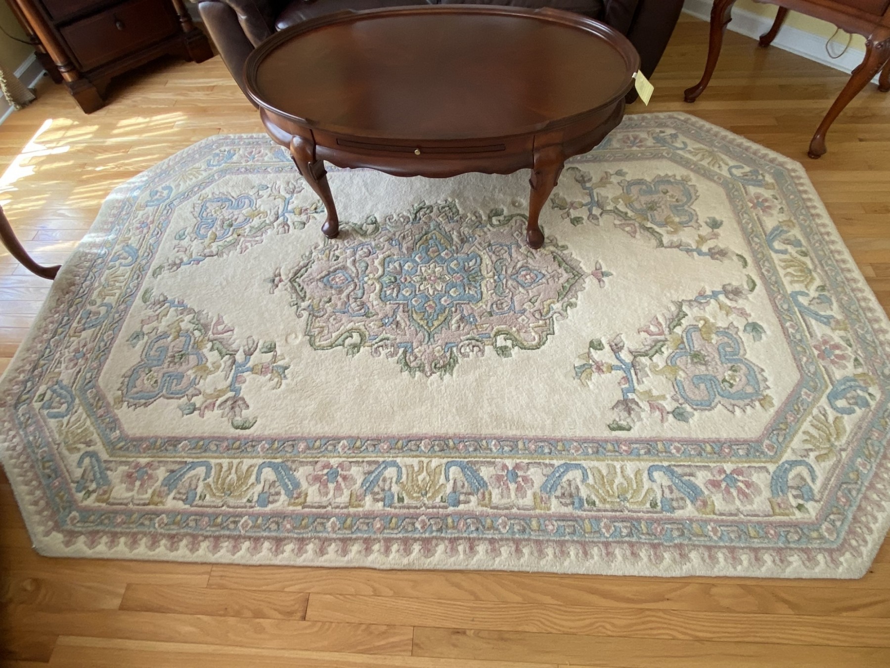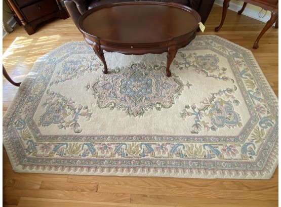 Nice thick rug in pastels. Please note the corner cut. blues, pink, green gold 8'9" x 5'9"