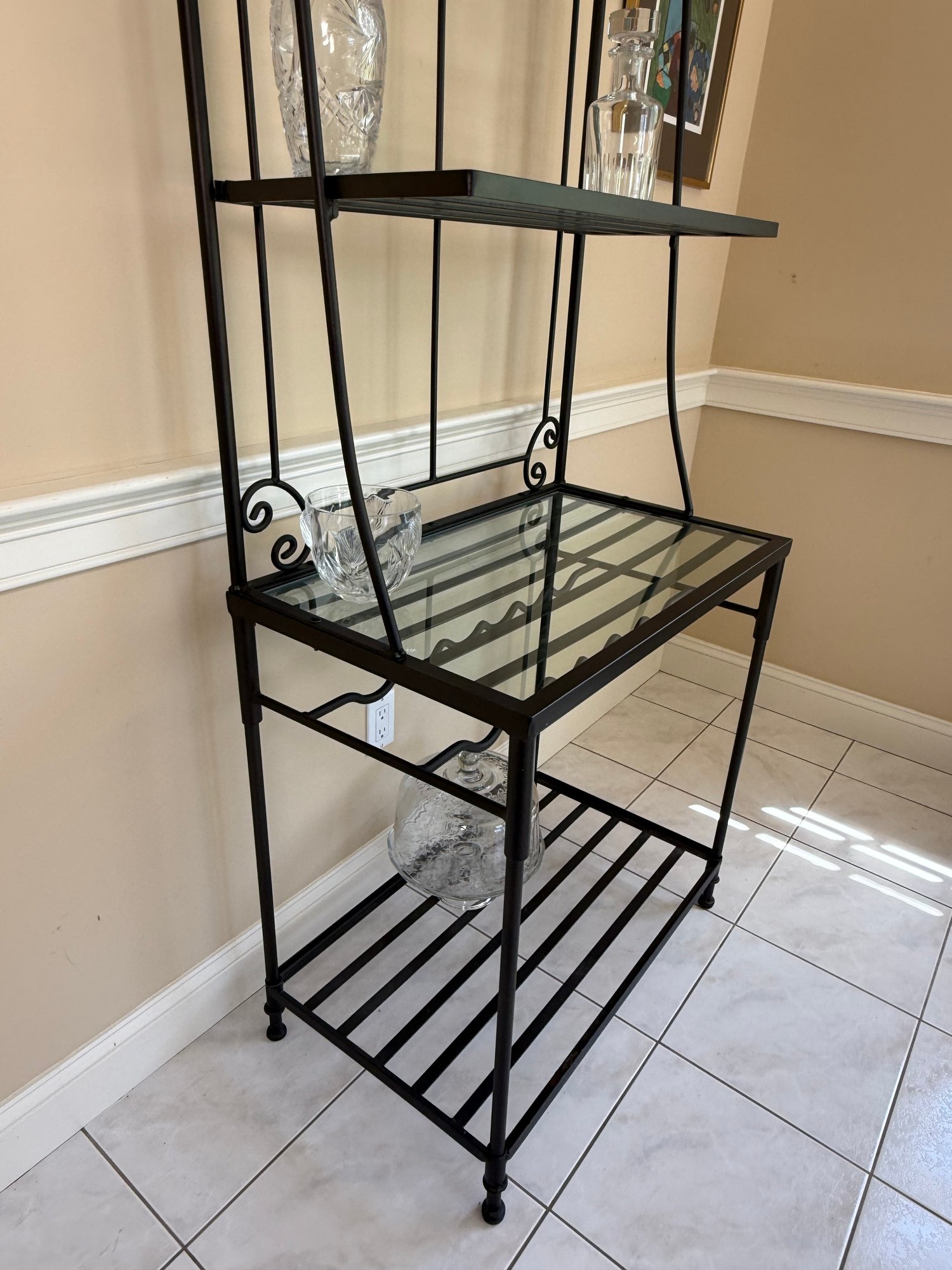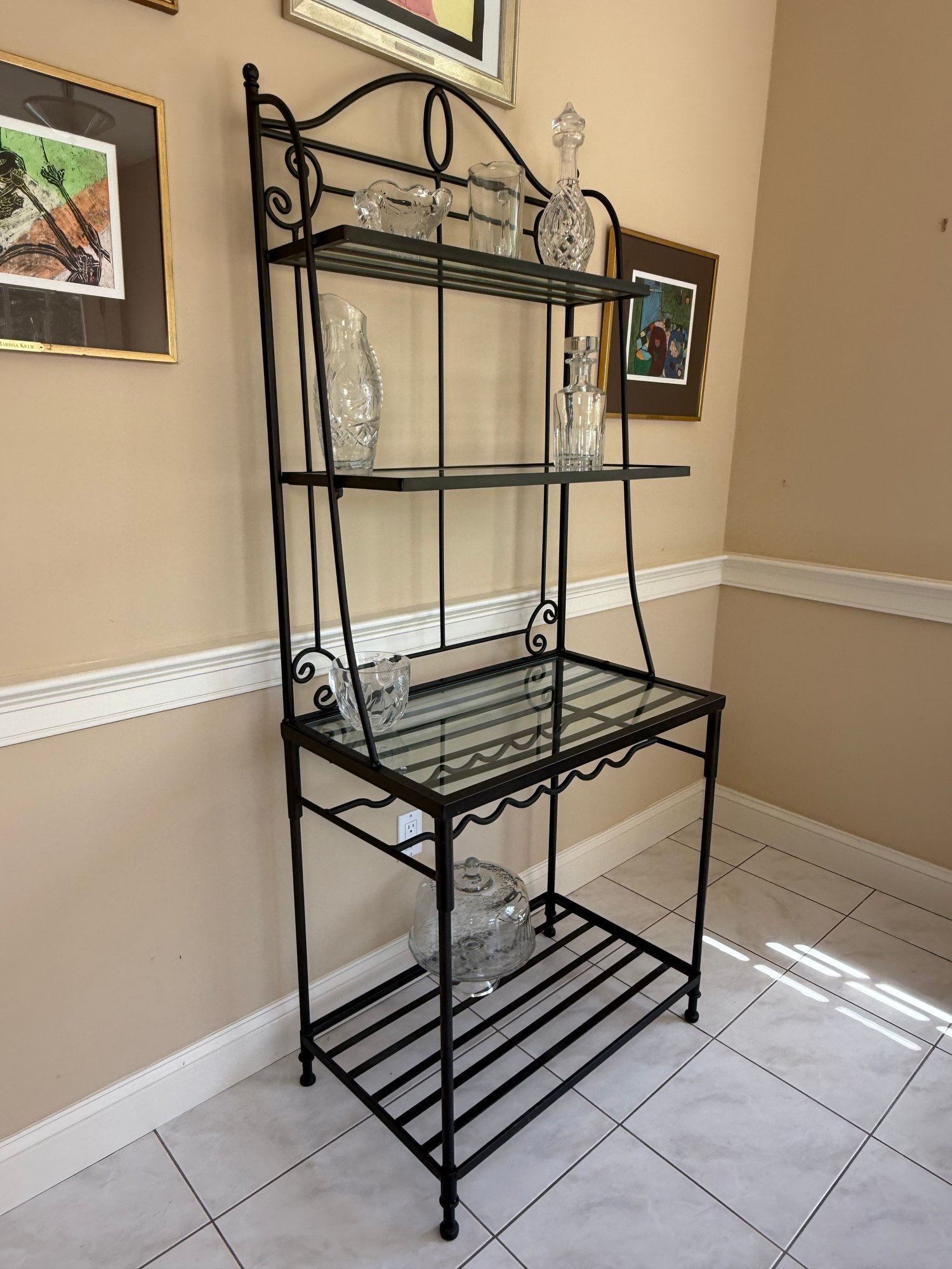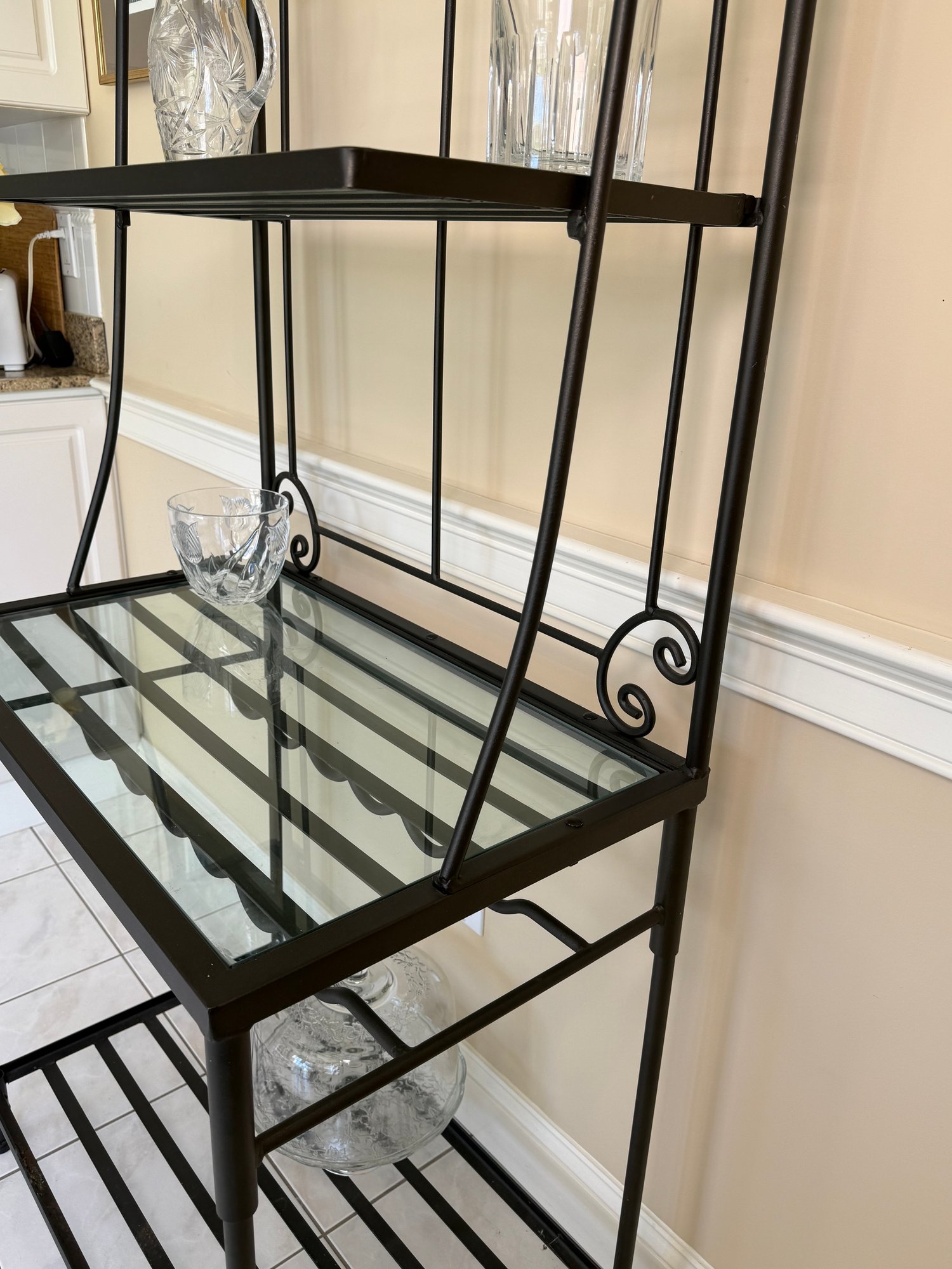 This beautiful quality made black metal bakers rack has wonderful character to it. It has four shelves, for plenty of storage space.