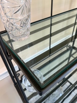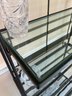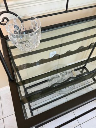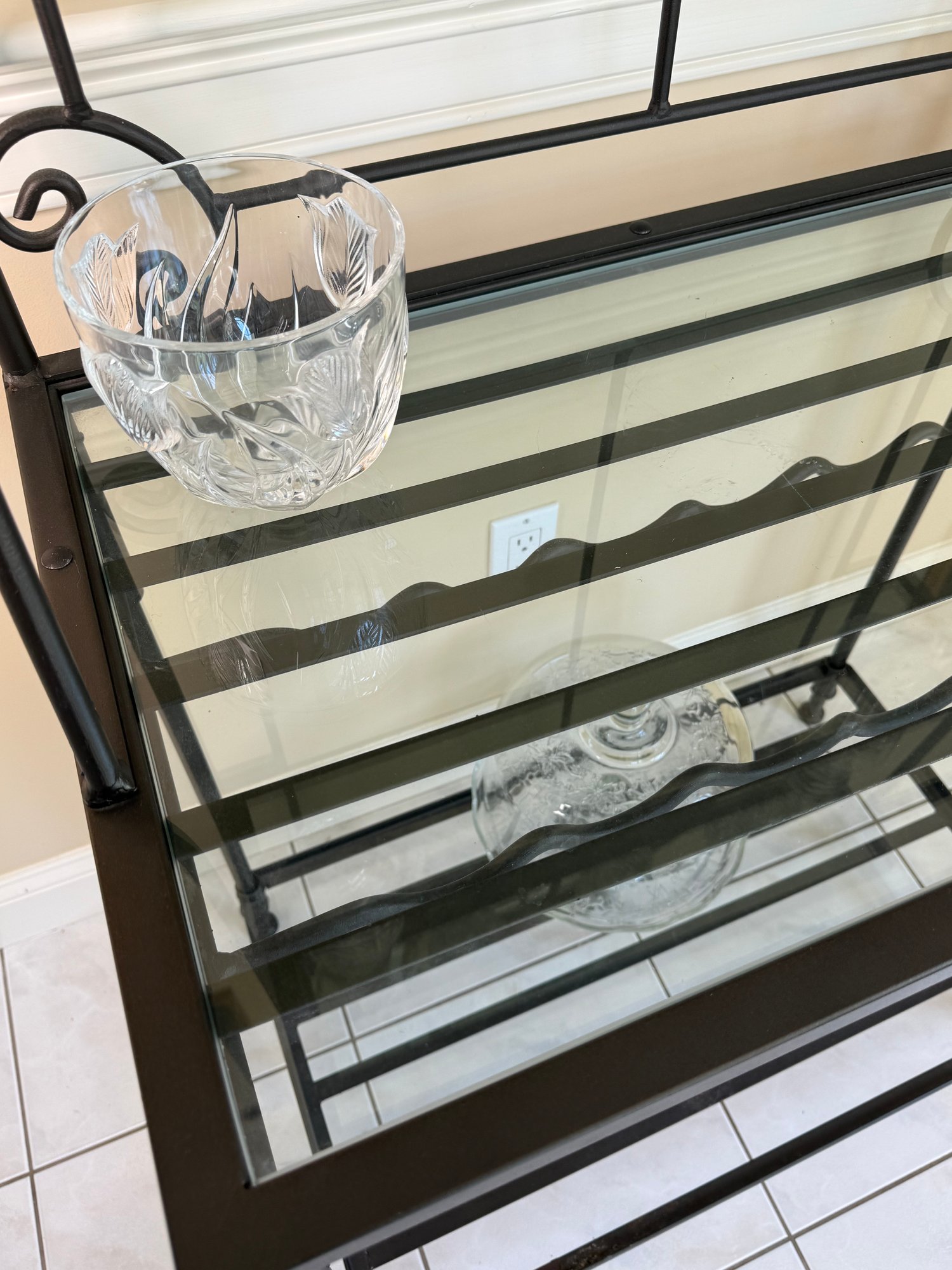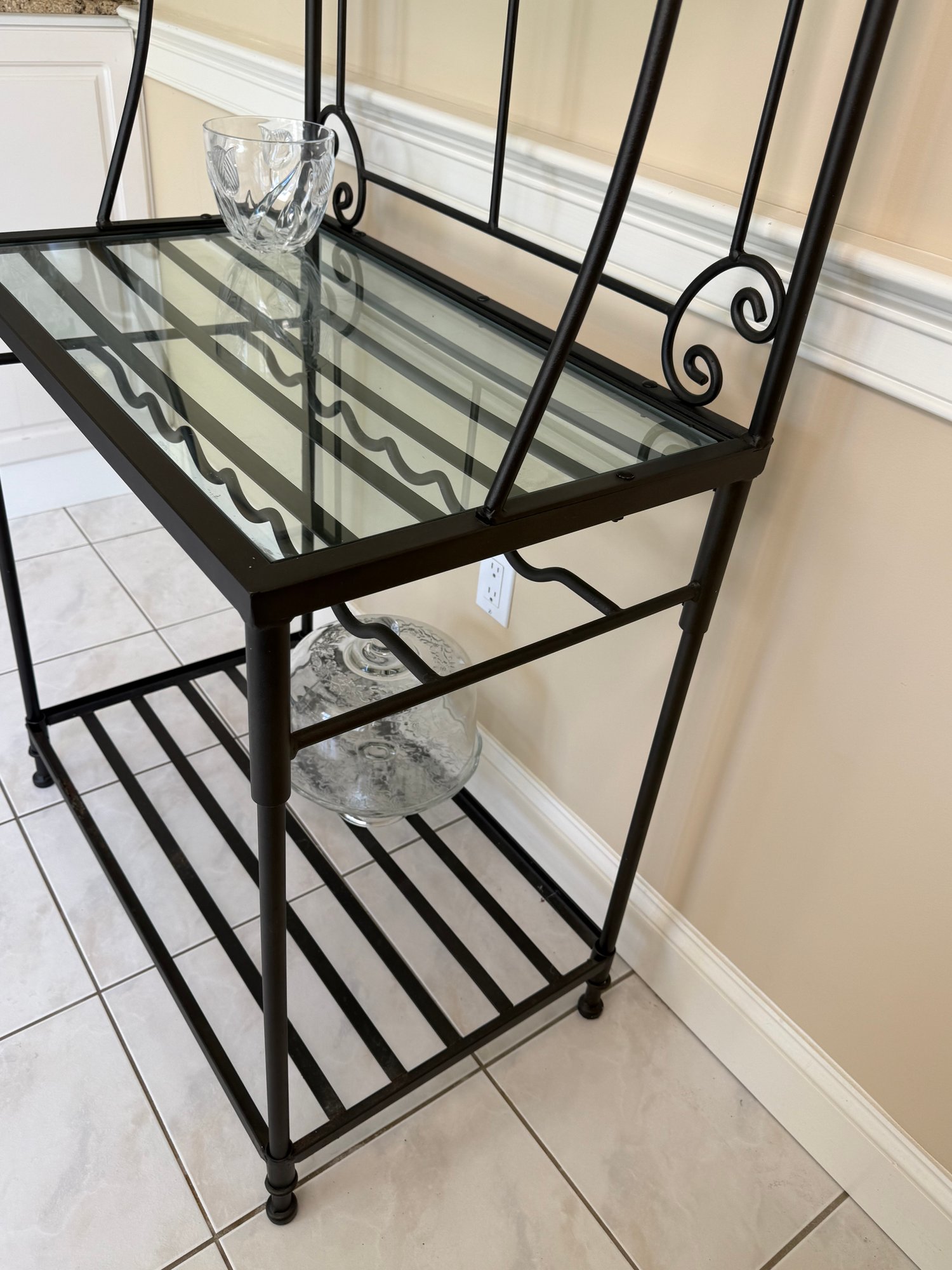 The bottom shelf does not have glass on it. There is an Imperfection to corner of glass on one of the shelves as well. Overall a very nice quality made bakers rack.
