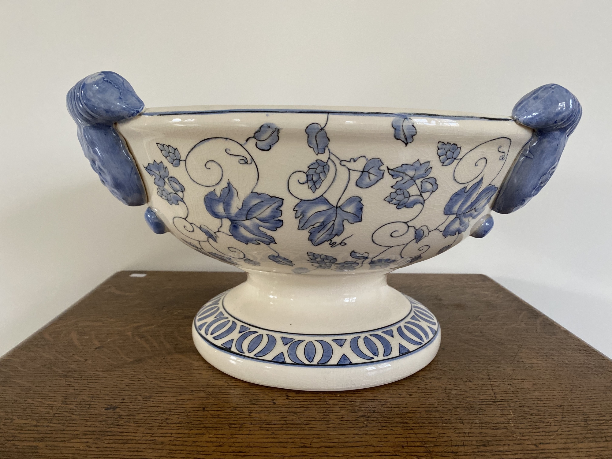Blue and white pattern with pedestal stand and three blue decorative handles. Perfect on countertop for fruit or veggies.