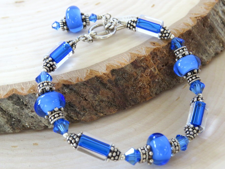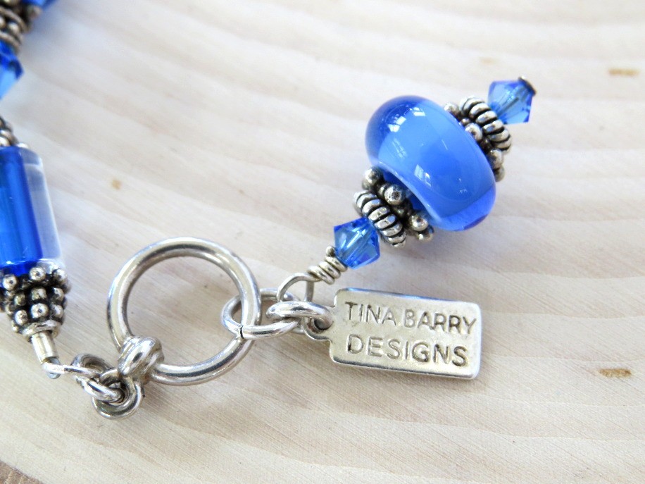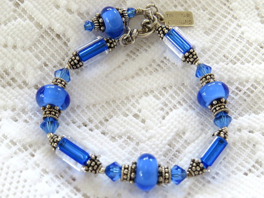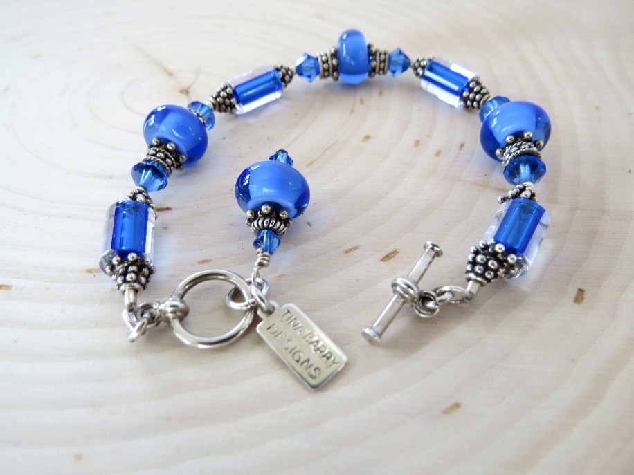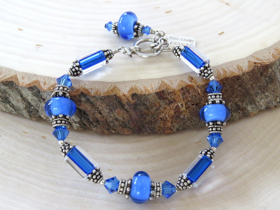 Beautiful piece made by Oregon Artist Tina Barry of Tina Barry Designs. She is known for using hand blown glass and sterling silver findings. The bracelet has cane glass tubes, rondelles and Swarowski AB (Aurora Borealis) crystals that are coated with an iridescent coating that shimmers when it catches the light. Measures 7 1/2" long with a toggle clasp and a metal designer tag.
