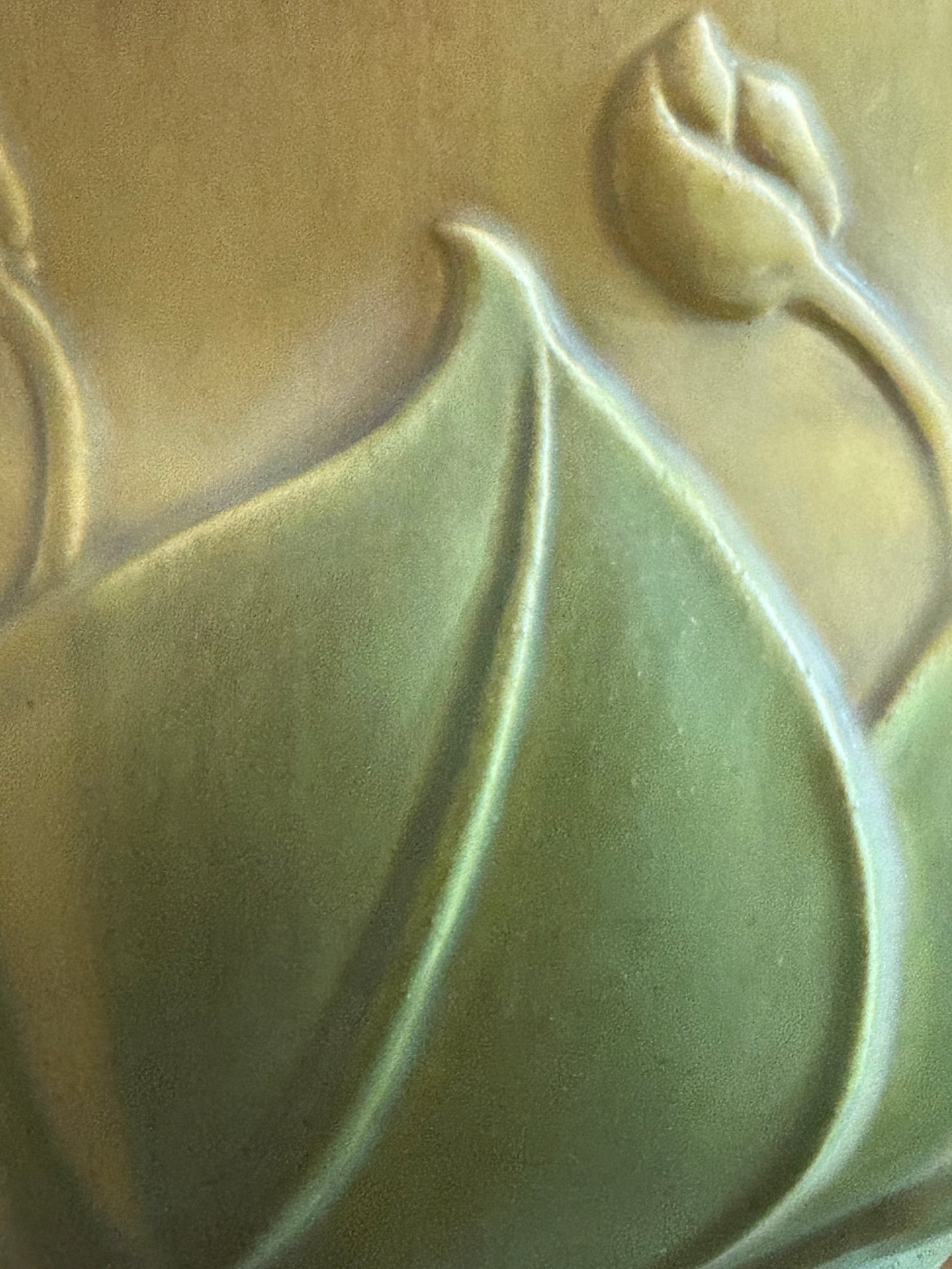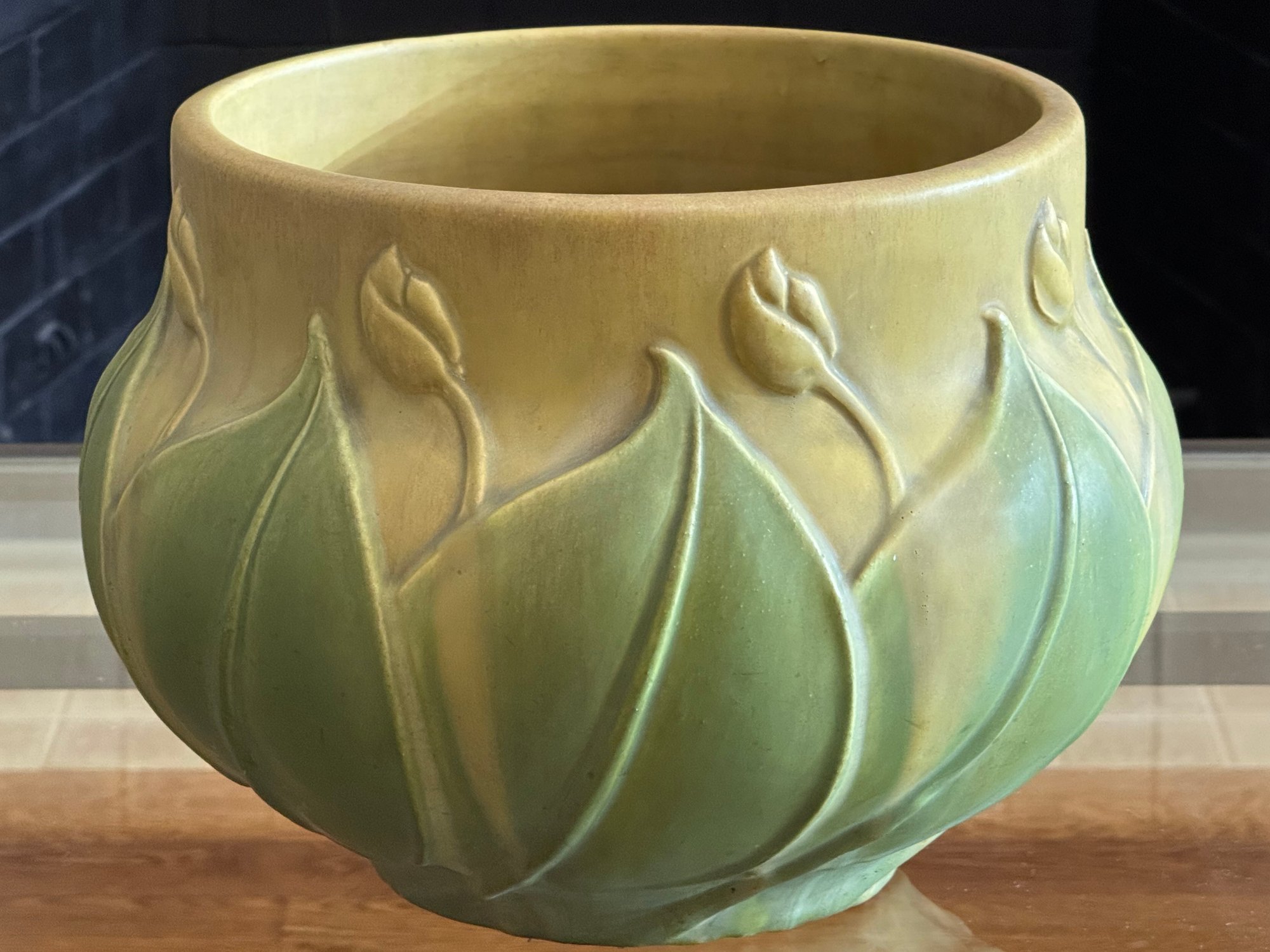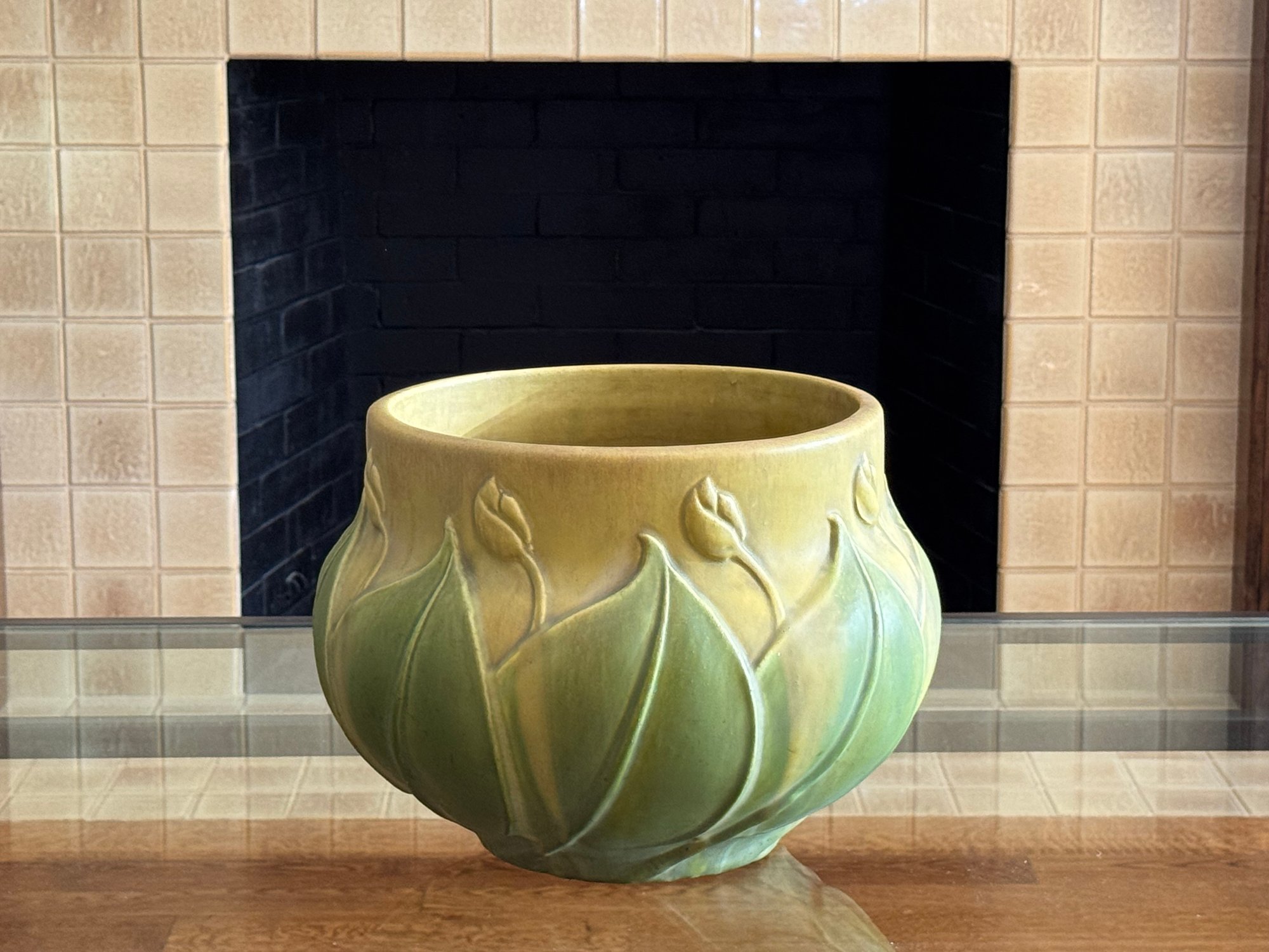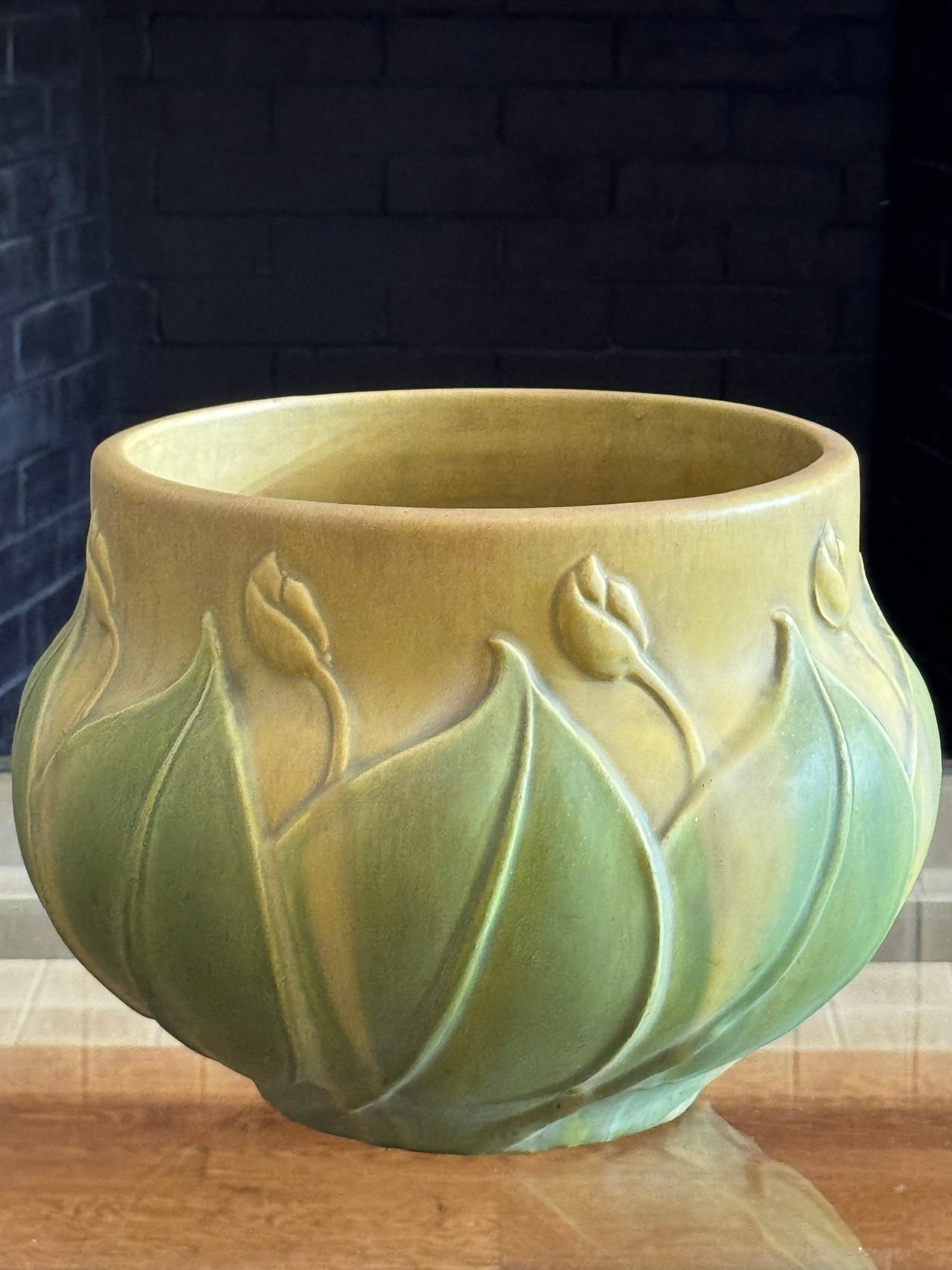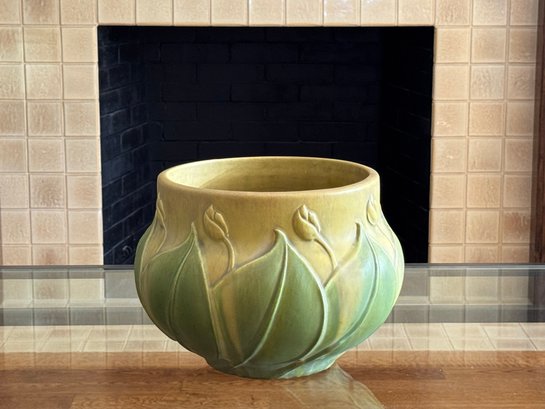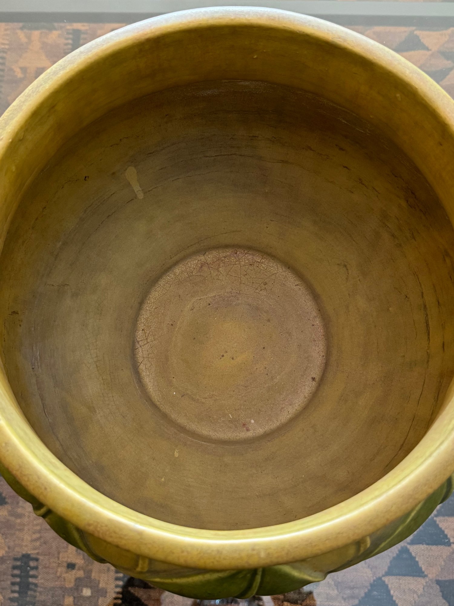 C 1910 In gorgeous rich sage and ochre tones in a lush matt finish, Size 14 Diameter x 10.5 D top opening x 9.5