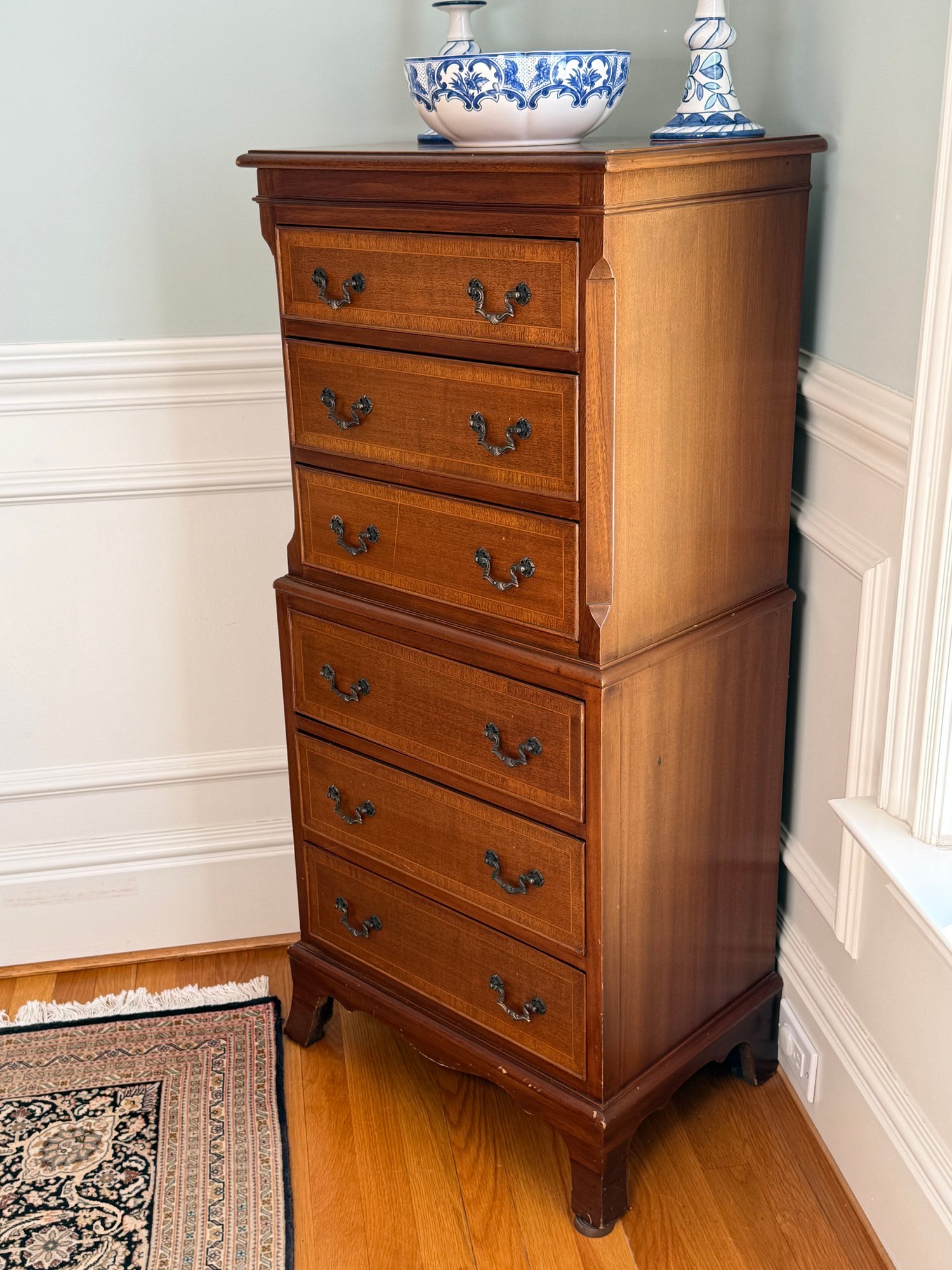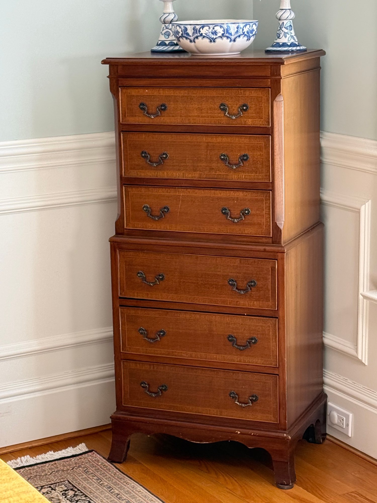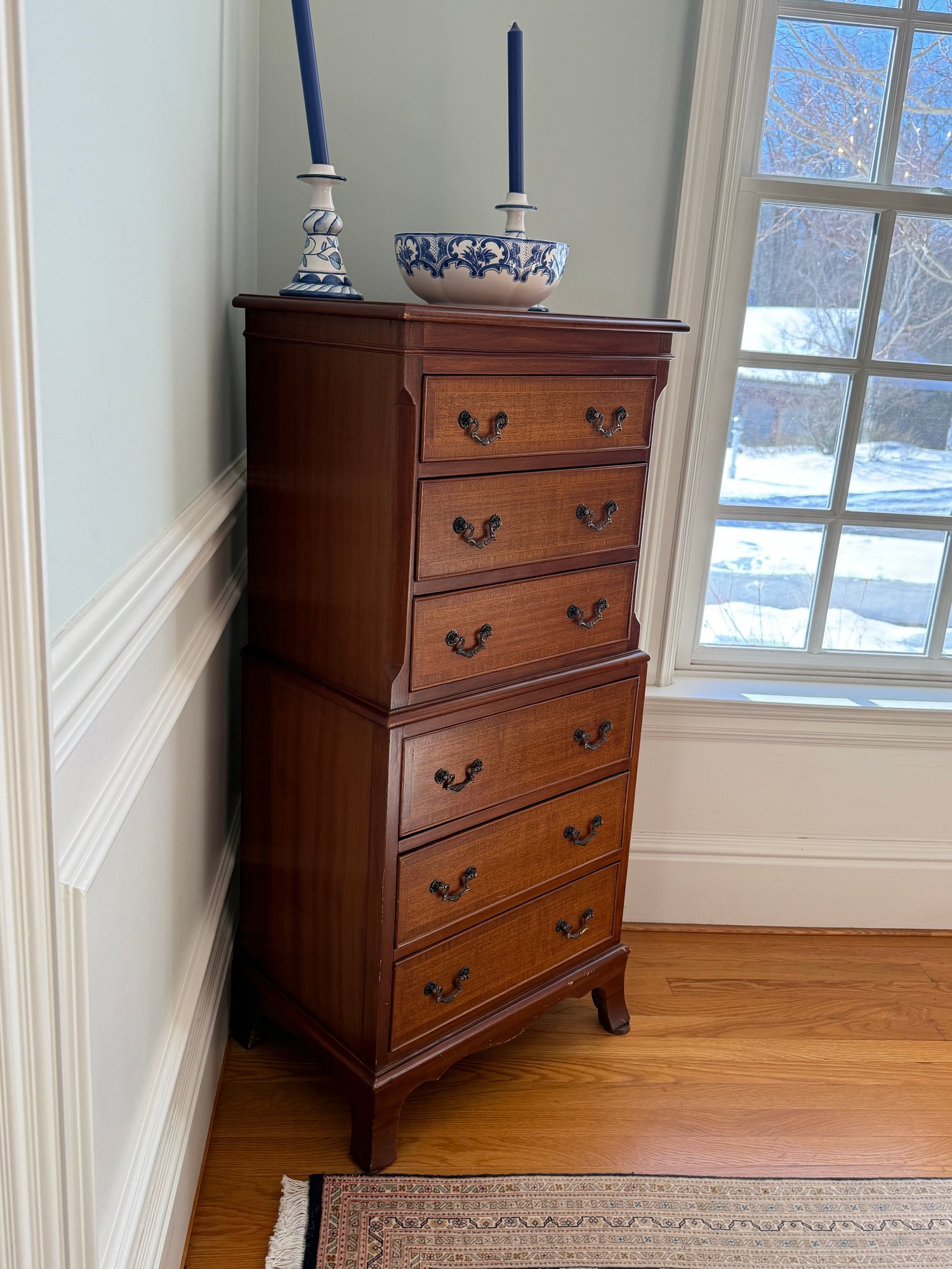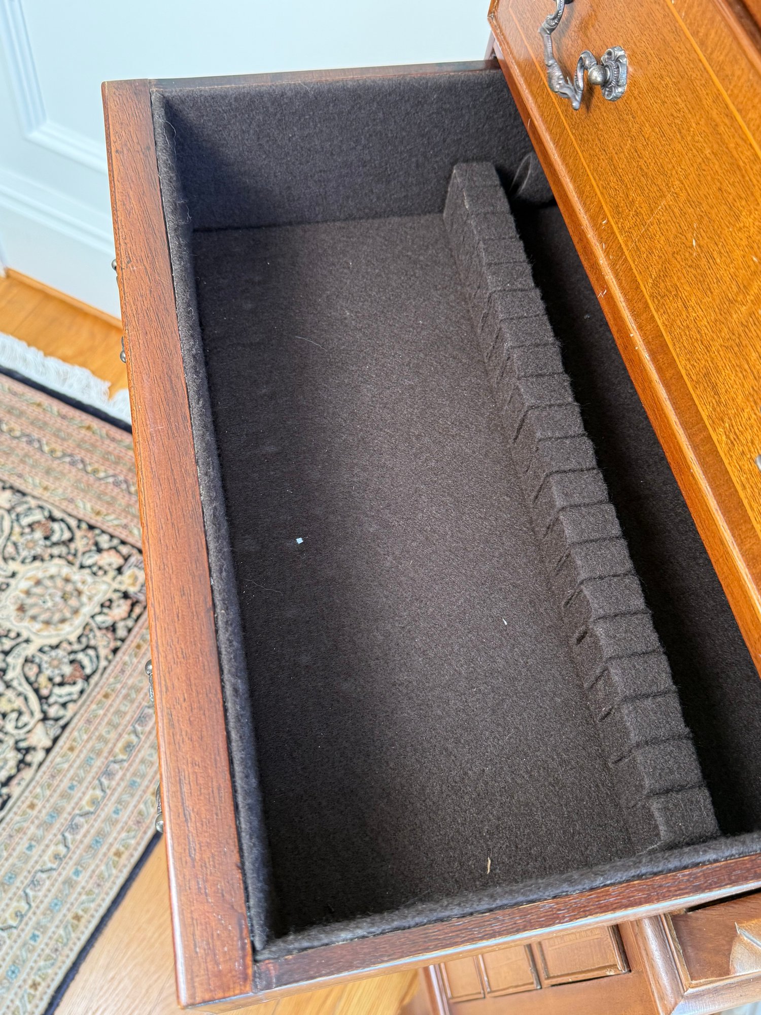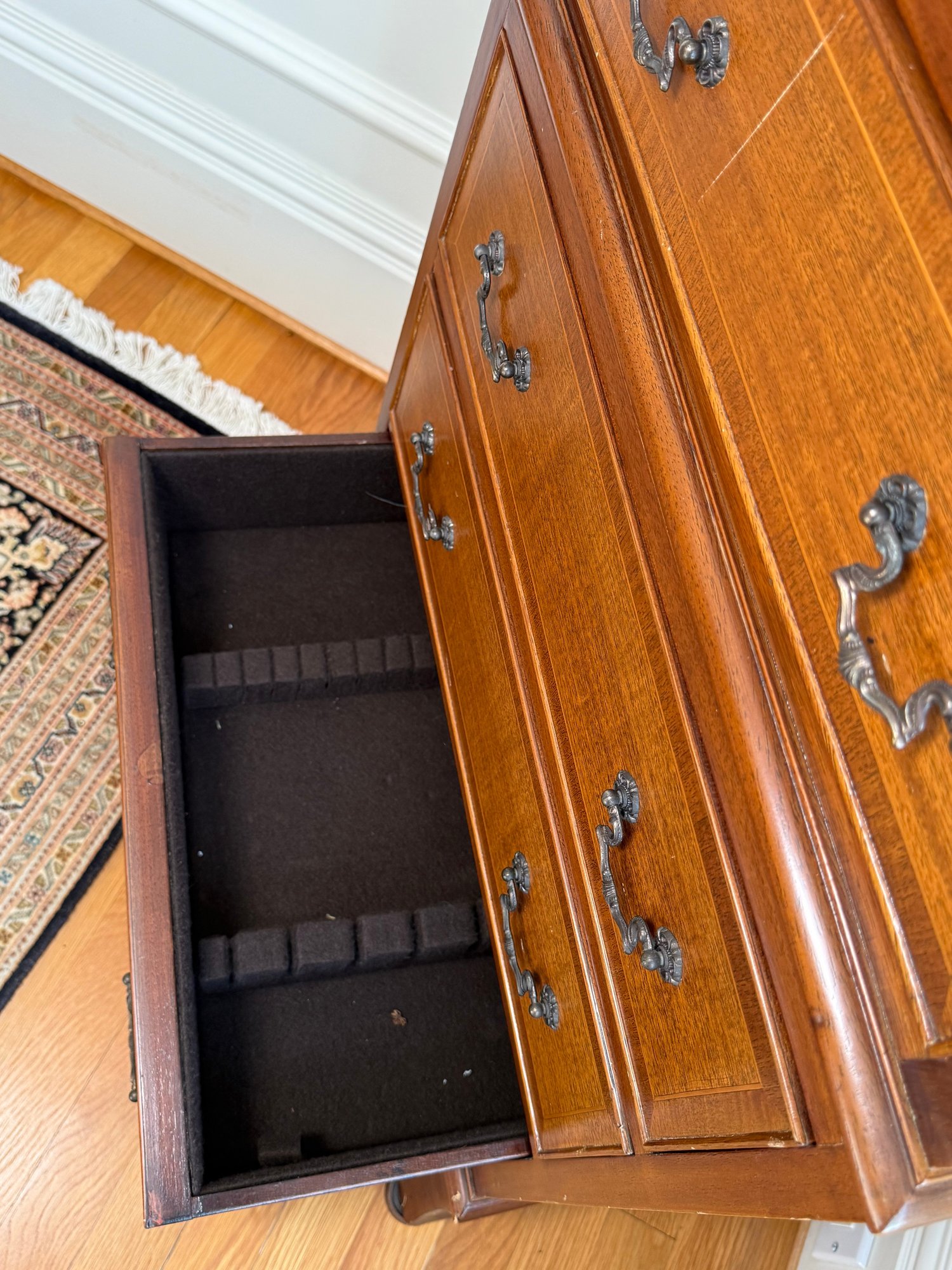 A classic tall chest rendered in a warm cherry finish, featuring elegant Queen Anne styling with gently curved bracket feet and traditional brass bail pulls. The upper and lower drawers open to reveal dark felt-lined interiors with built-in dividers. The dividers are meant to store flatware but the actual divider portion can be removed if you don’t want them. The felt around the sides of each drawer have been adhered in so they do stay (see last pic for example). You can repurpose this as a chest of drawers. Please note, the only divider that does not remove is the fourth drawer down. (See pic of drawer with polish in it for reference)