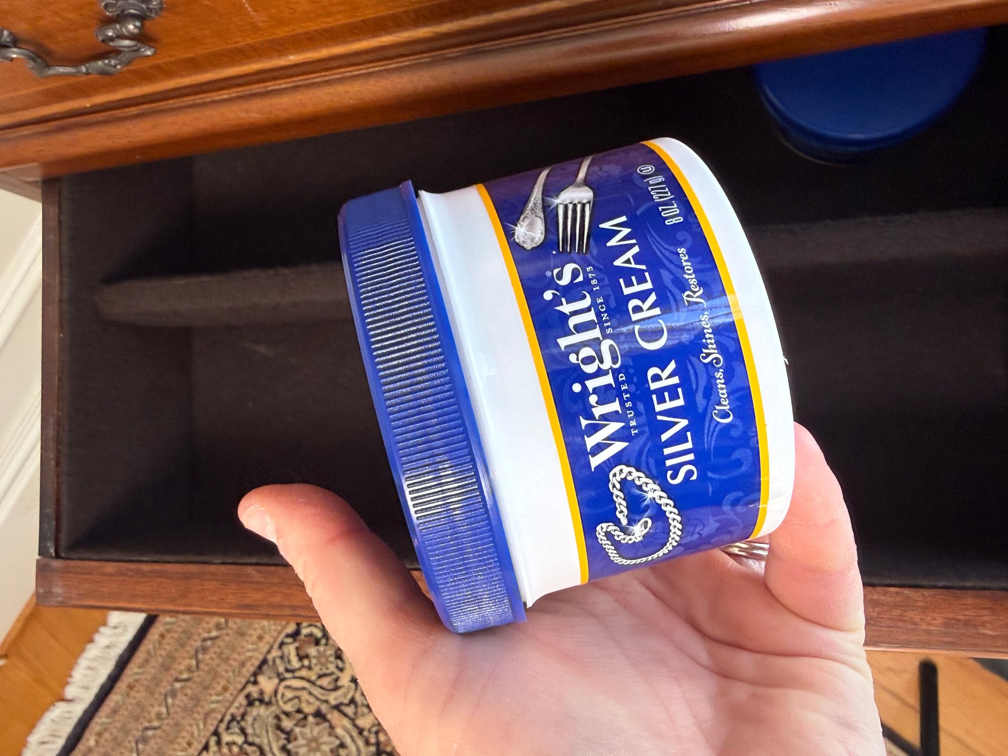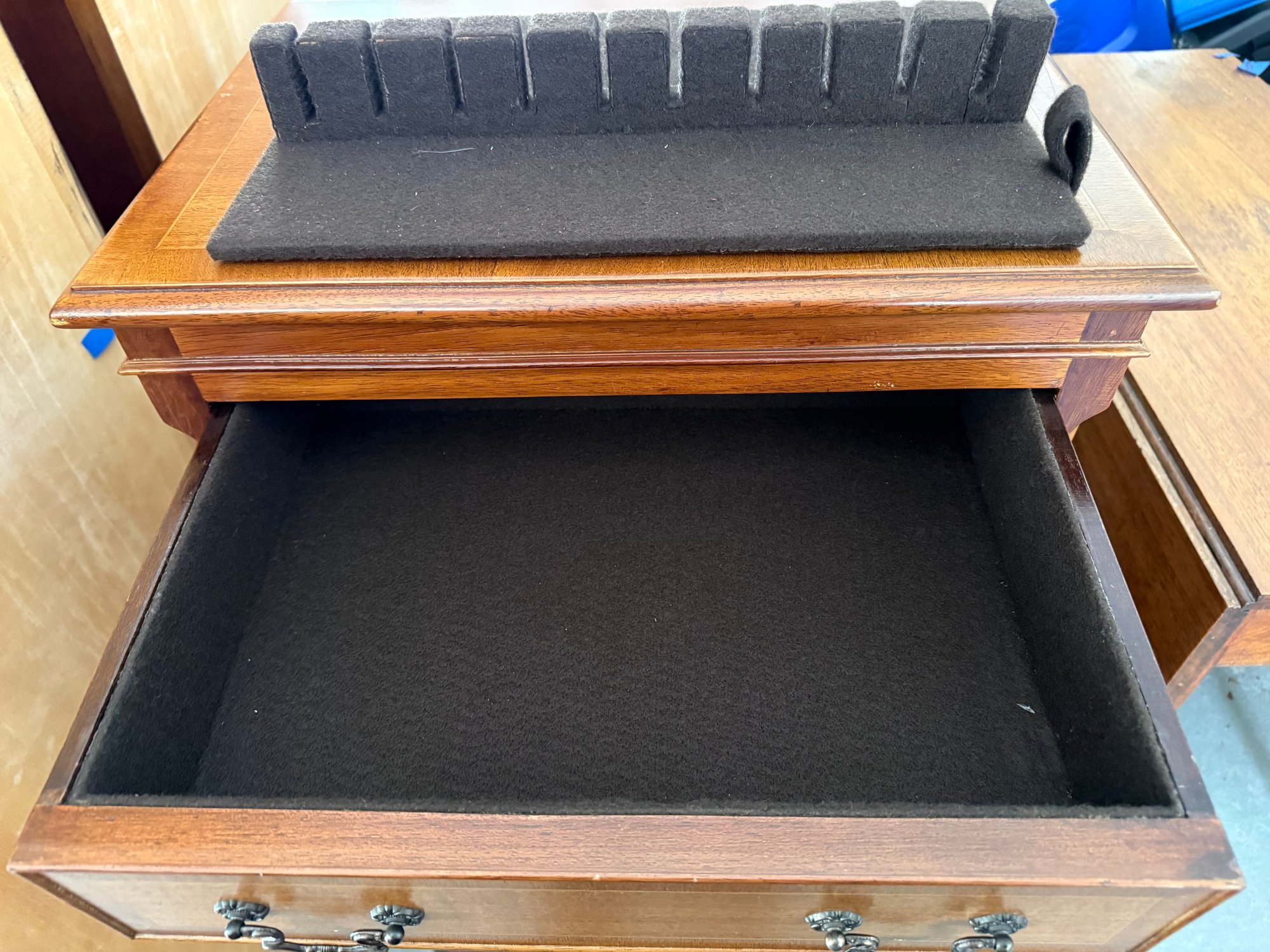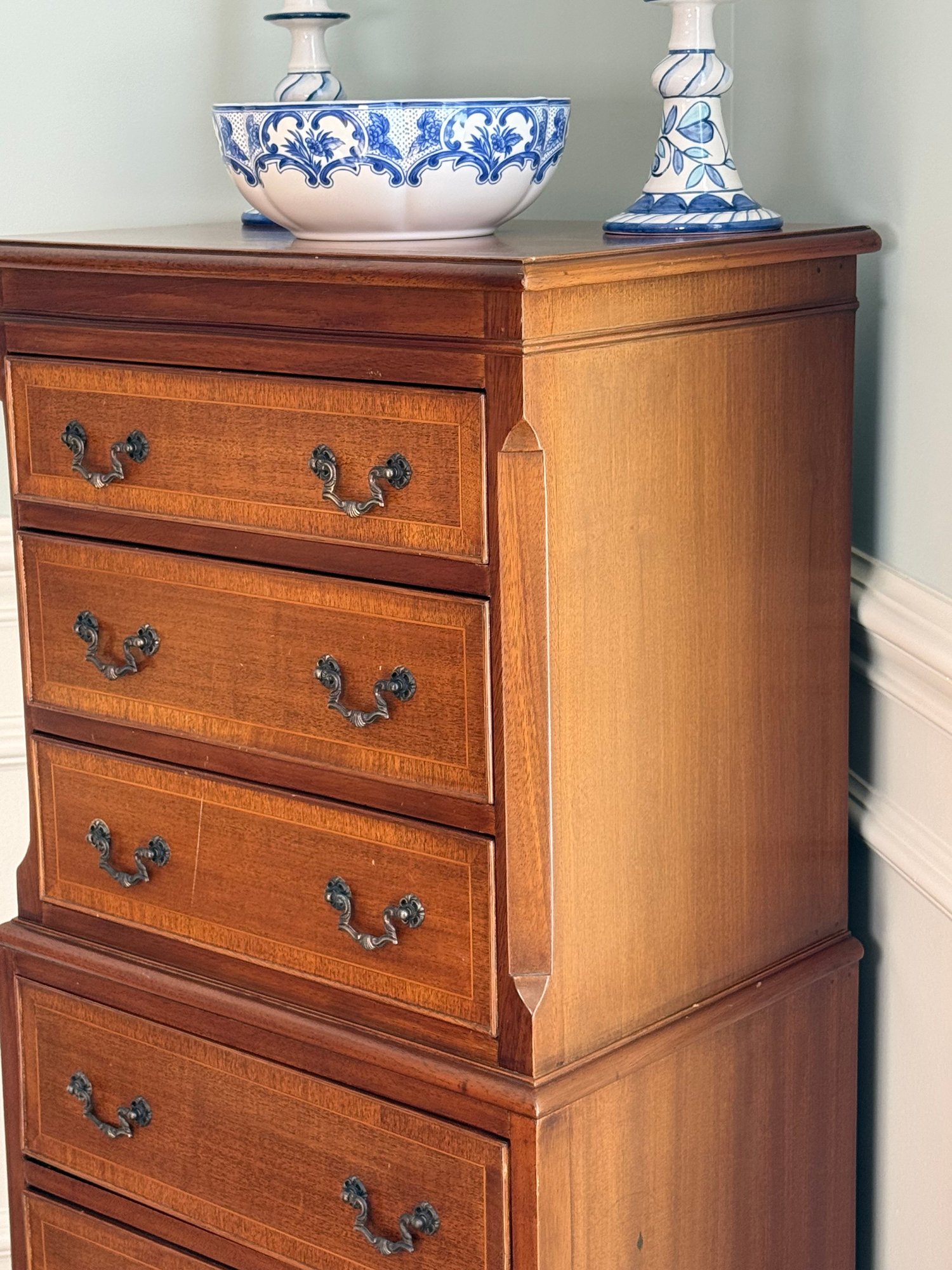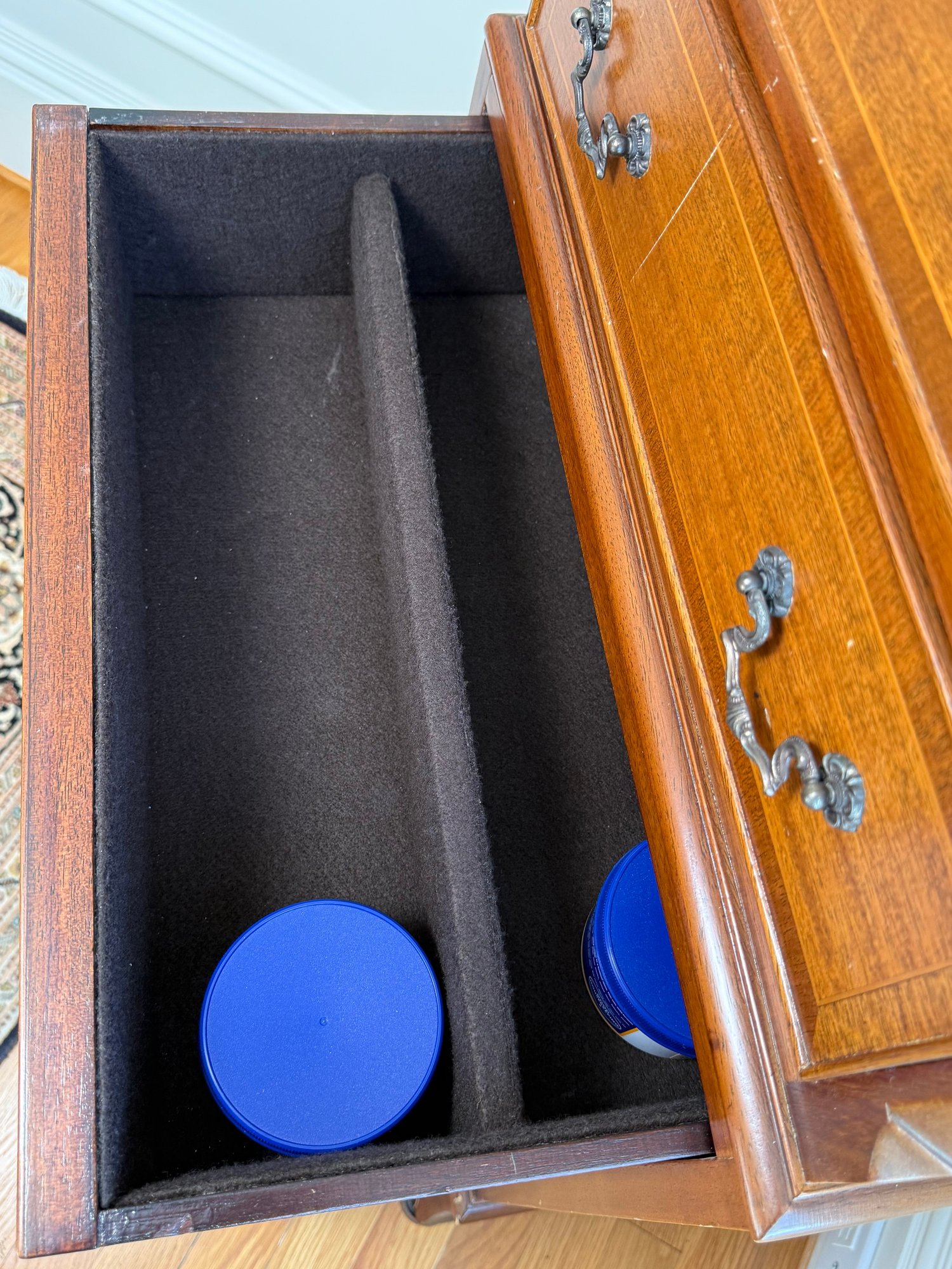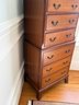 A classic tall chest rendered in a warm cherry finish, featuring elegant Queen Anne styling with gently curved bracket feet and traditional brass bail pulls. The upper and lower drawers open to reveal dark felt-lined interiors with built-in dividers. The dividers are meant to store flatware but the actual divider portion can be removed if you don’t want them. The felt around the sides of each drawer have been adhered in so they do stay (see last pic for example). You can repurpose this as a chest of drawers. Please note, the only divider that does not remove is the fourth drawer down. (See pic of drawer with polish in it for reference)
