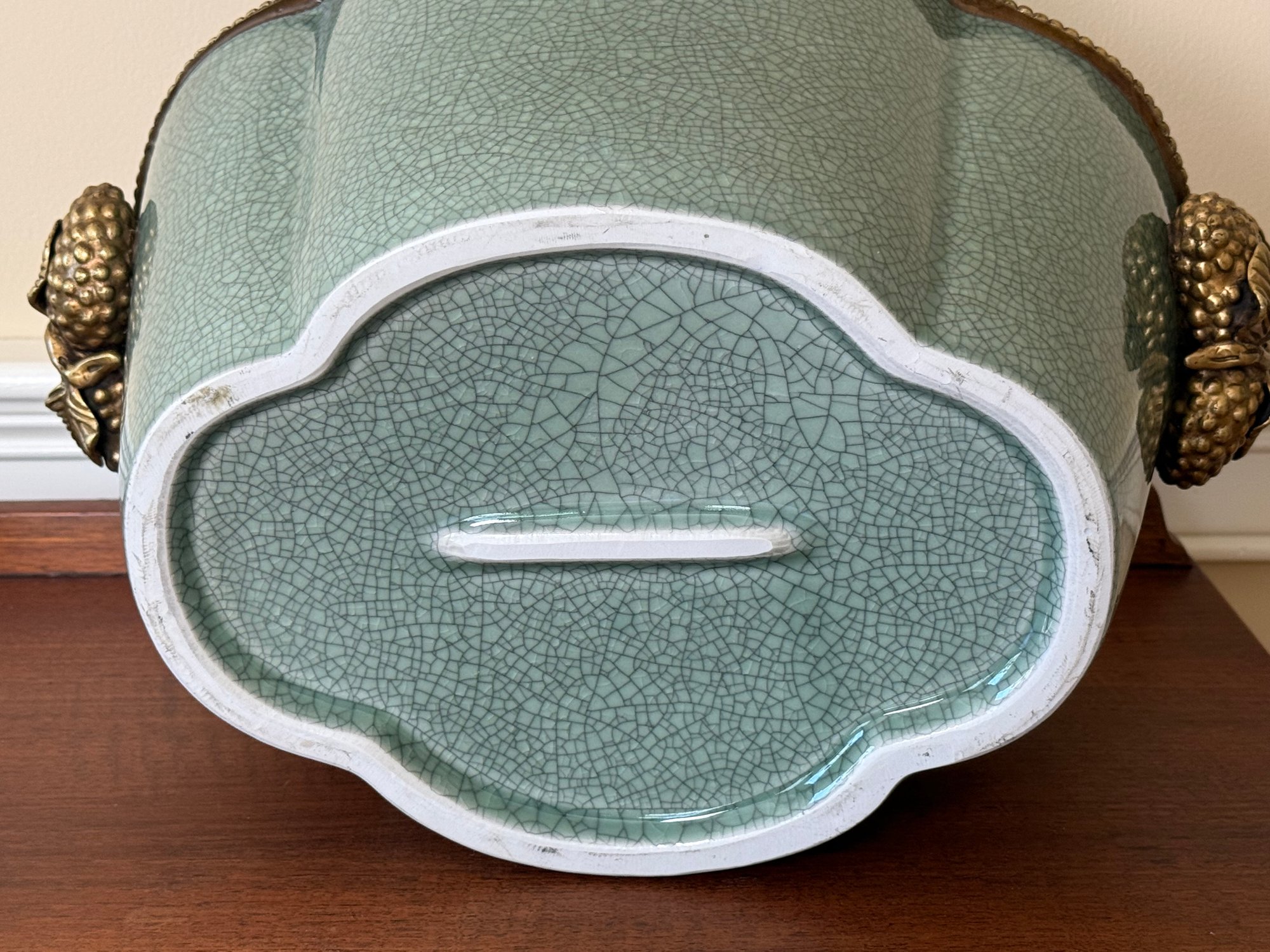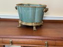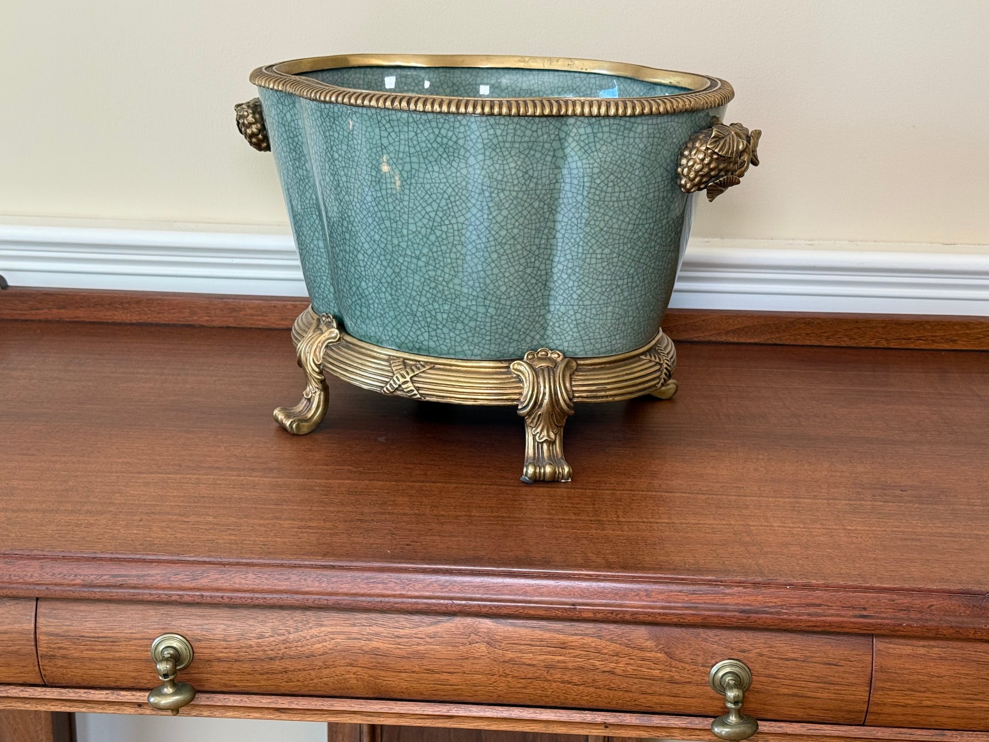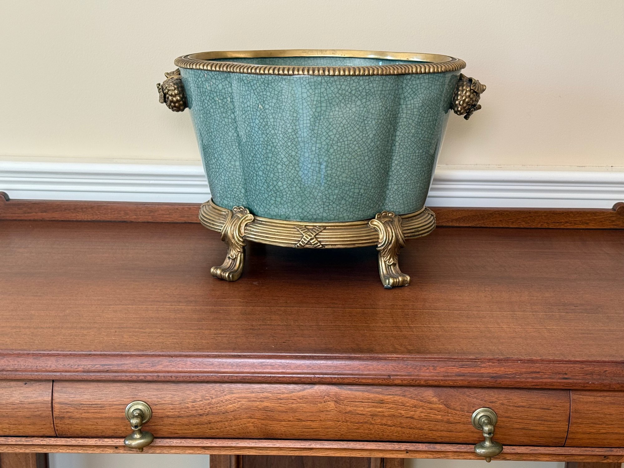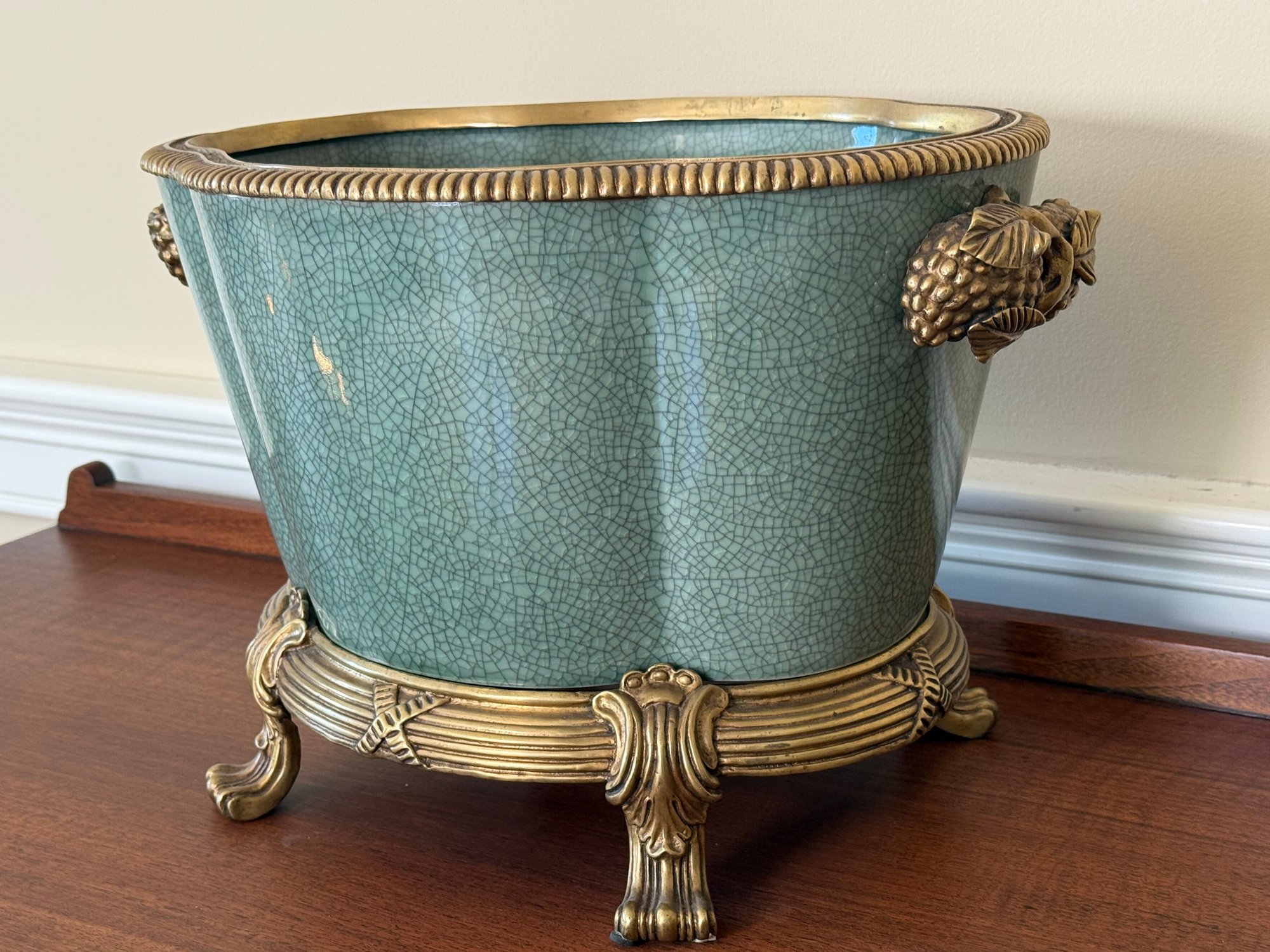 This beautiful celadon glazed pot compliments the brass detail on the stand and handles and makes the green color pop more.