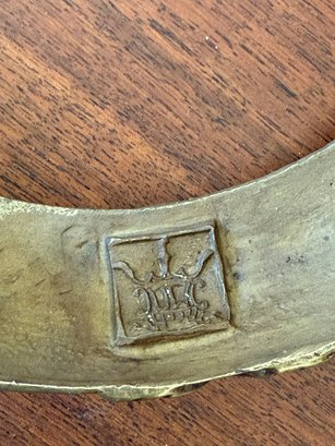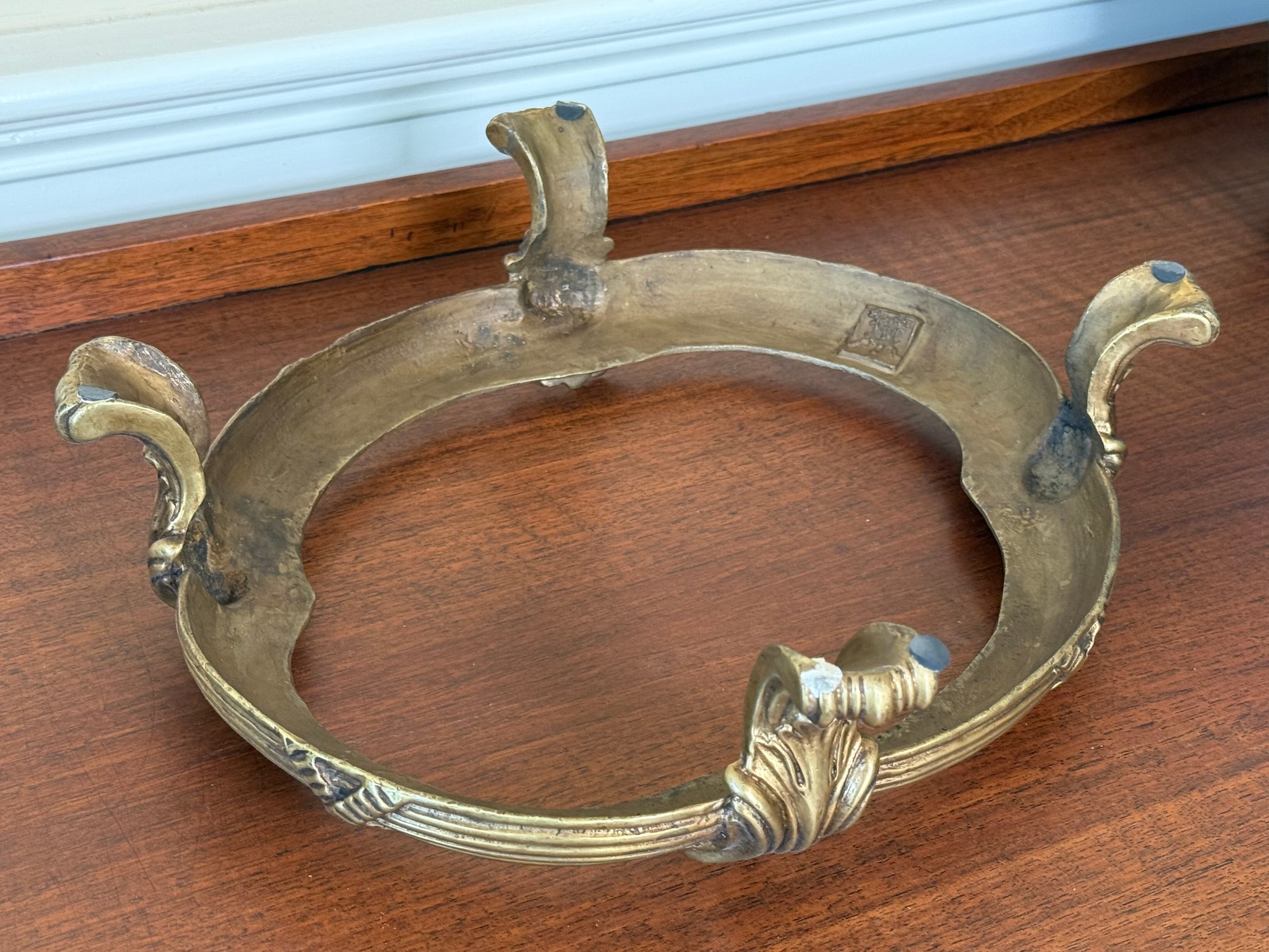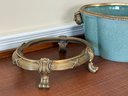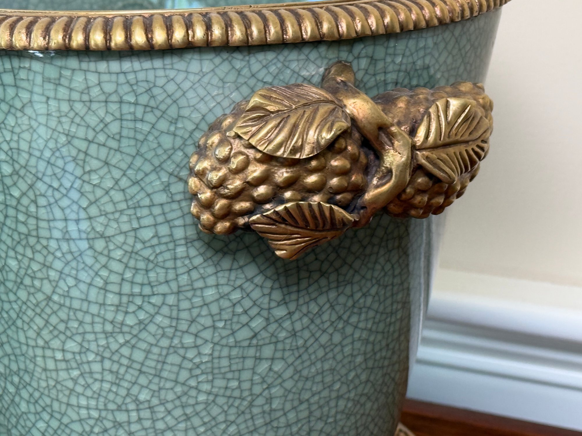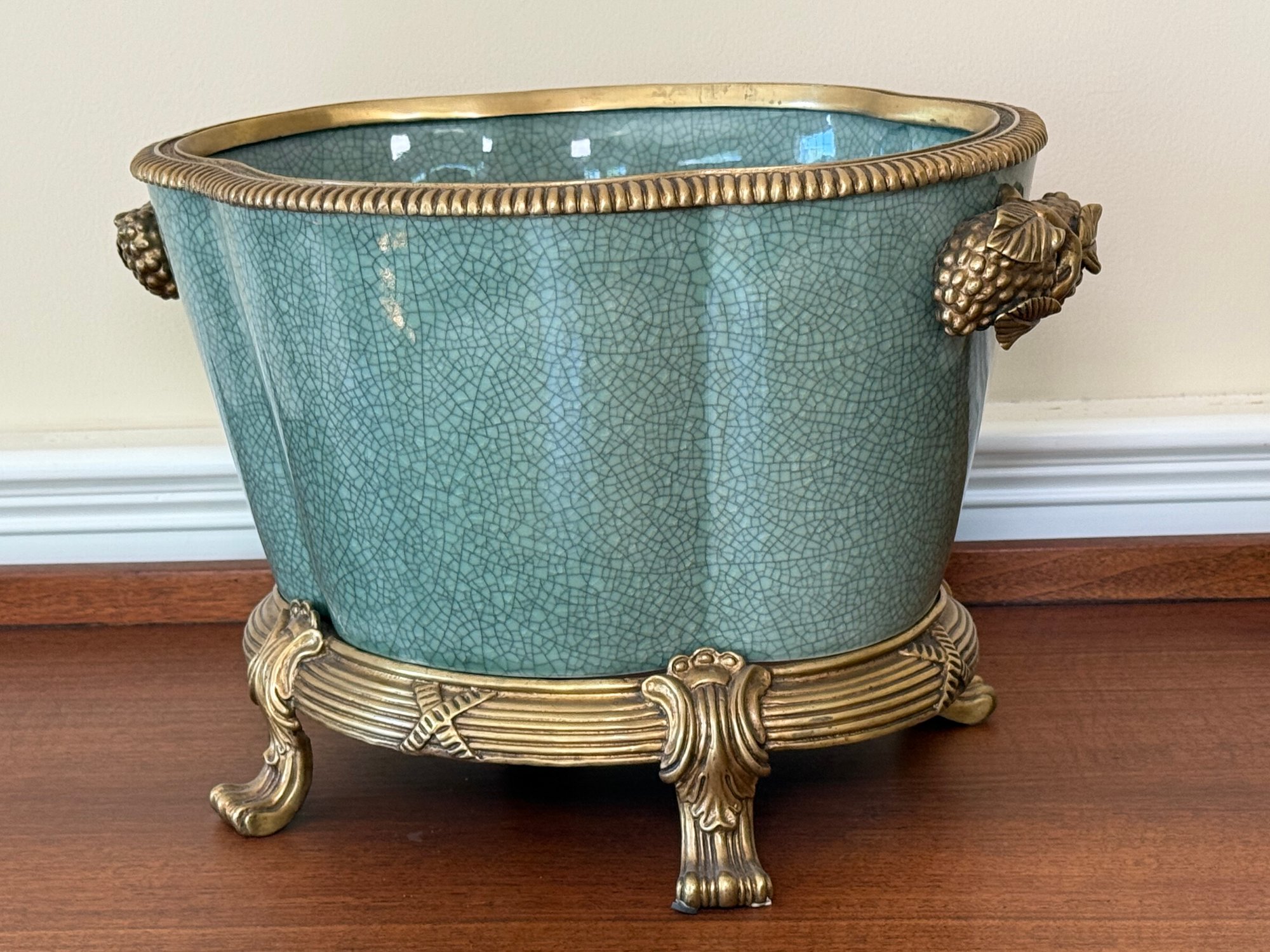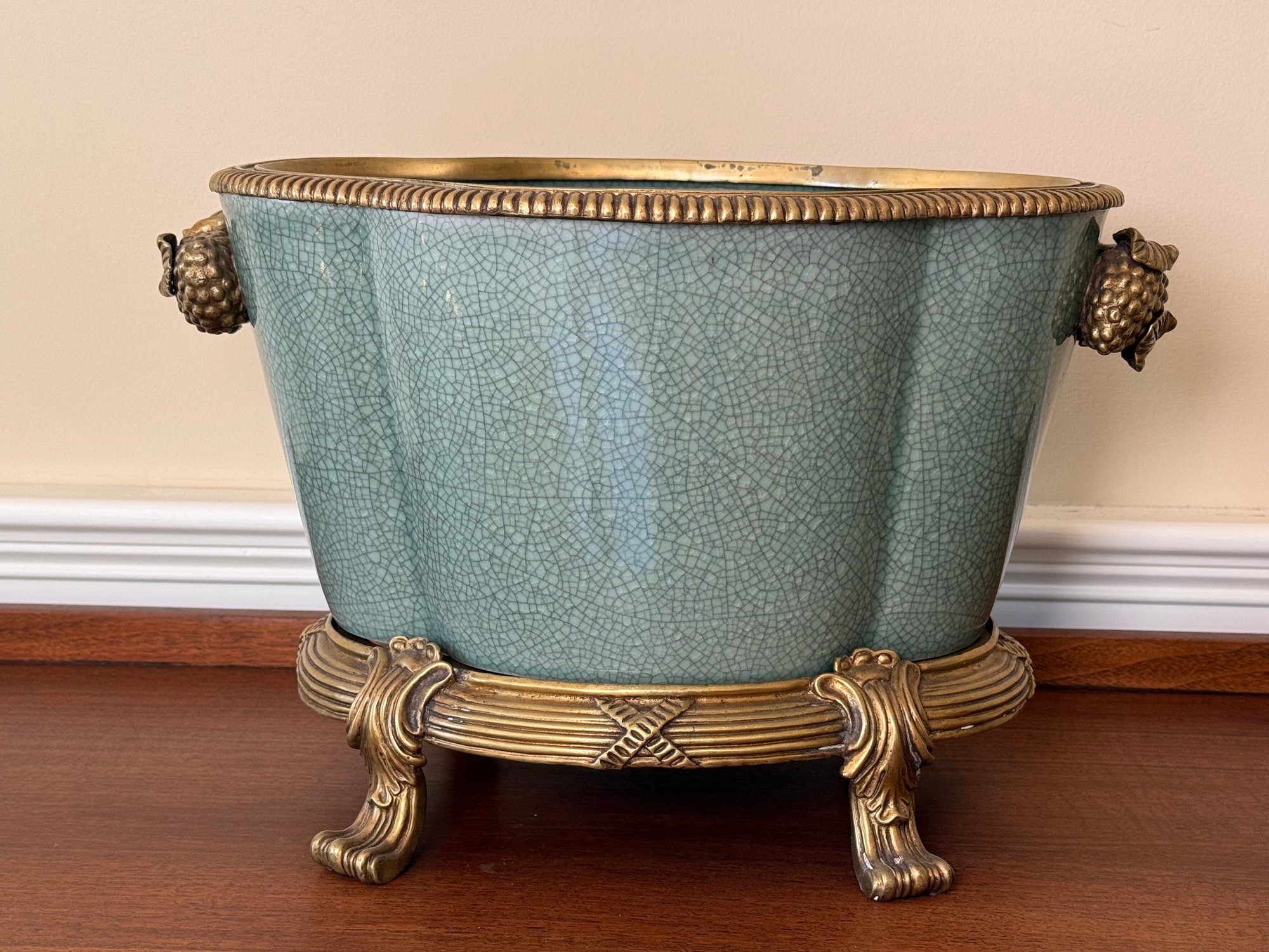 This beautiful celadon glazed pot compliments the brass detail on the stand and handles and makes the green color pop more.