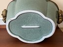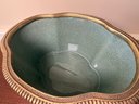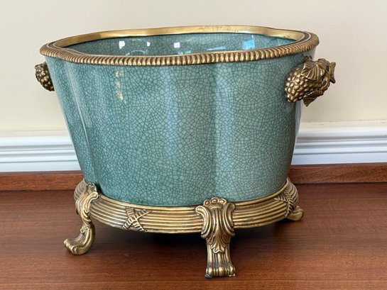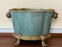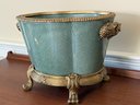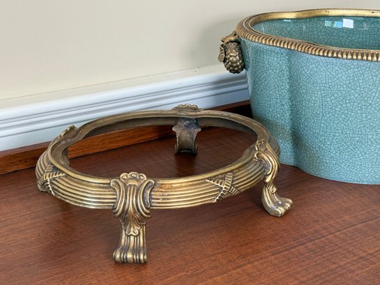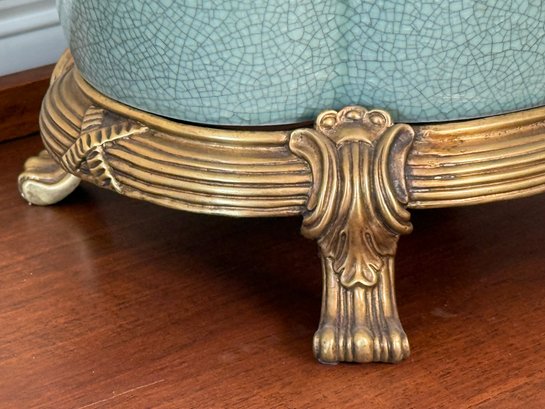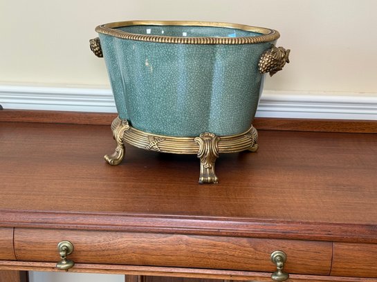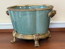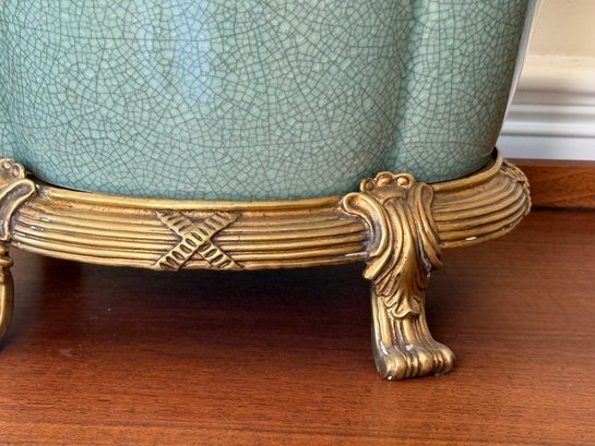 Beautiful Chinese Celadon Glazed Ceramic Pot With Ornate Brass Stand
