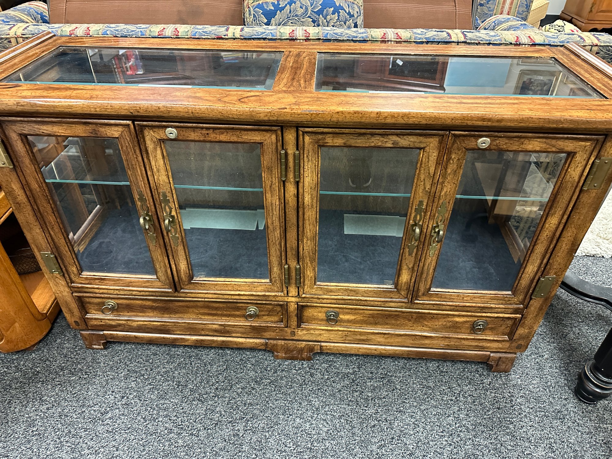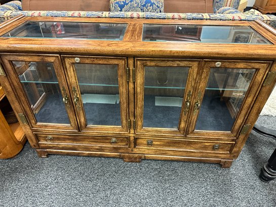 This nice wood cabinet has glass top, glass doors and glass shelf. There are also two drawers Light source. Locks key included. 53 x 17 x 31
