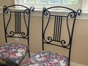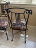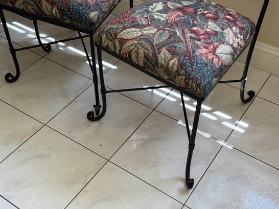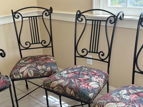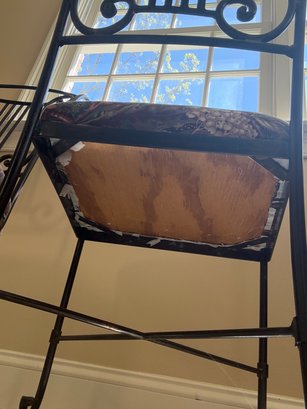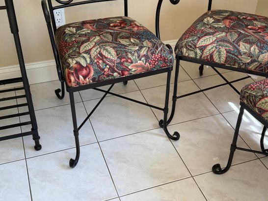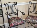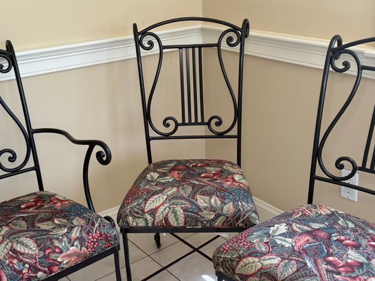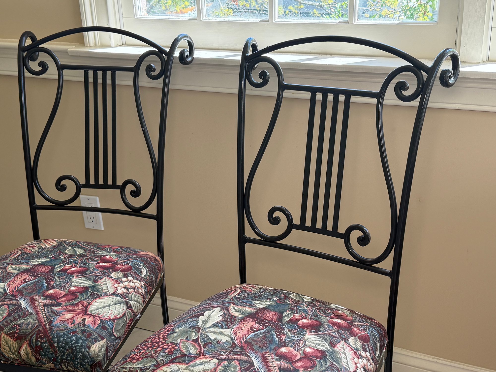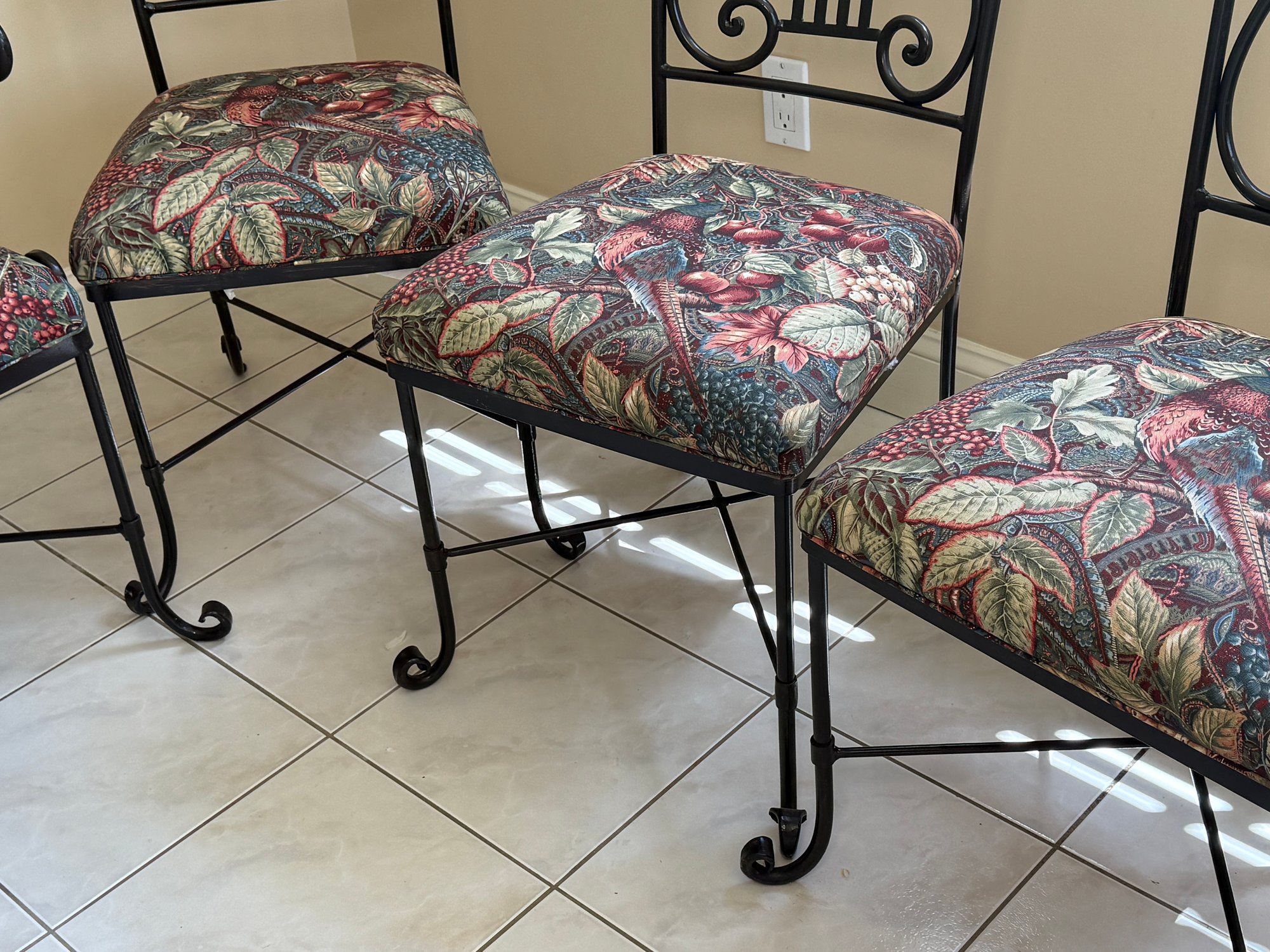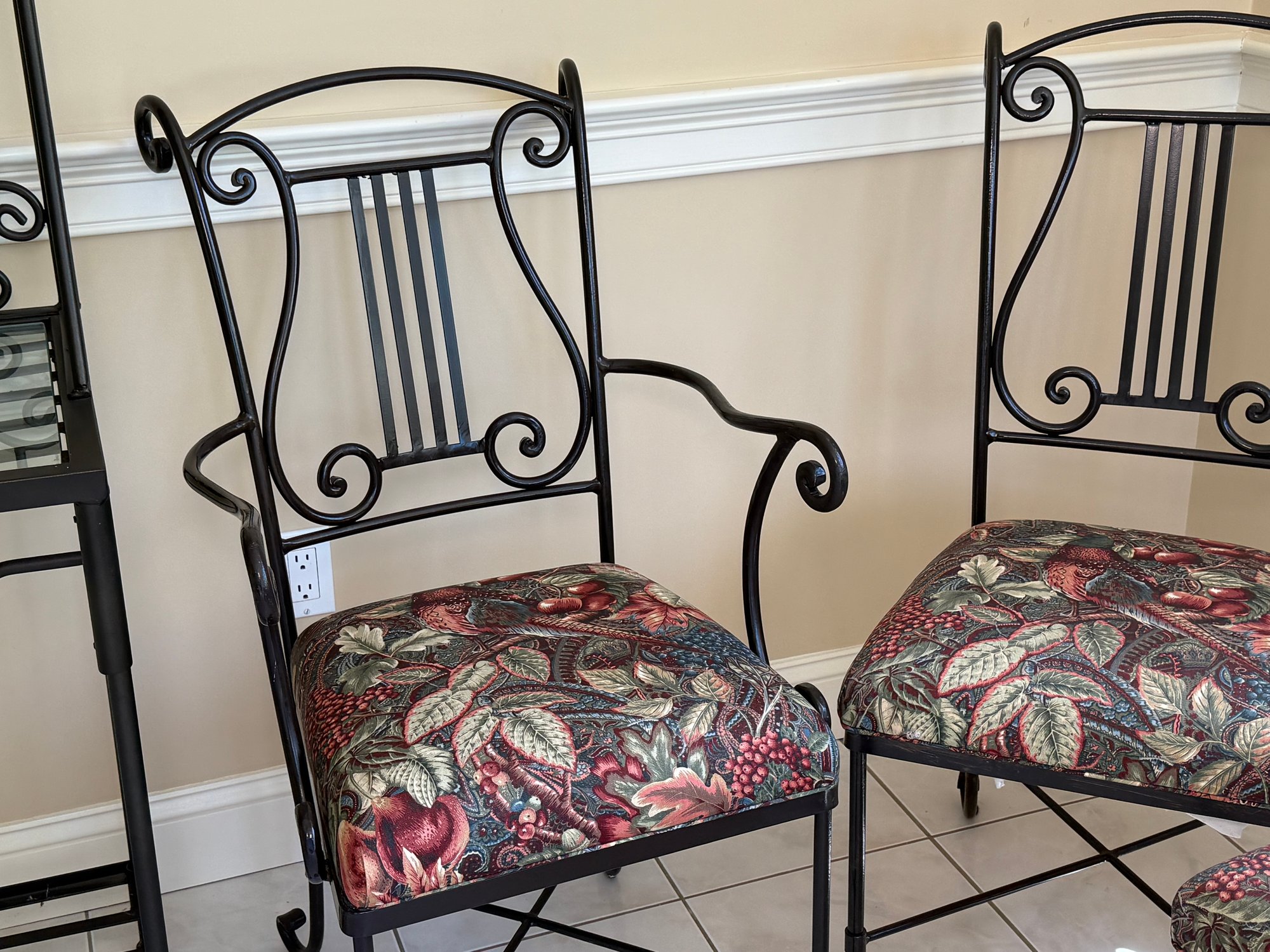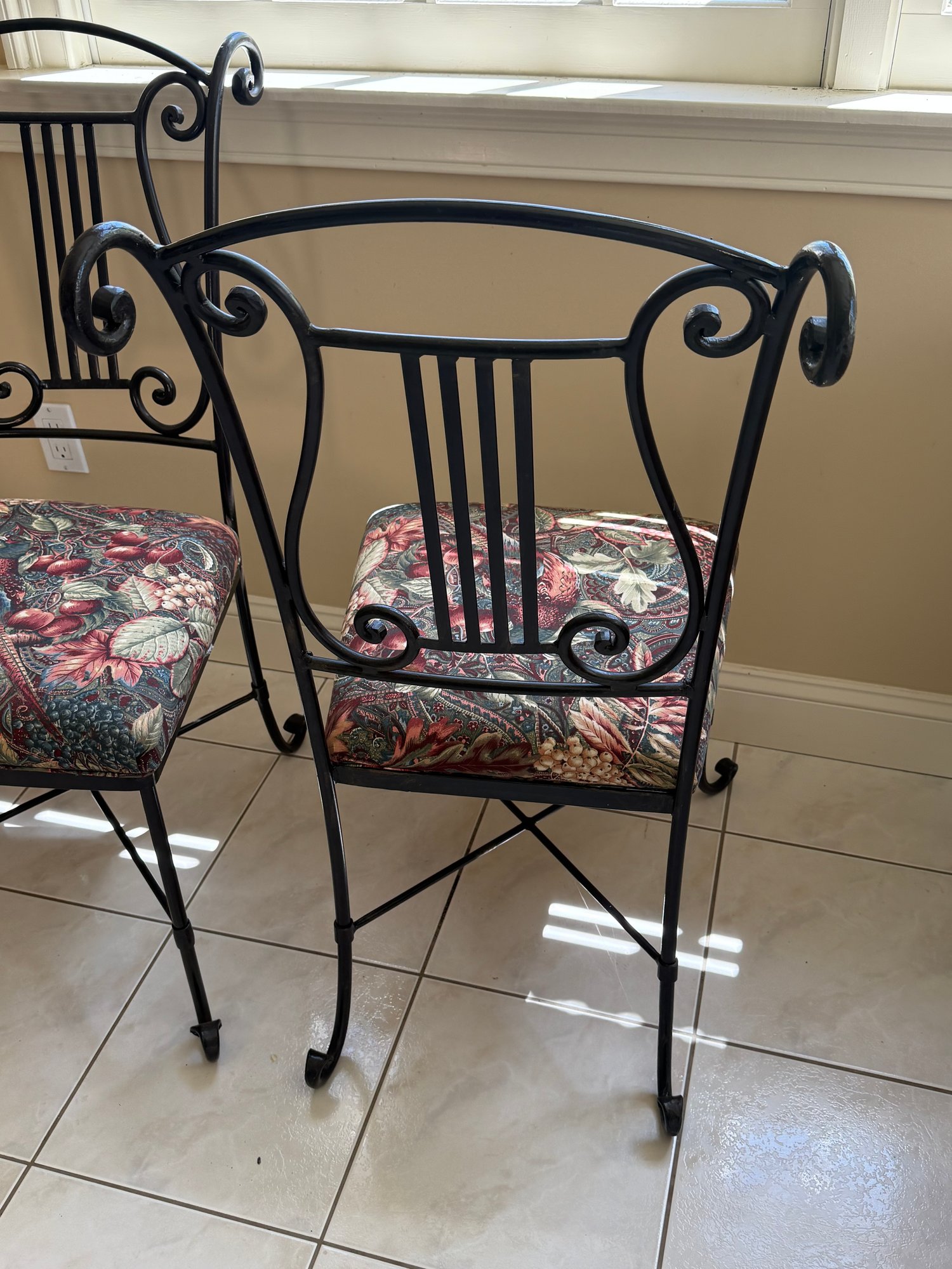 These wrought iron chairs are very heavy and quality made with a pretty fabric seat. They match with the table in the next lot but we have separated the lots in case you only need one or the other. There are 3 armless chairs and one arm chair.