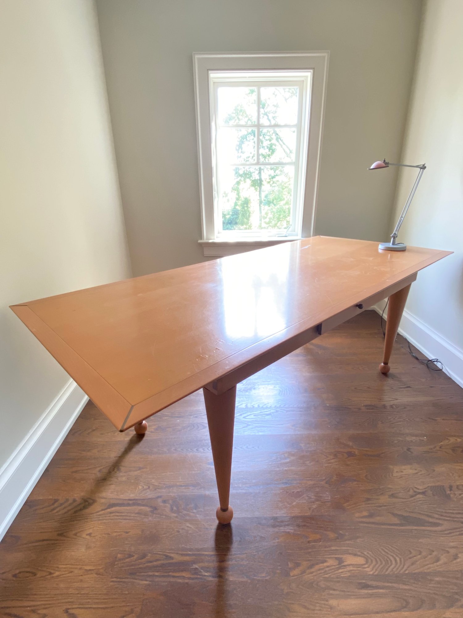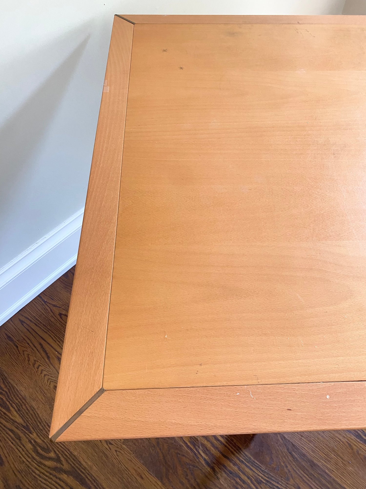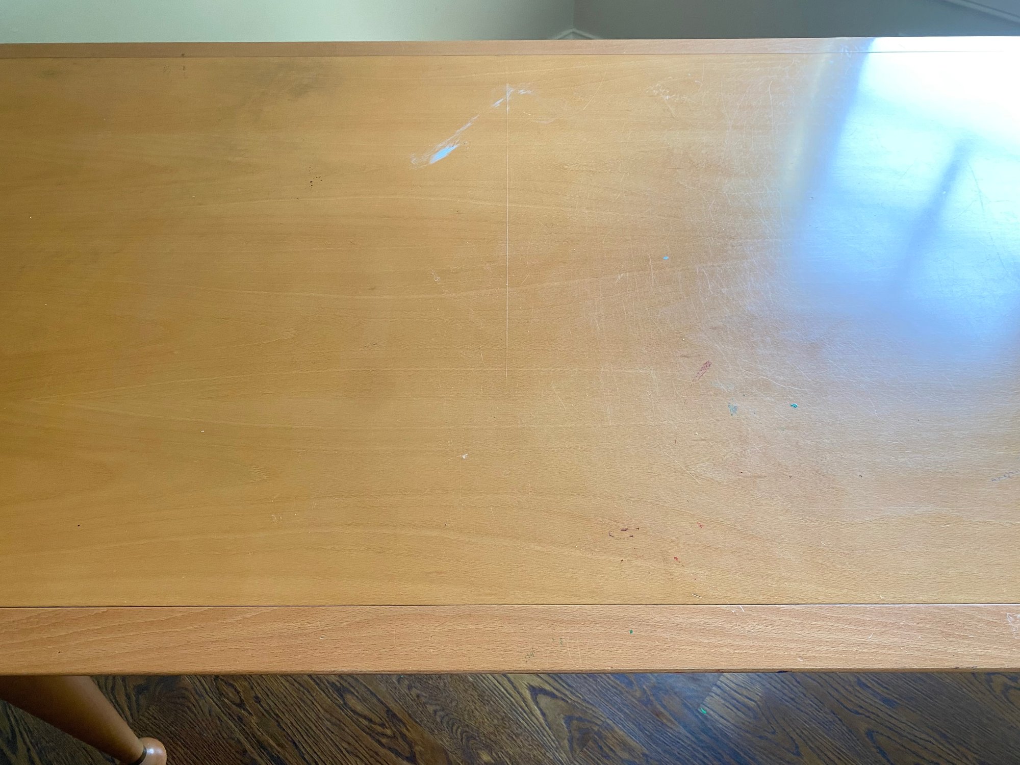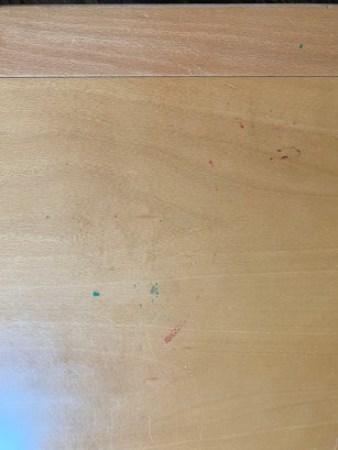 Has been lightly used as a work table and there are areas of paint marks that come off when scratched with finger