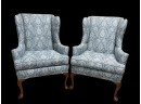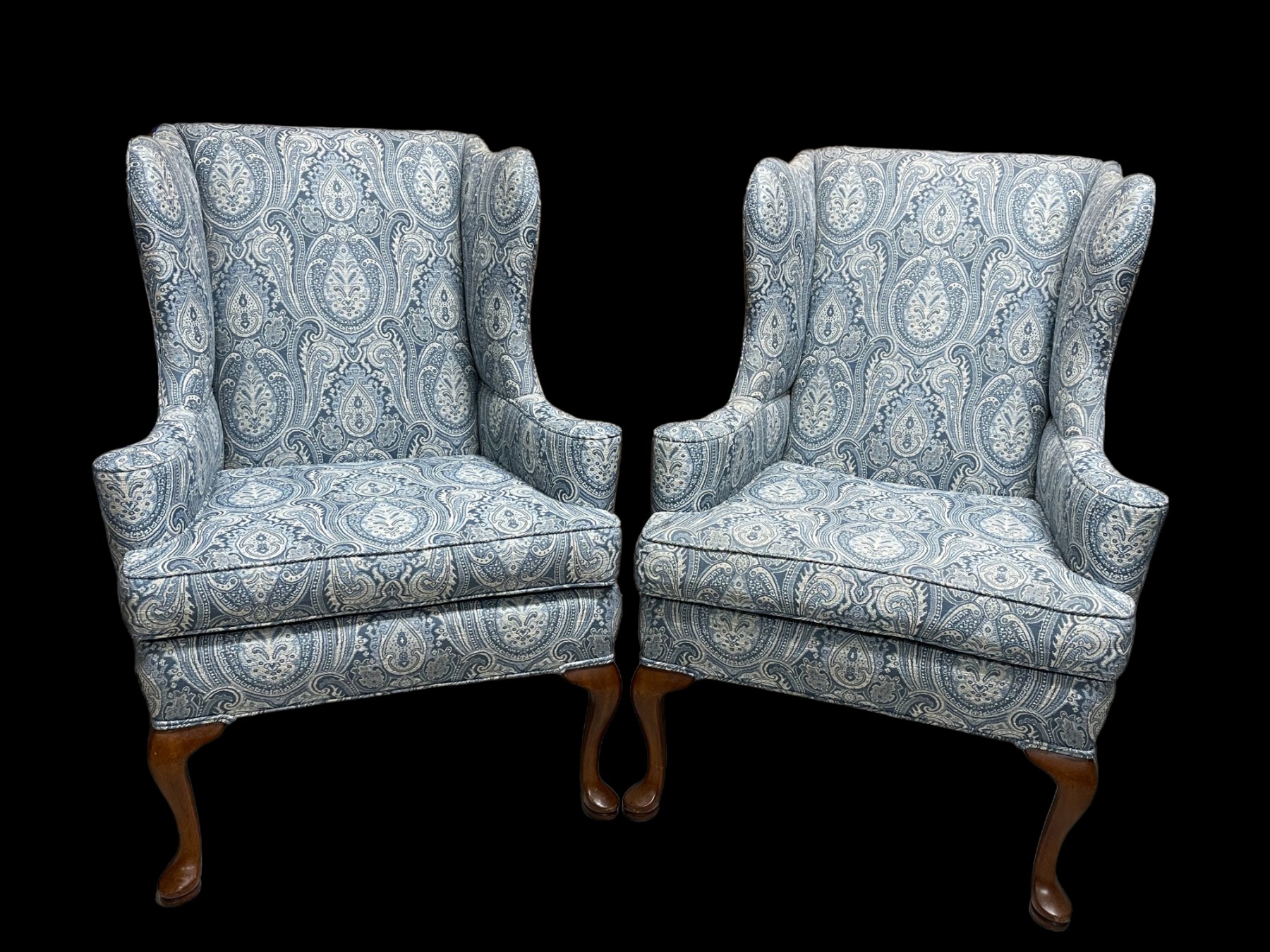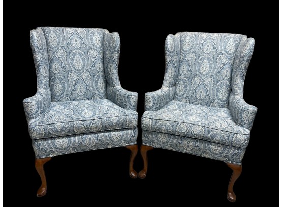A Beautiful pair of paisley wingback chairs that are in great condition. They match many different styles with the traditional paisley design and light color theme. Gorgeous shades of blues and creams. They come with 4 arm chair covers as well. Each chair measures approximately 44 inches tall, 28 inches wide and 25 inches deep.