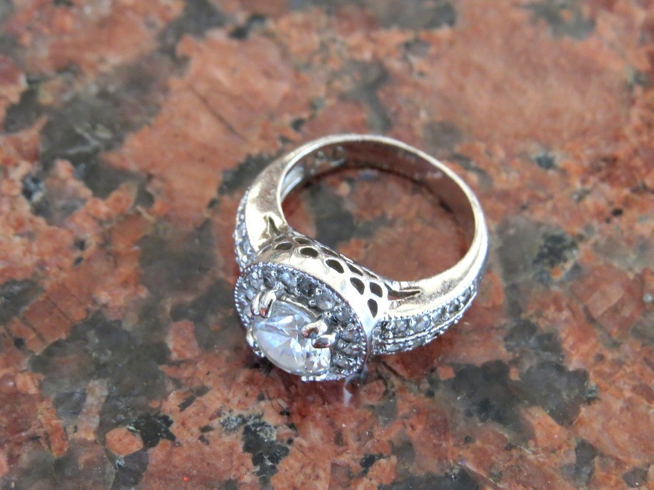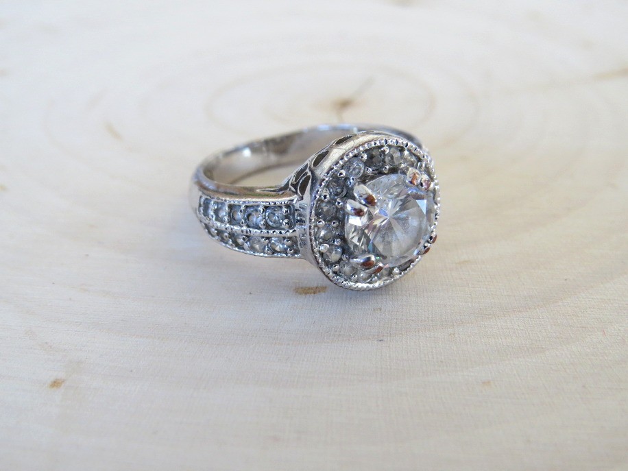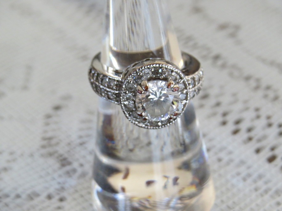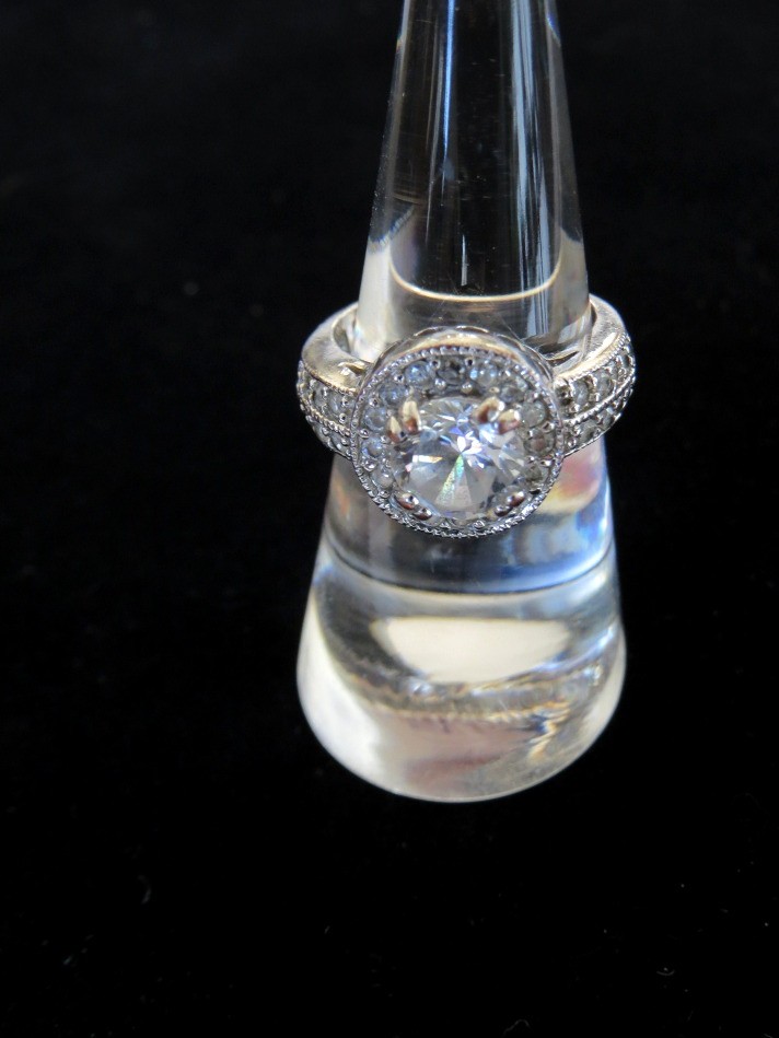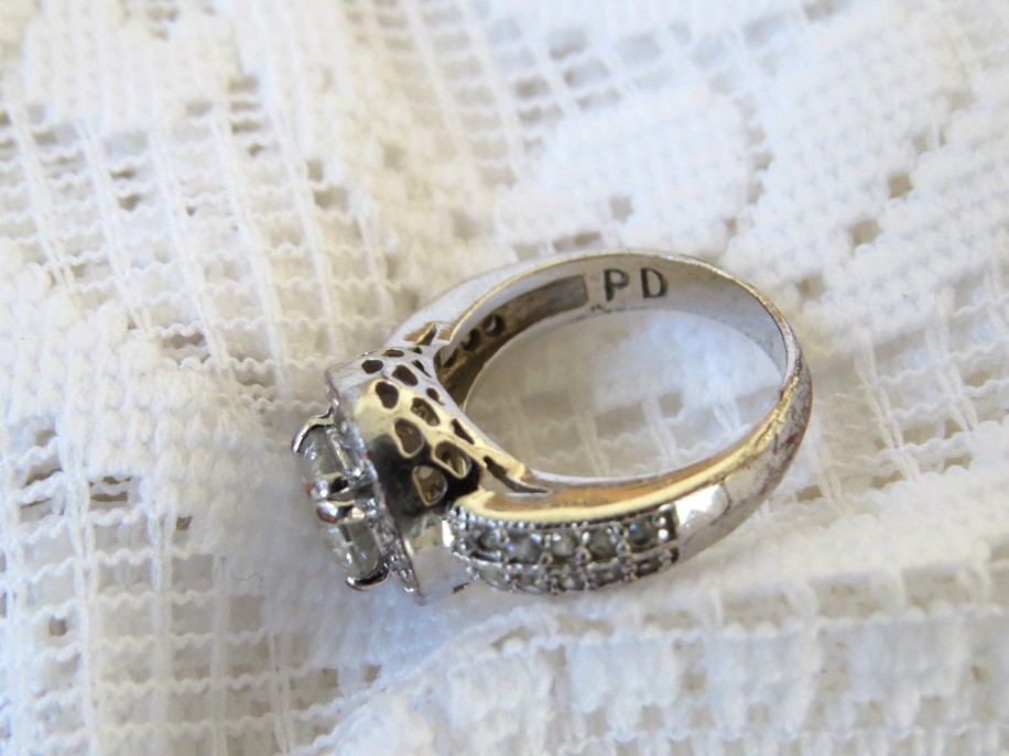This beautiful clear stone palladium ring is Size 6. It features a prong set round center stone surrounded by smaller clear stones including on the ring shaft. The The filigree design allows the light to penetrate underneath the stone making it appear brighter. Ring is marked PD on the inside. Palladium is a precious metal known for its silvery white appearance and strength.