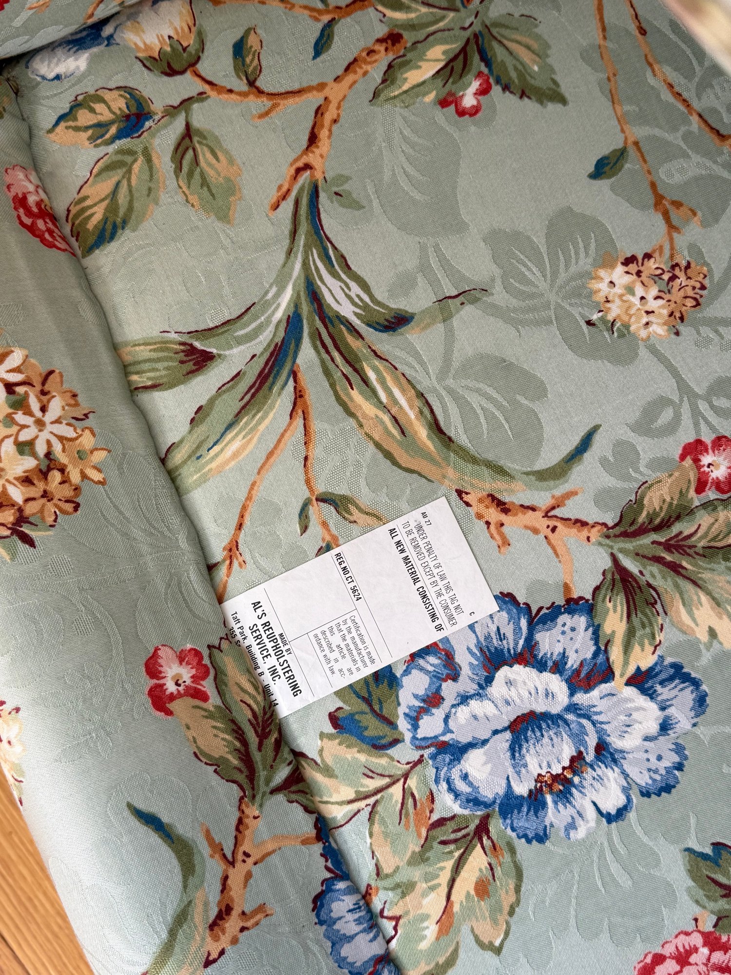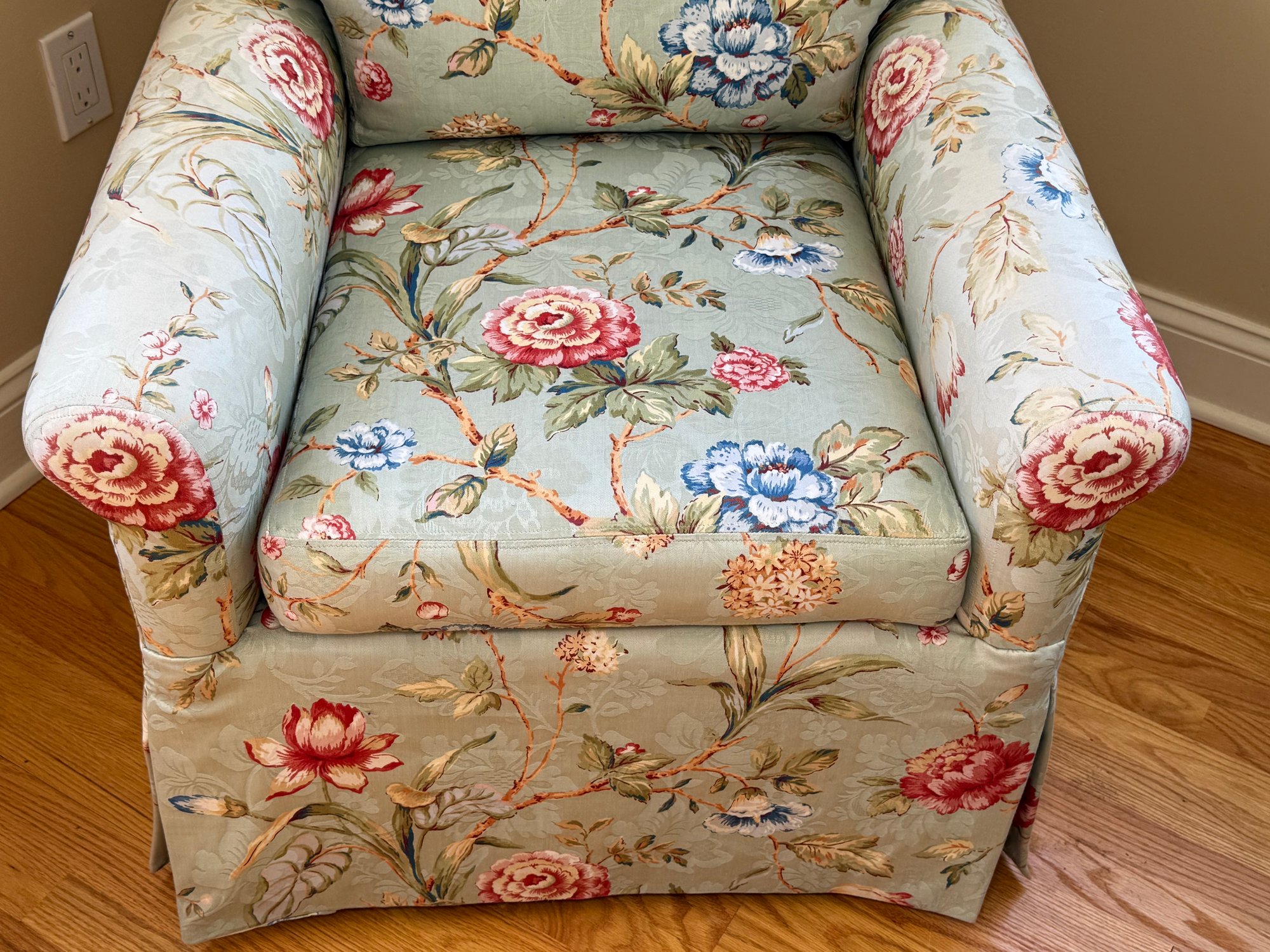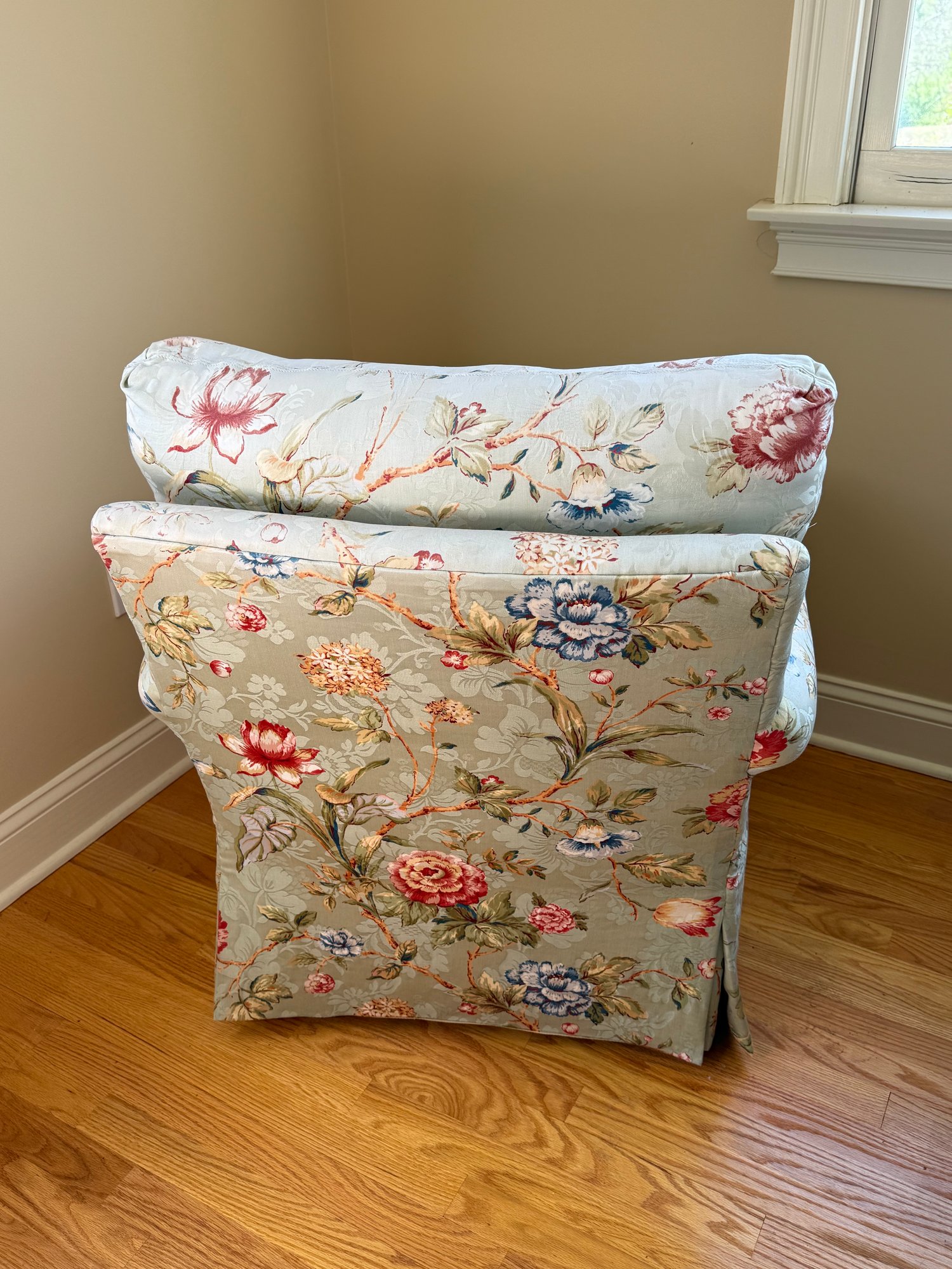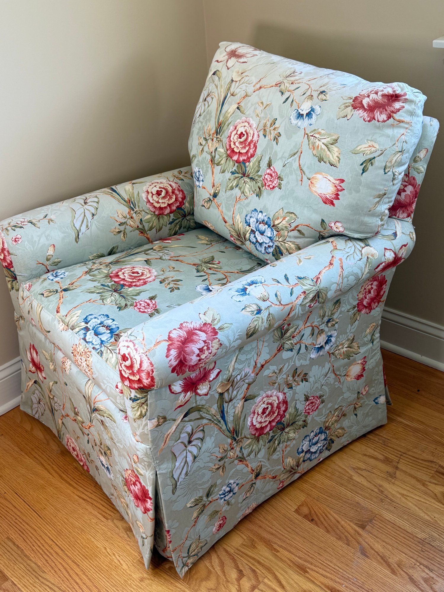 This is a very pretty, comfortable, quality made custom floral design arm chair that is a nice size to stick in any part of your home. They were reupholstered at Al's Reupholstery.