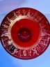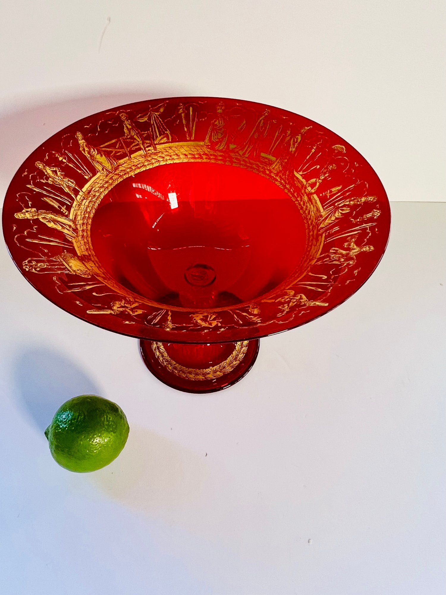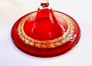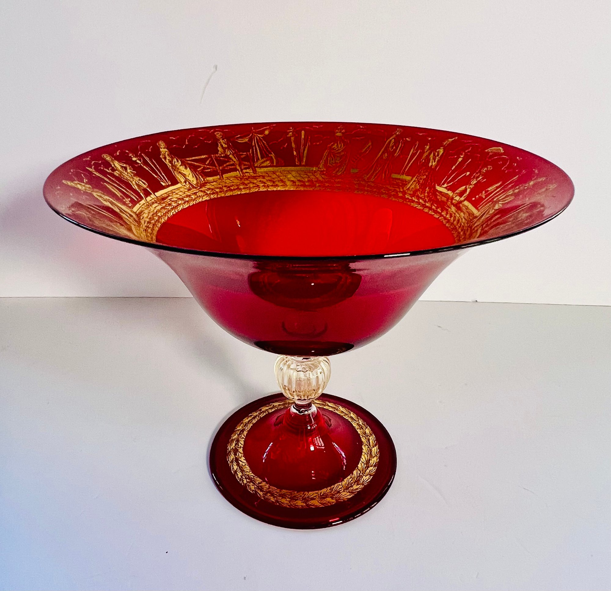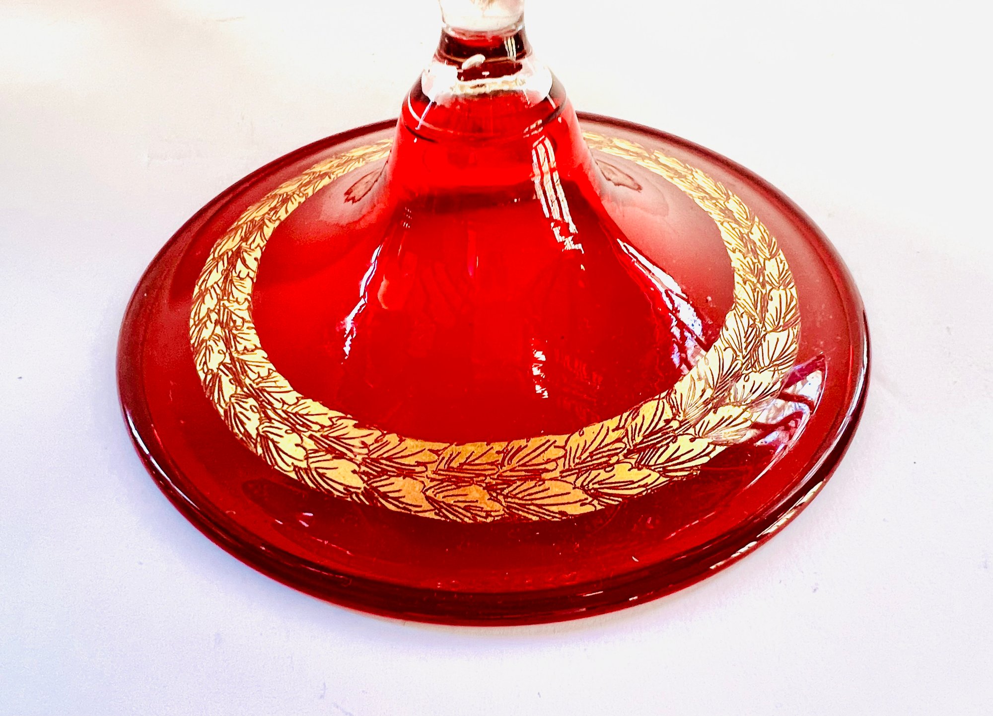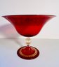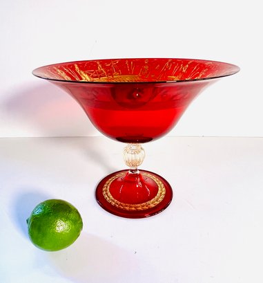 This gorgeous compote is a rich deep ruby red with gold patterning around the interior rim. Perfect eye candy for