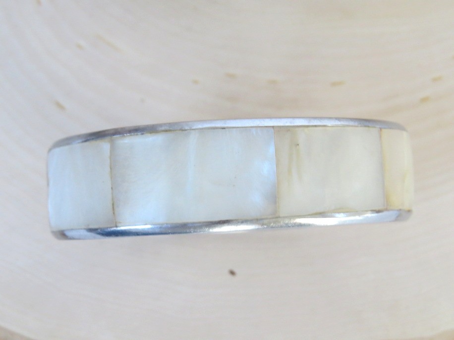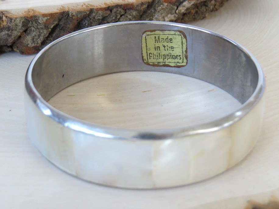 Crafted in the Philippines this beautiful silver tone bangle bracelet is encircled with Mother of Pearl. Bracelet is almost 3/4" wide and it has an inside diameter of 2 1/2". The original "Made in the Philippines" sticker is still on the inside of the bracelet.