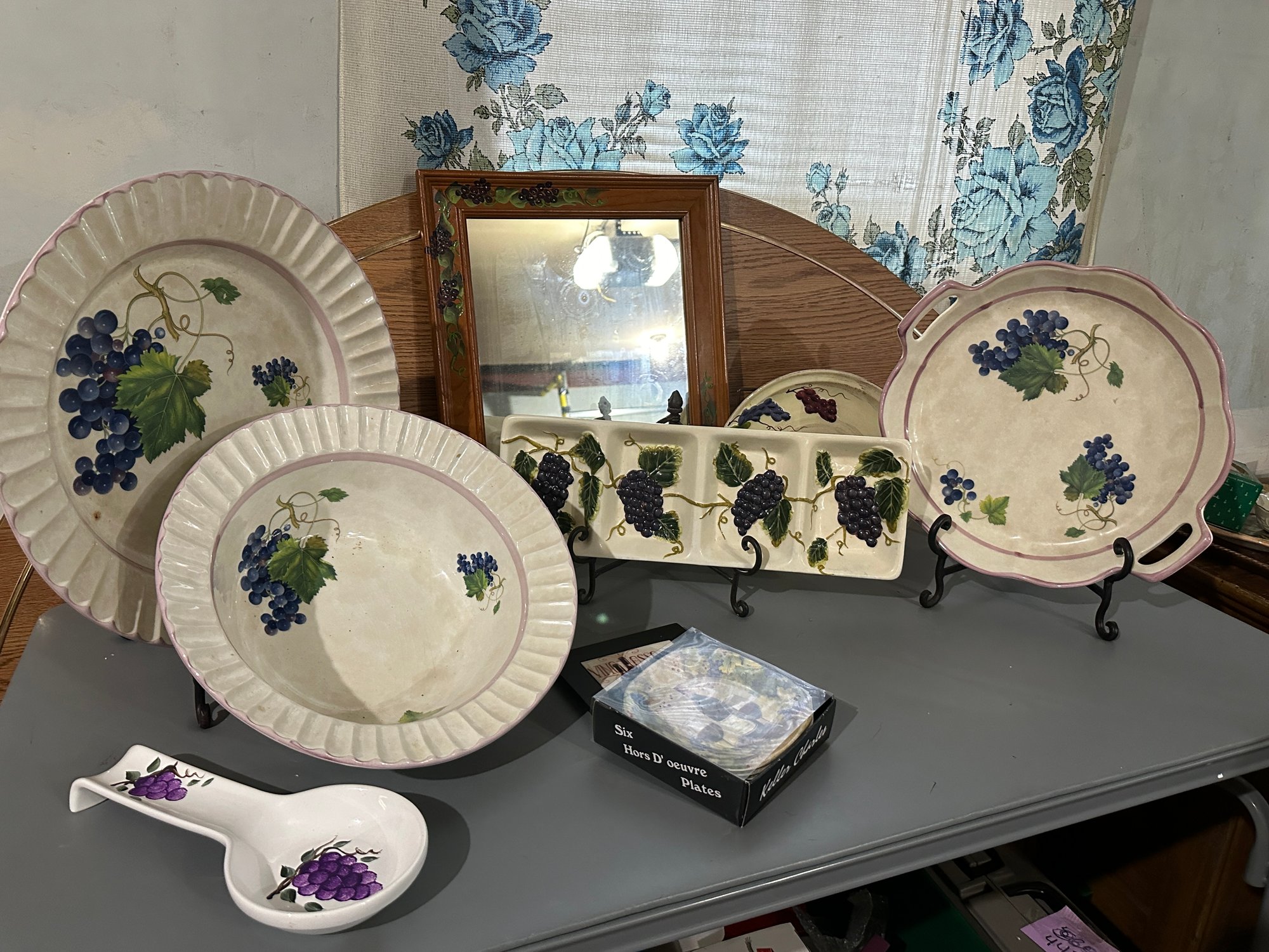2 pc. scalloped bowl and platter made in Italy; handled platter; sectioned dish; handpainted wood frame mirror, spoon rest; set of 4 appetizer plates; trivet, small plate