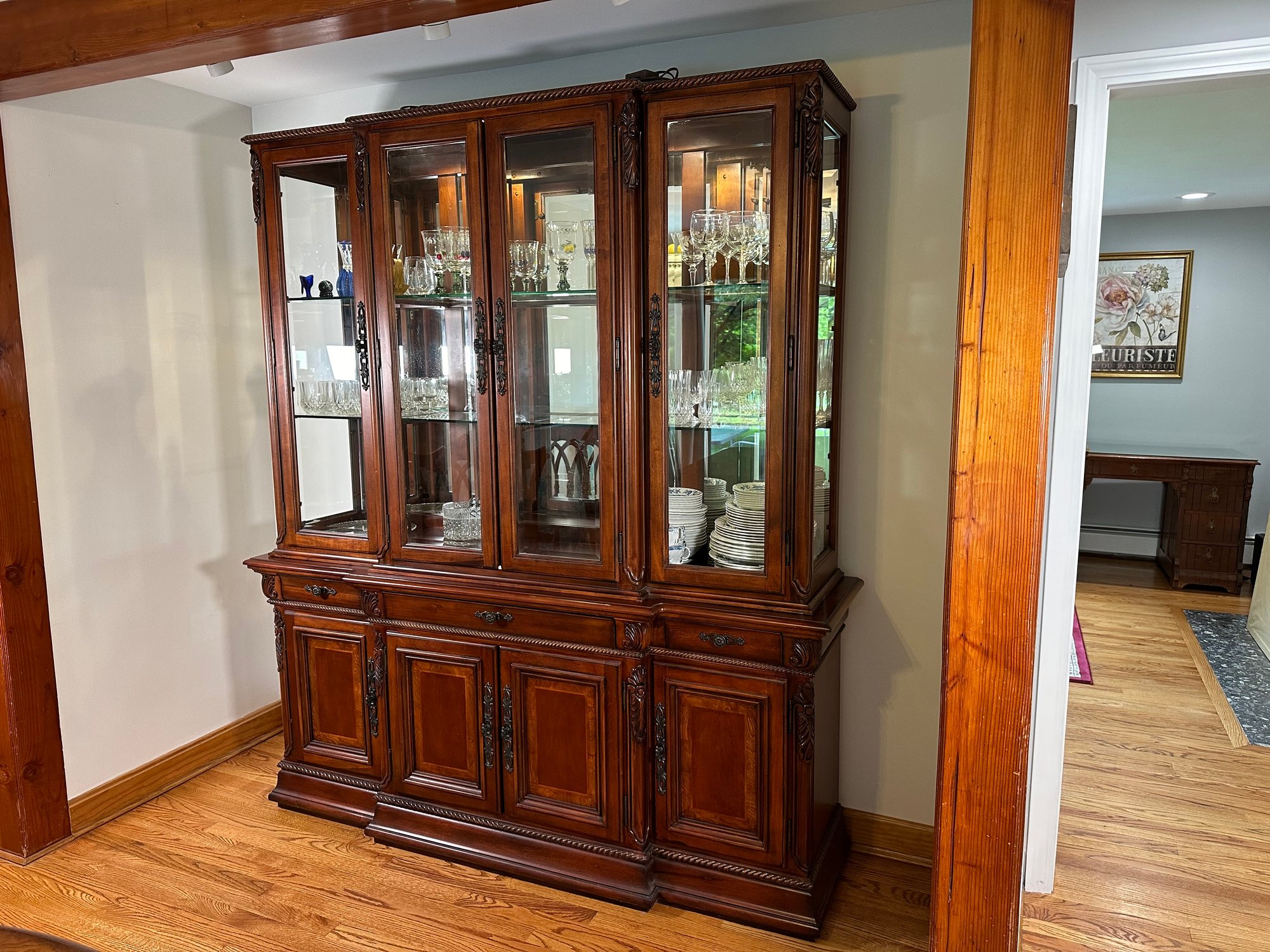 Beautiful Universal Furniture Breakfront Cabinet featuring incredible wood carved detail. This Breakfront comes apart into two pieces for easier transport. There are glass shelves and lighting inside to display your treasures. There is plenty of storage space with drawers and shelving. This piece is in very good condition with normal signs of use. There is a gorgeous matching dining room table with eight chairs in separate lot.