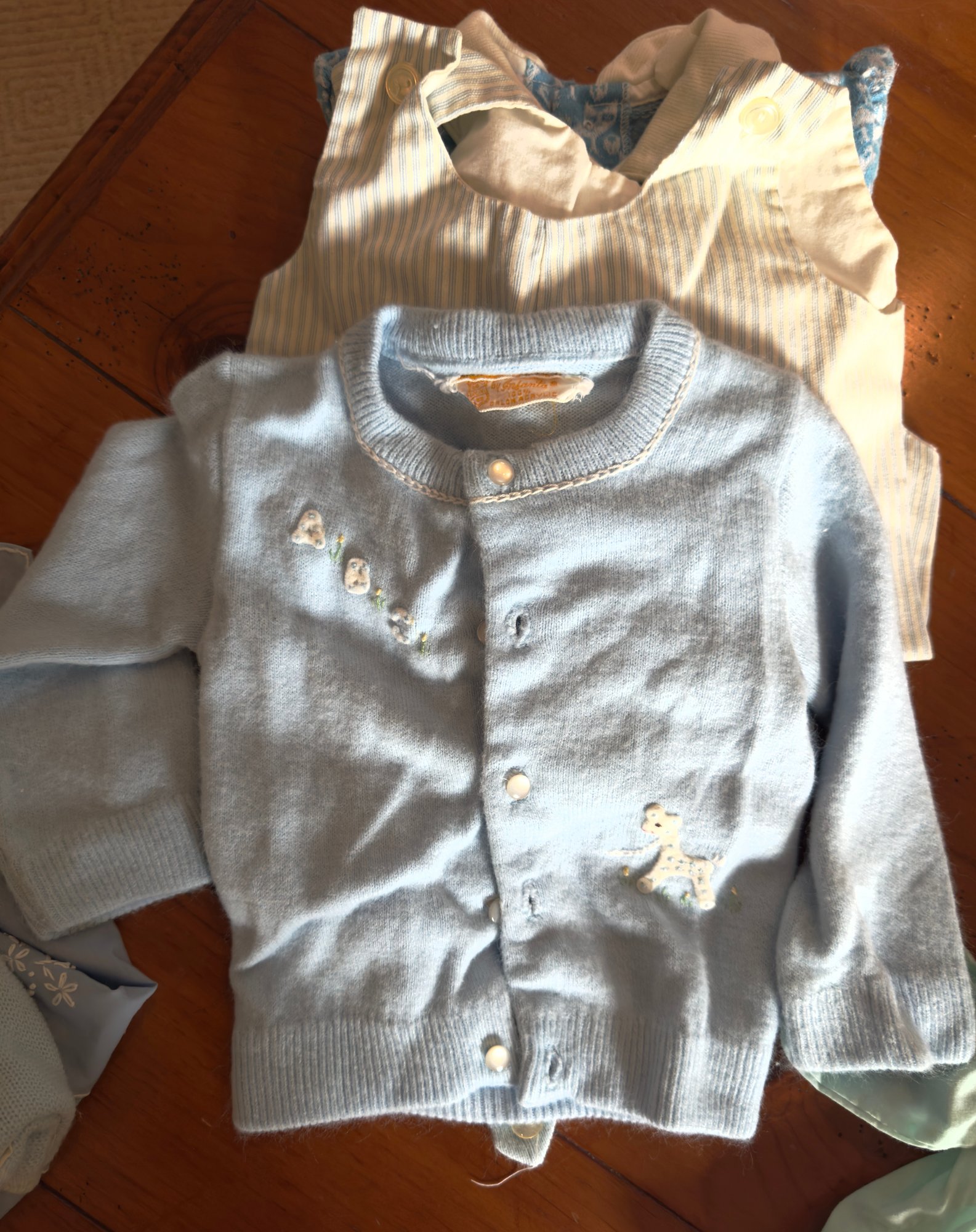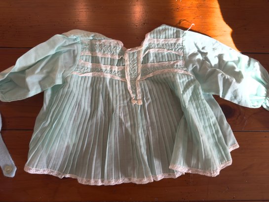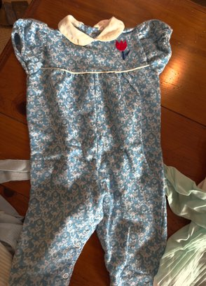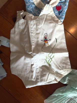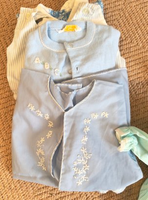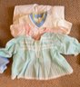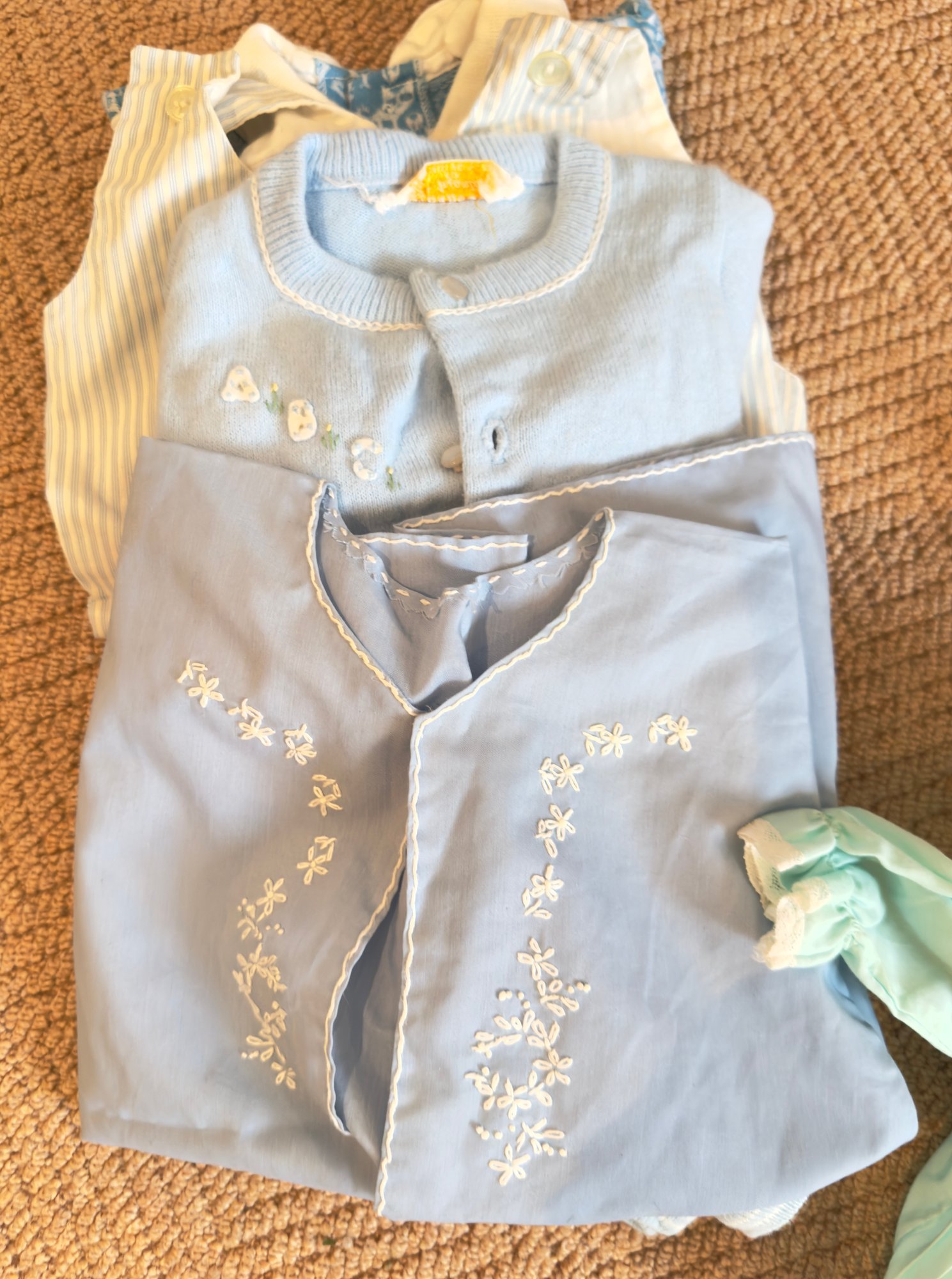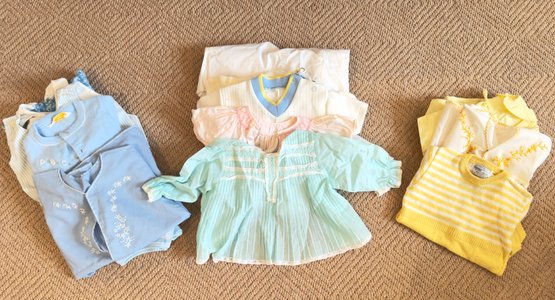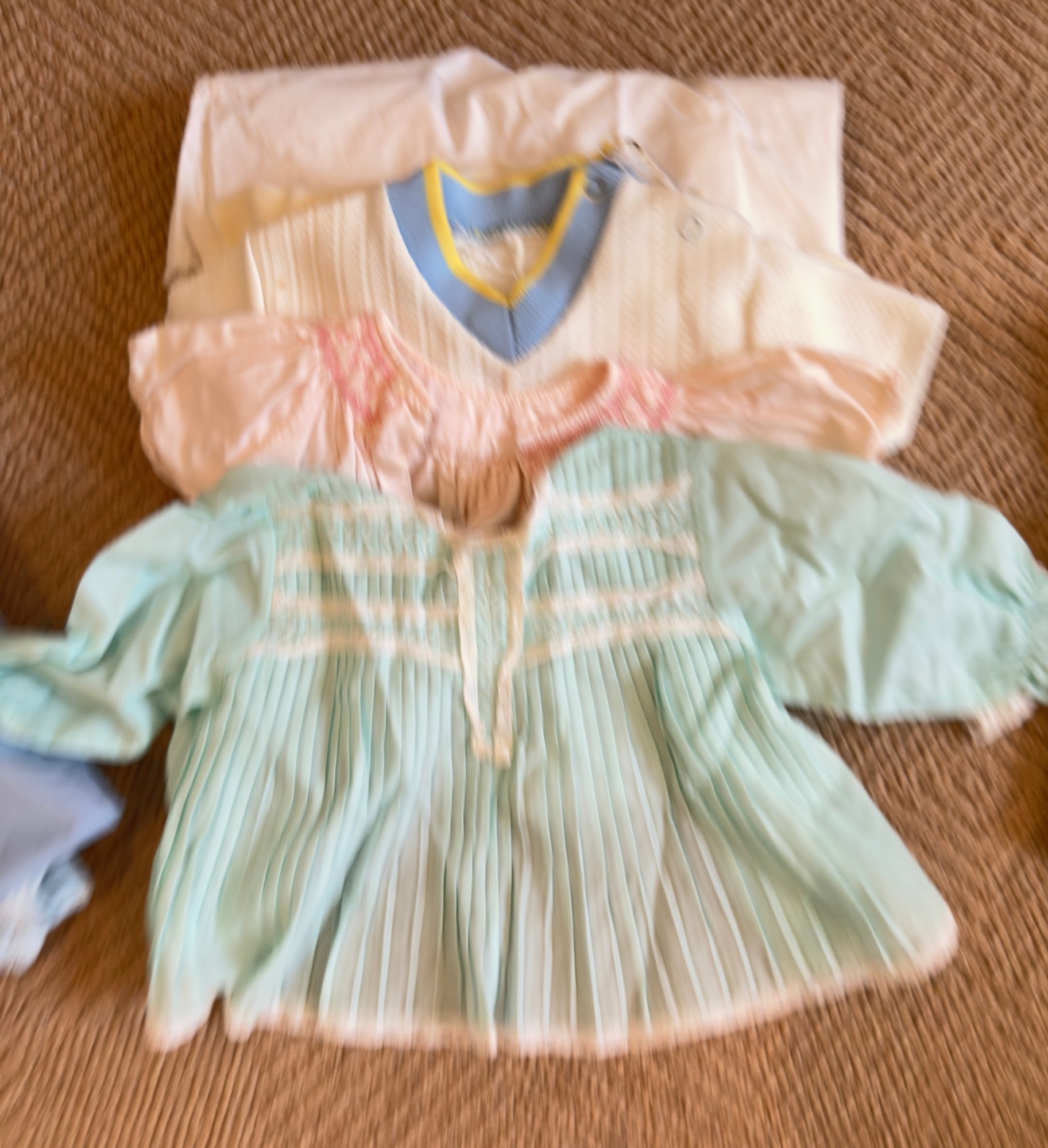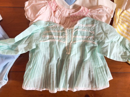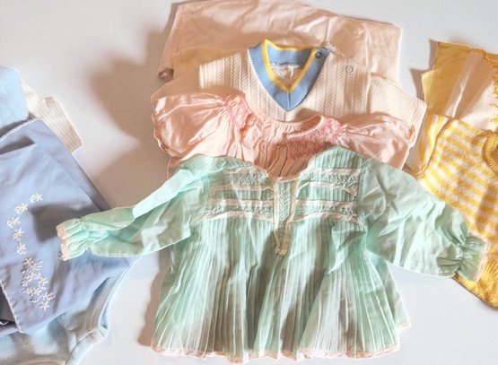 In multi color pastels in everything from sunsuits to lounge coats :) an adorable assortment of vintage babys clothes.