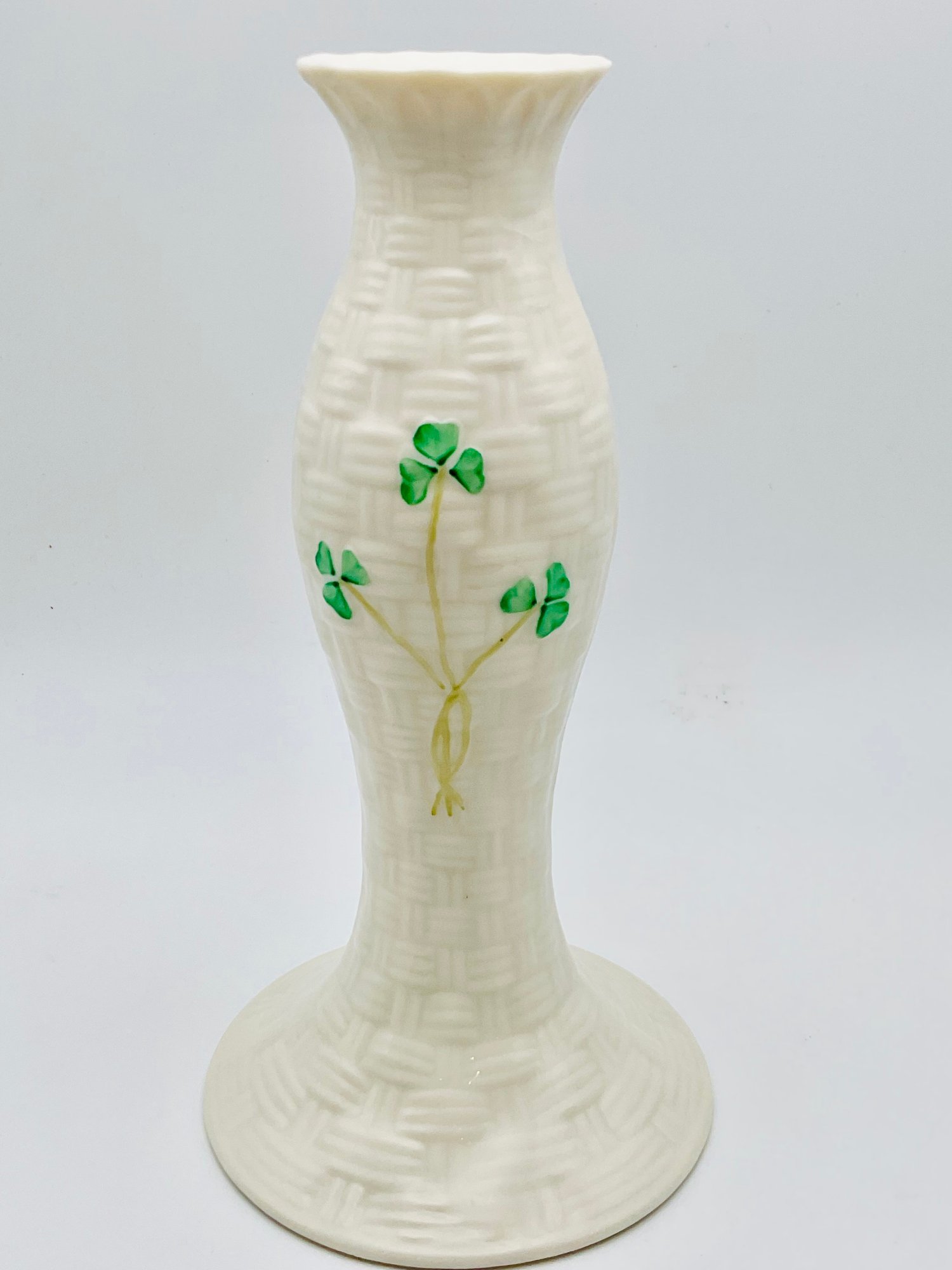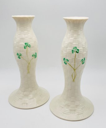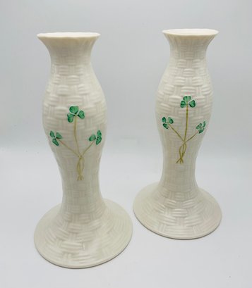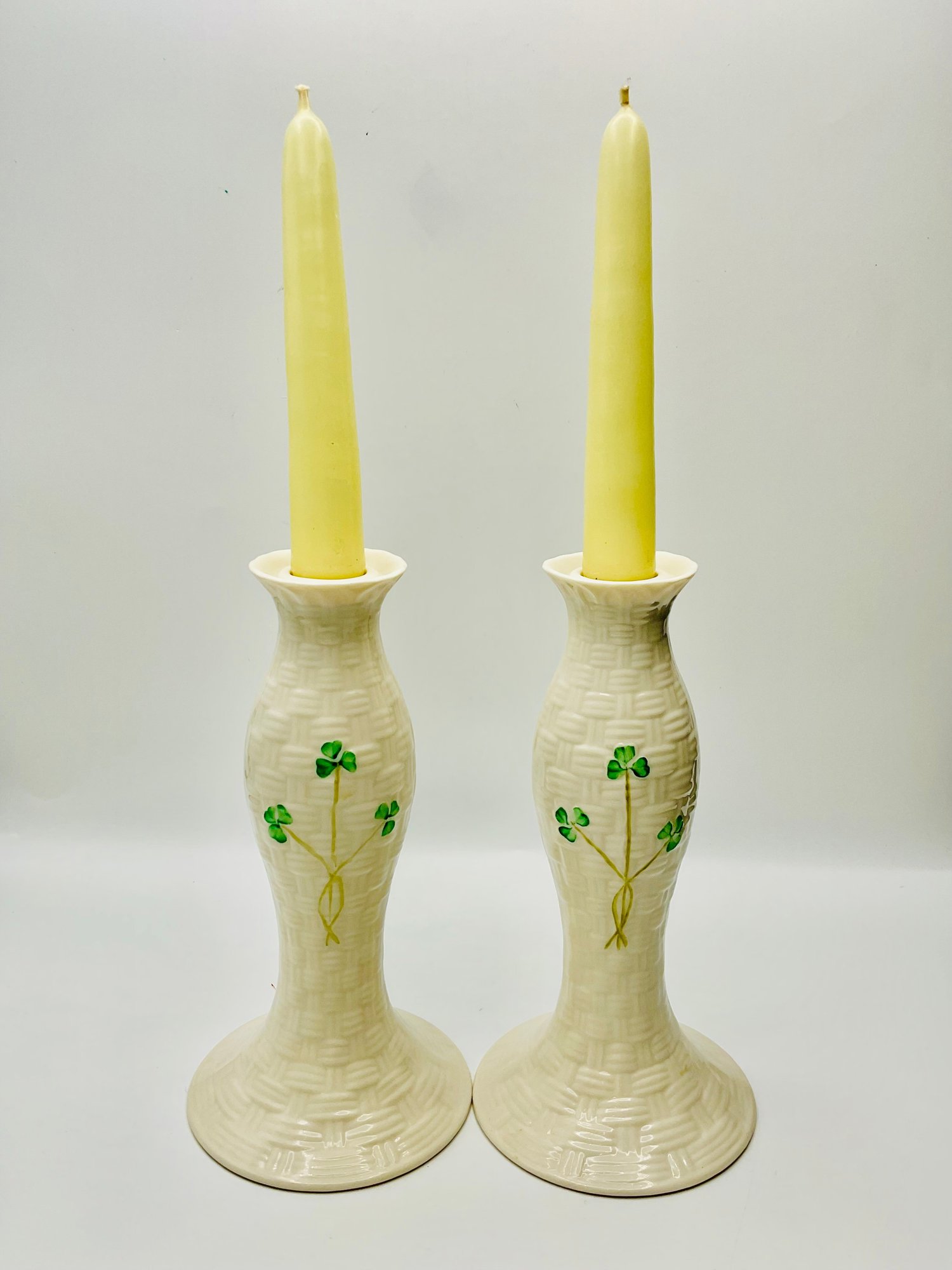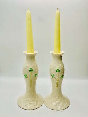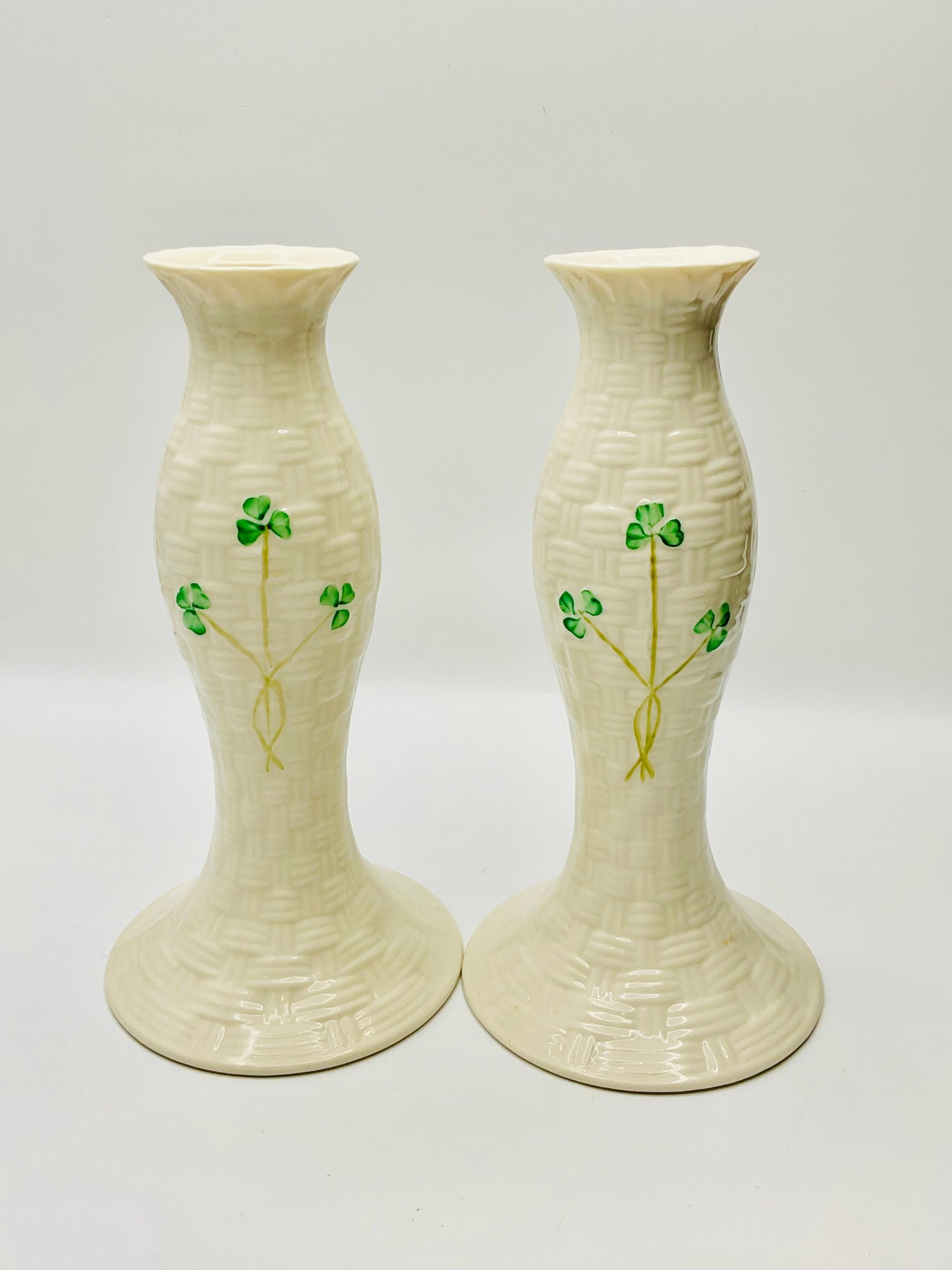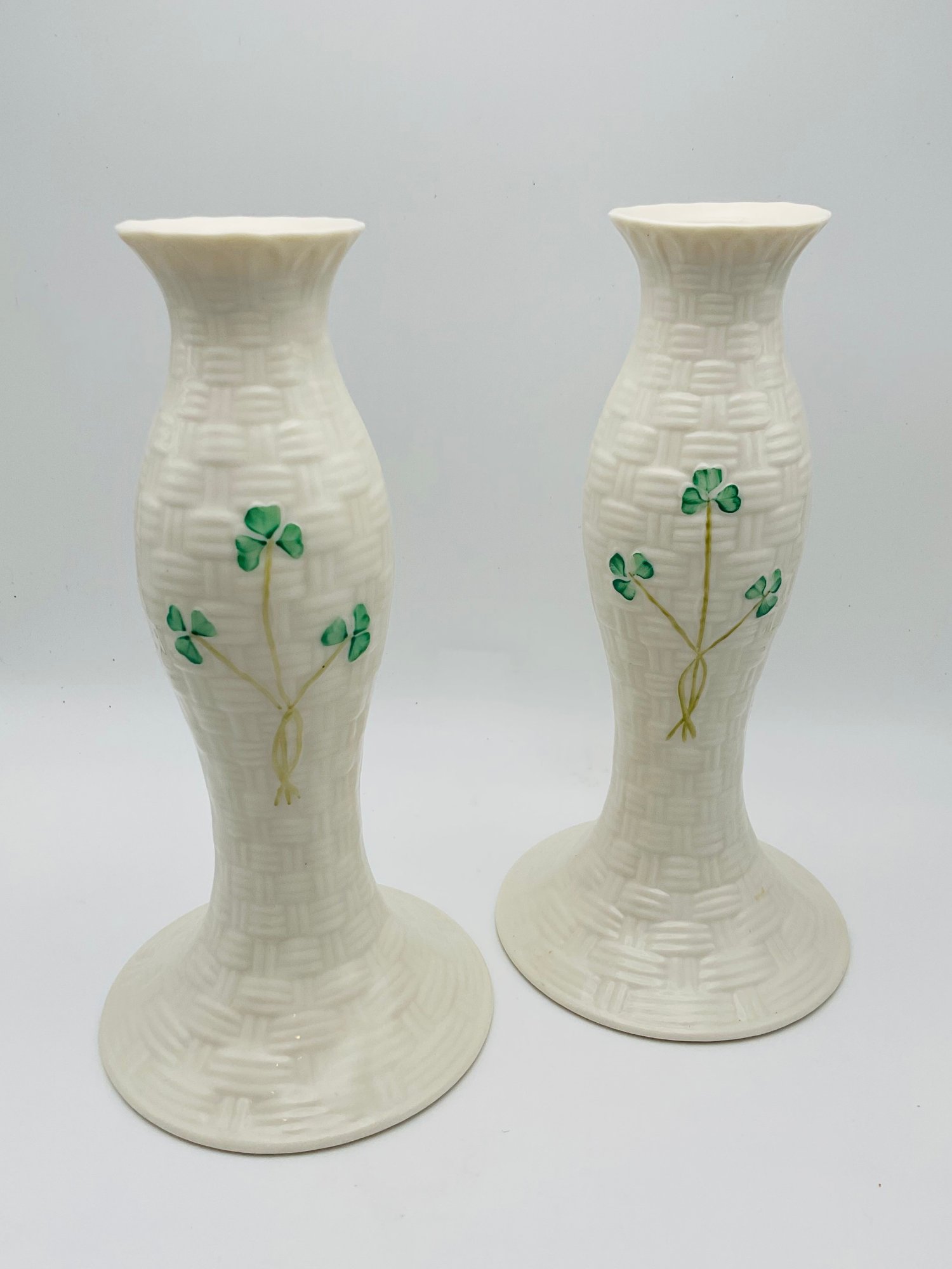 Add a touch of Irish elegance to your collection with this beautiful pair of authentic Belleek Parian China candlesticks. These pieces feature the iconic embossed basketweave texture and are hand-painted with the classic green shamrock design.