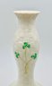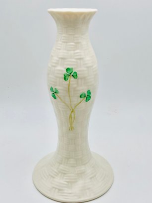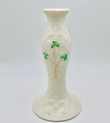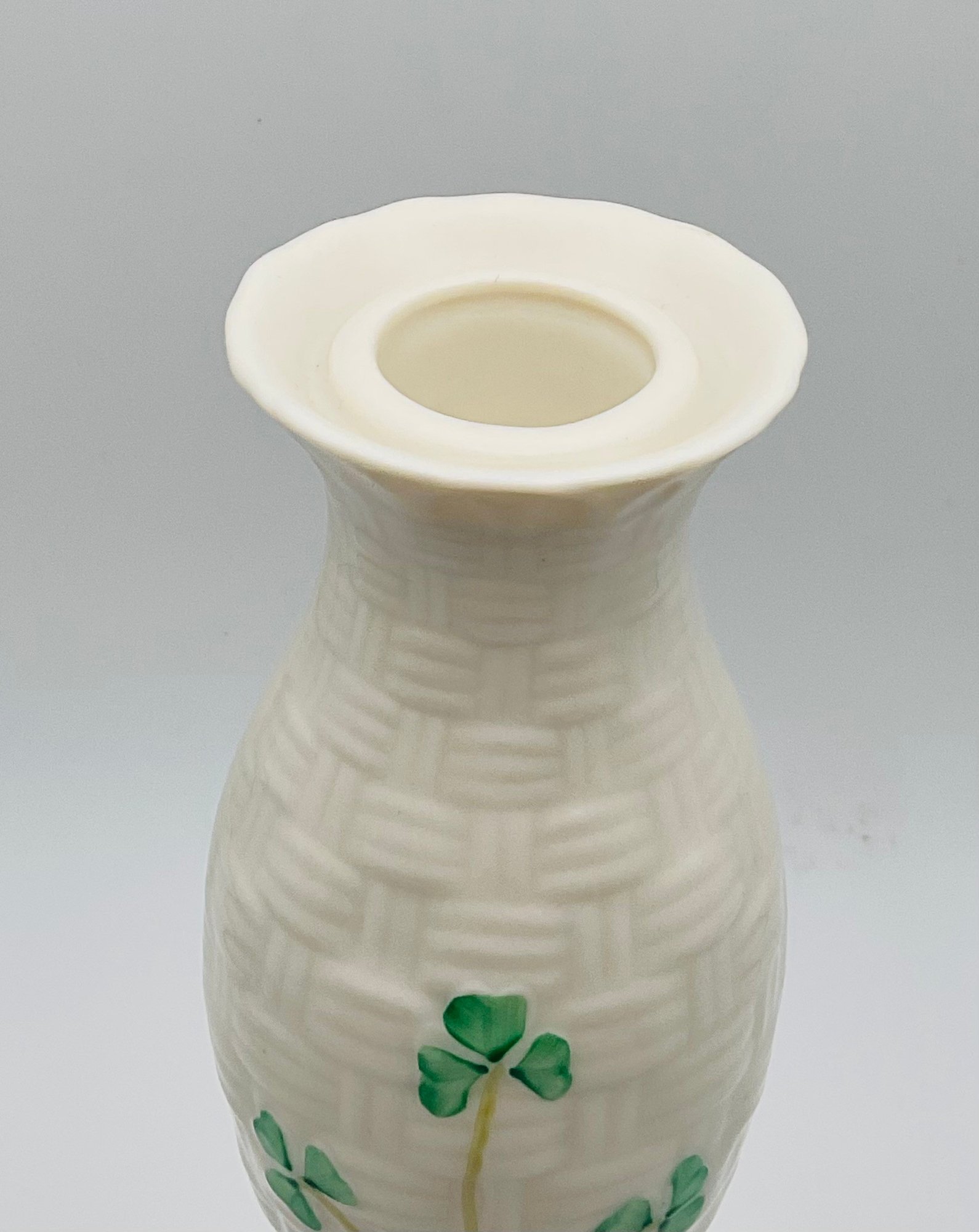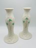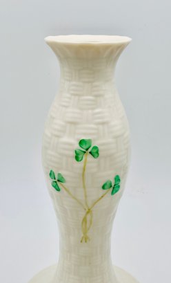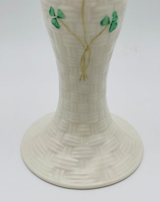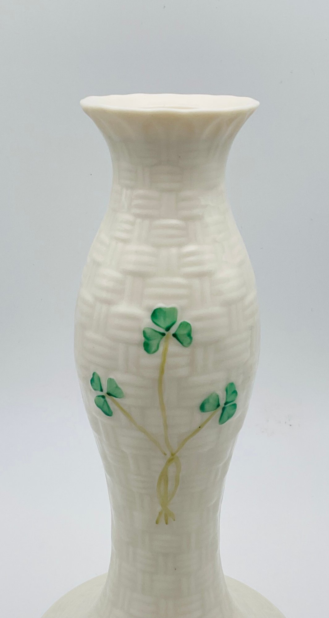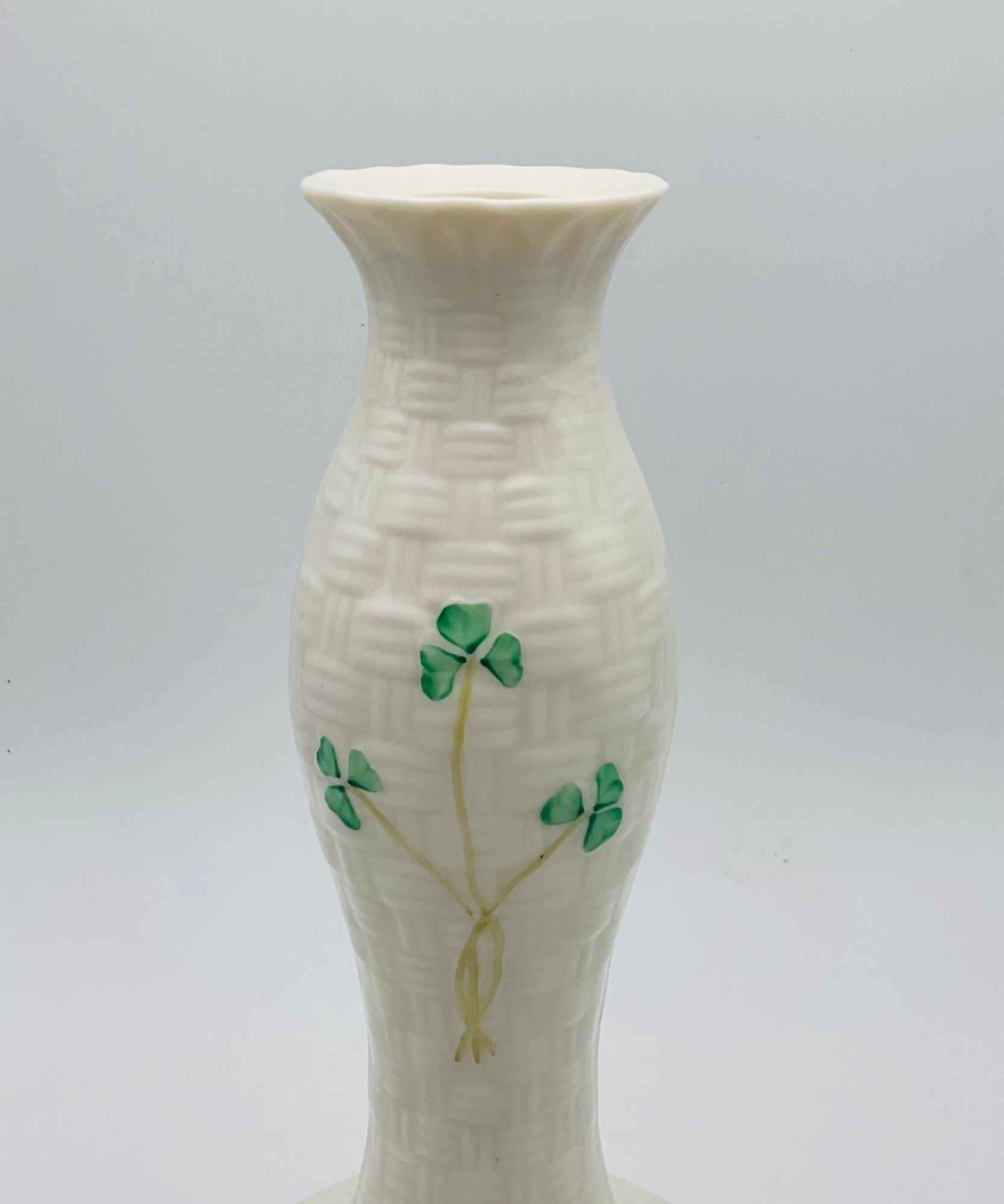 Add a touch of Irish elegance to your collection with this beautiful pair of authentic Belleek Parian China candlesticks. These pieces feature the iconic embossed basketweave texture and are hand-painted with the classic green shamrock design.