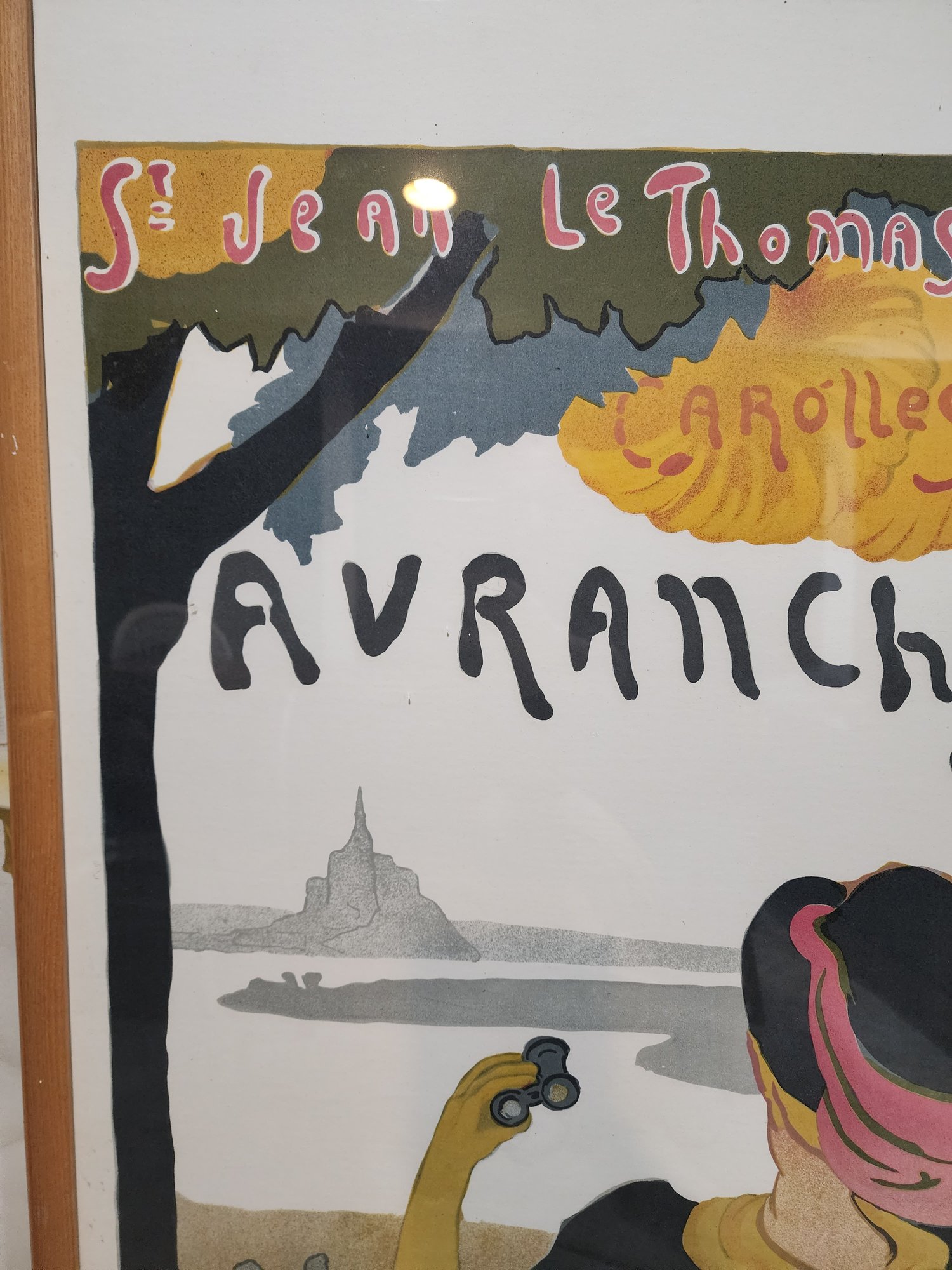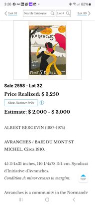Avranches is a community in the Normandy Region of France. An Avranchinese artist, Bergevin illustrates one of the scenic highlights of this region - the view over the bay of Mont St. Michel. Saint-Jean-de-Tomas, Carolles and GenĂȘts, listed at the top of the poster, are all small towns in Avranches