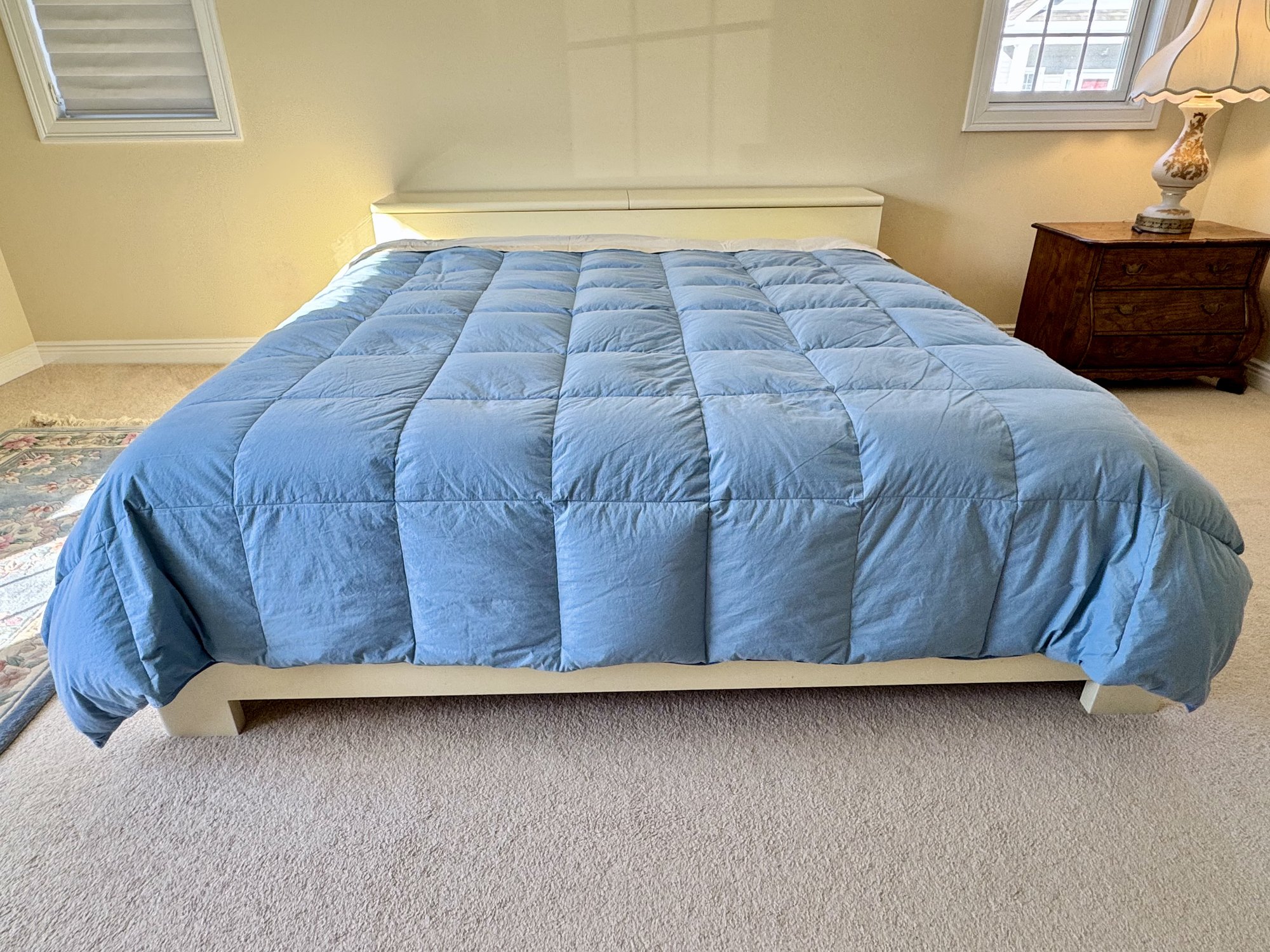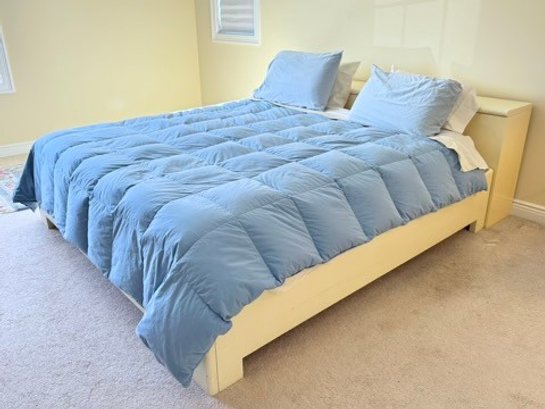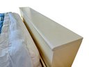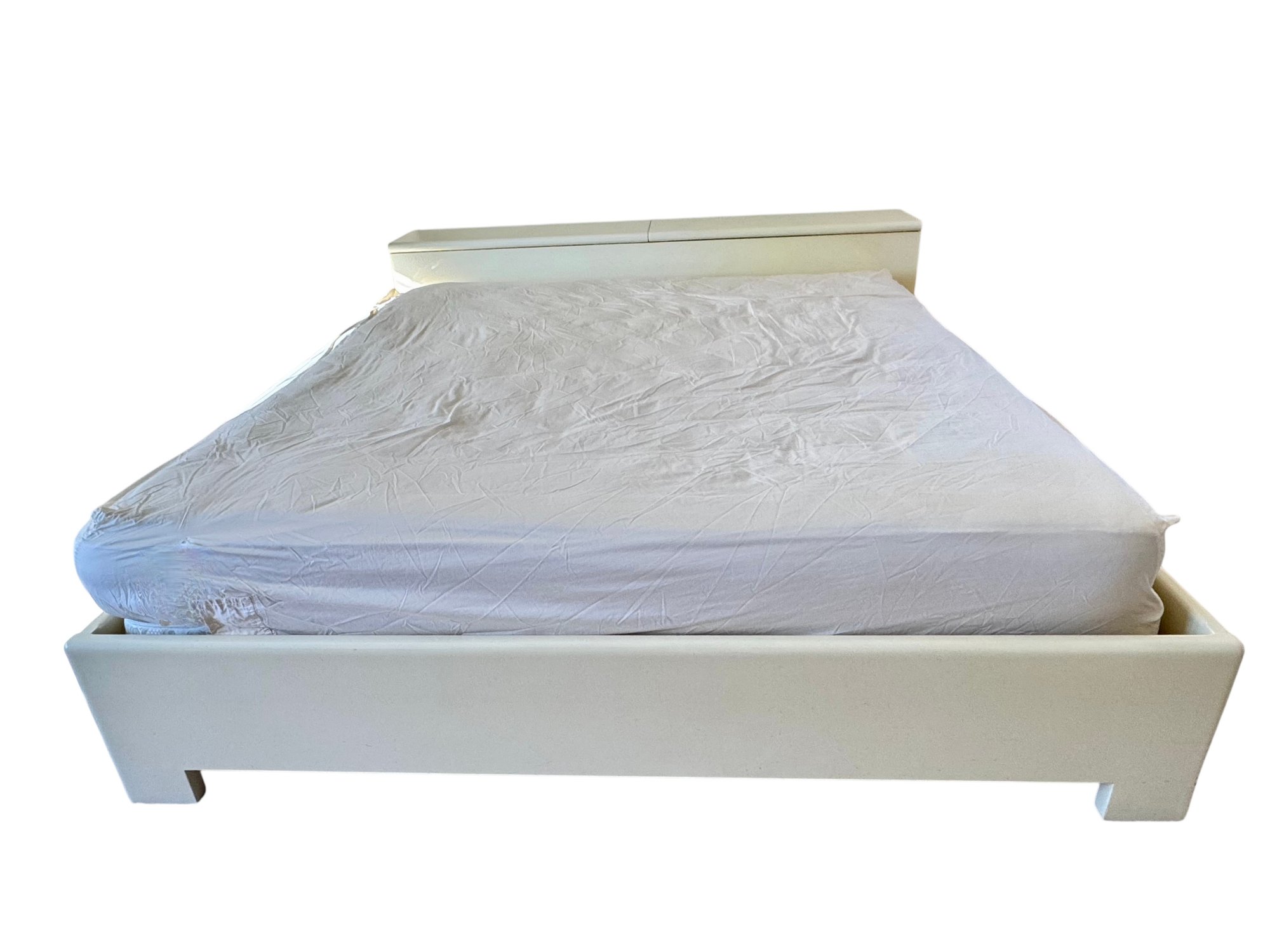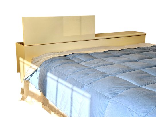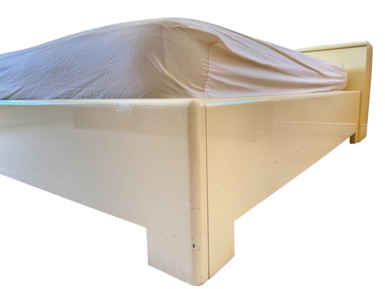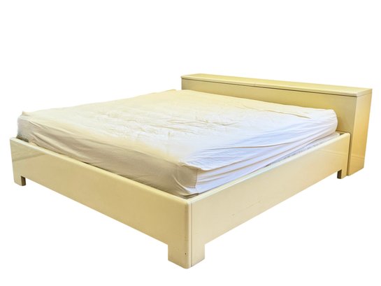 This sculptural, custom-crafted king-size platform bed dating to the late 1980s is finished in a warm cream lacquer, the design is defined by substantial block legs, softened edges, and a low-profile silhouette.