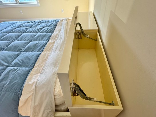 The integrated headboard is both sleek and functional, concealing two separate lift-top storage compartments across its full width. Each compartment is independently supported by quality lift hardware, offering generous hidden storage while preserving the uninterrupted linear form of the headboard.