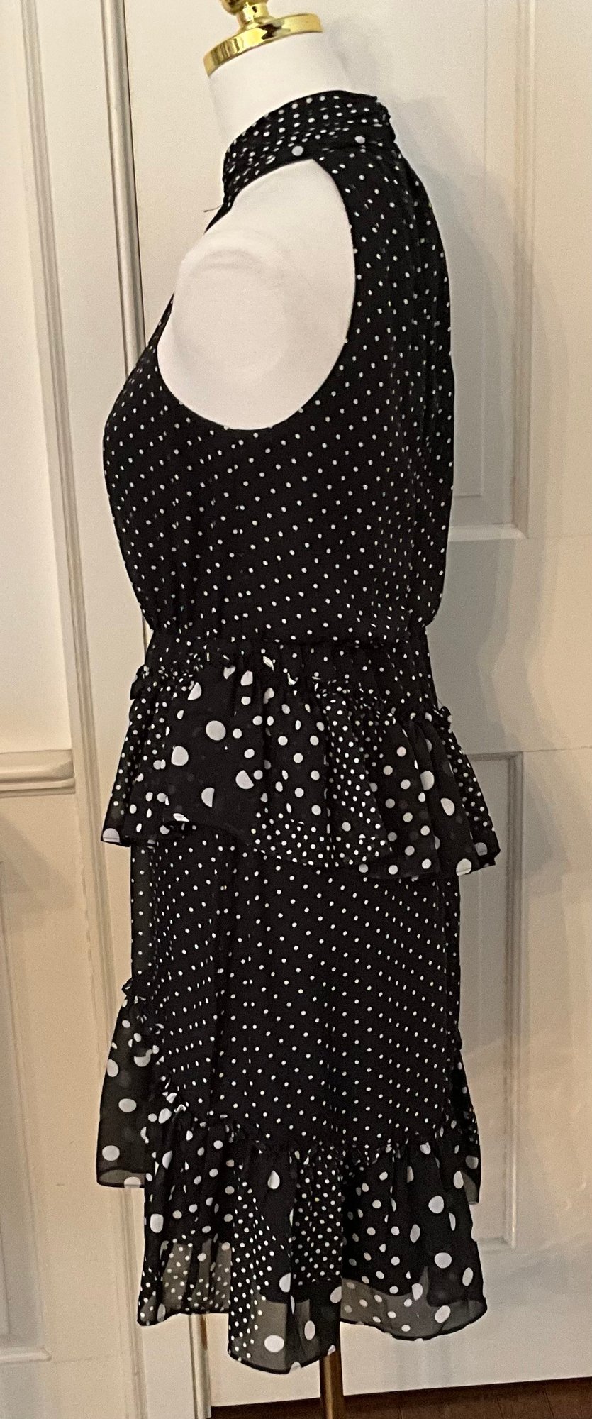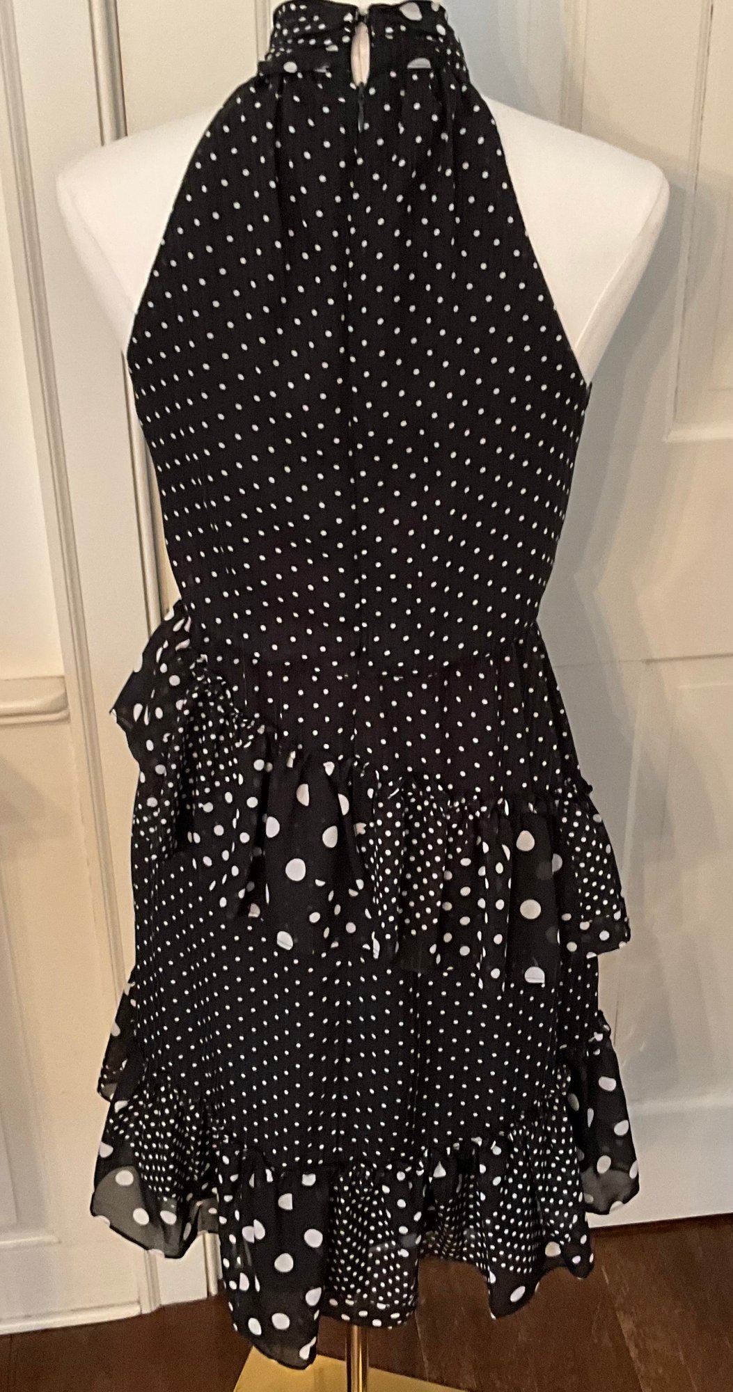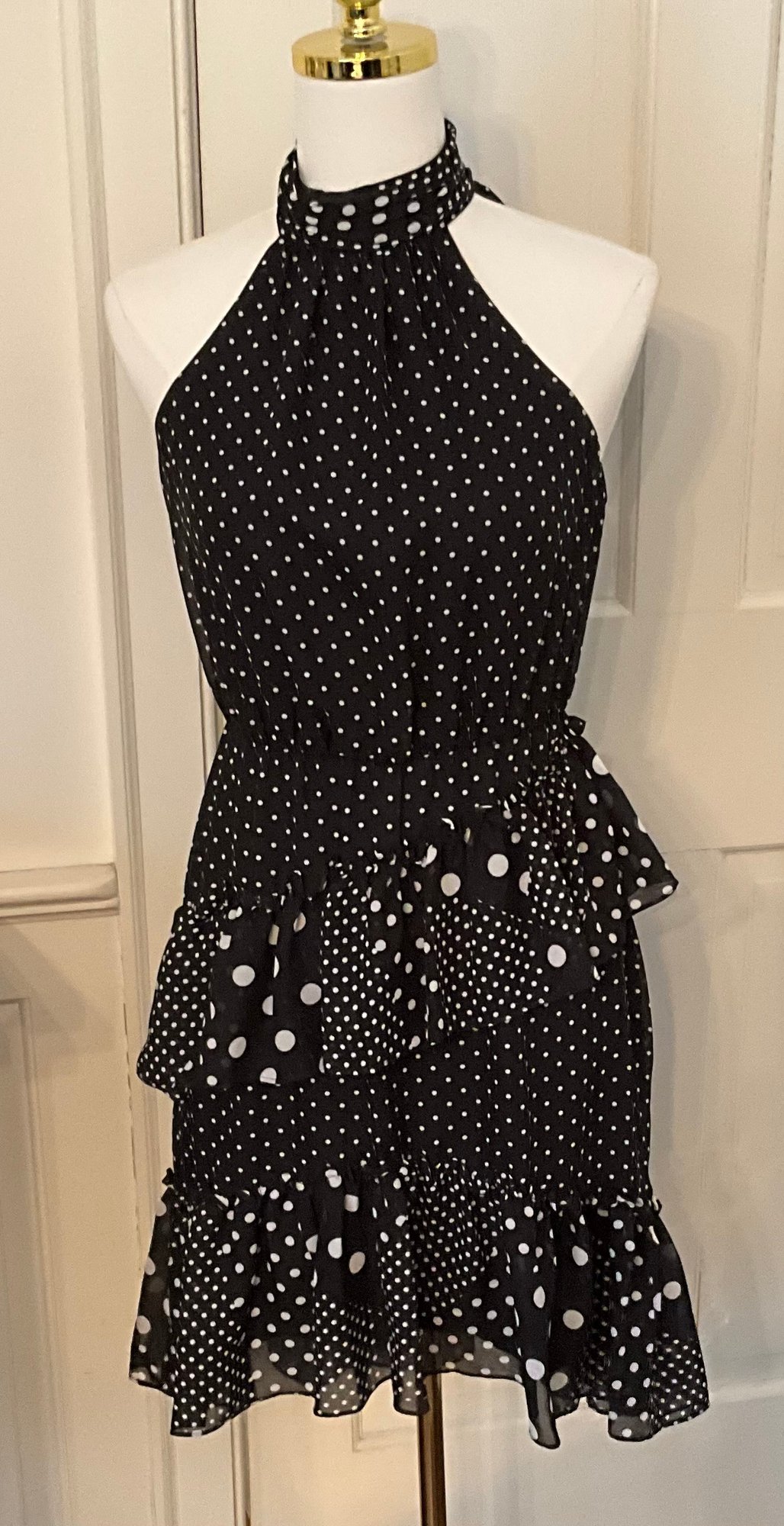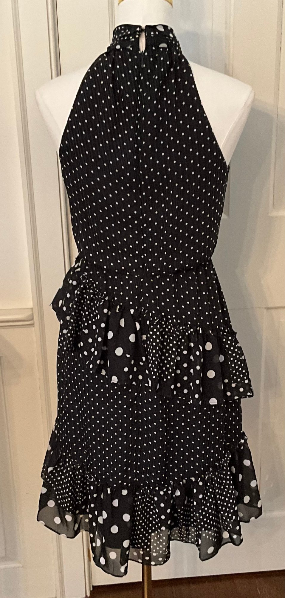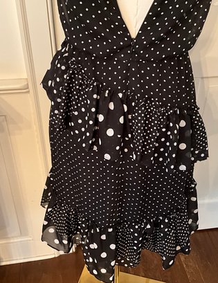 Stylish Betsey Johnson halter dress featuring a classic black and white polka dot pattern with a playful mix of small and large dots throughout. The dress has a halter neckline with gathered collar, a fitted bodice, and a tiered ruffle skirt that creates movement and a fun feminine silhouette.