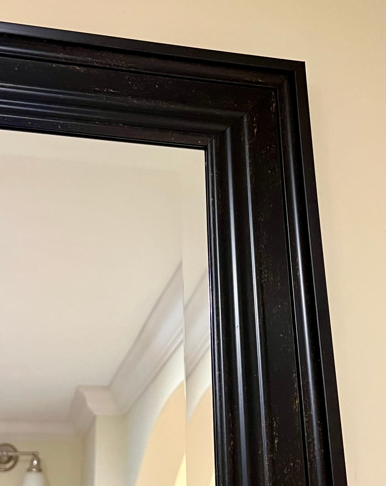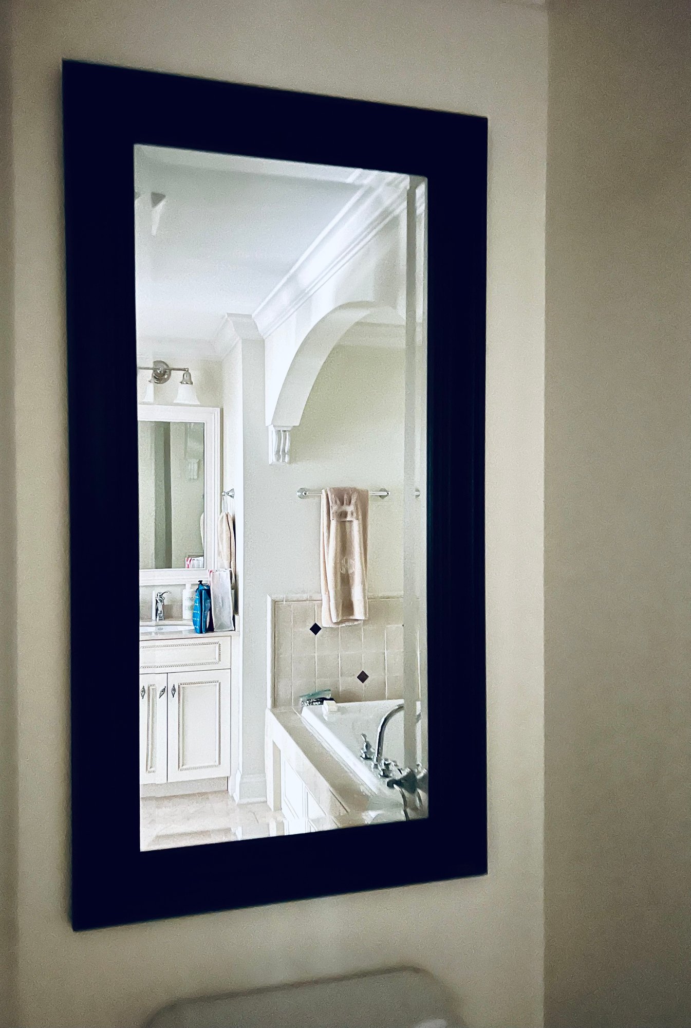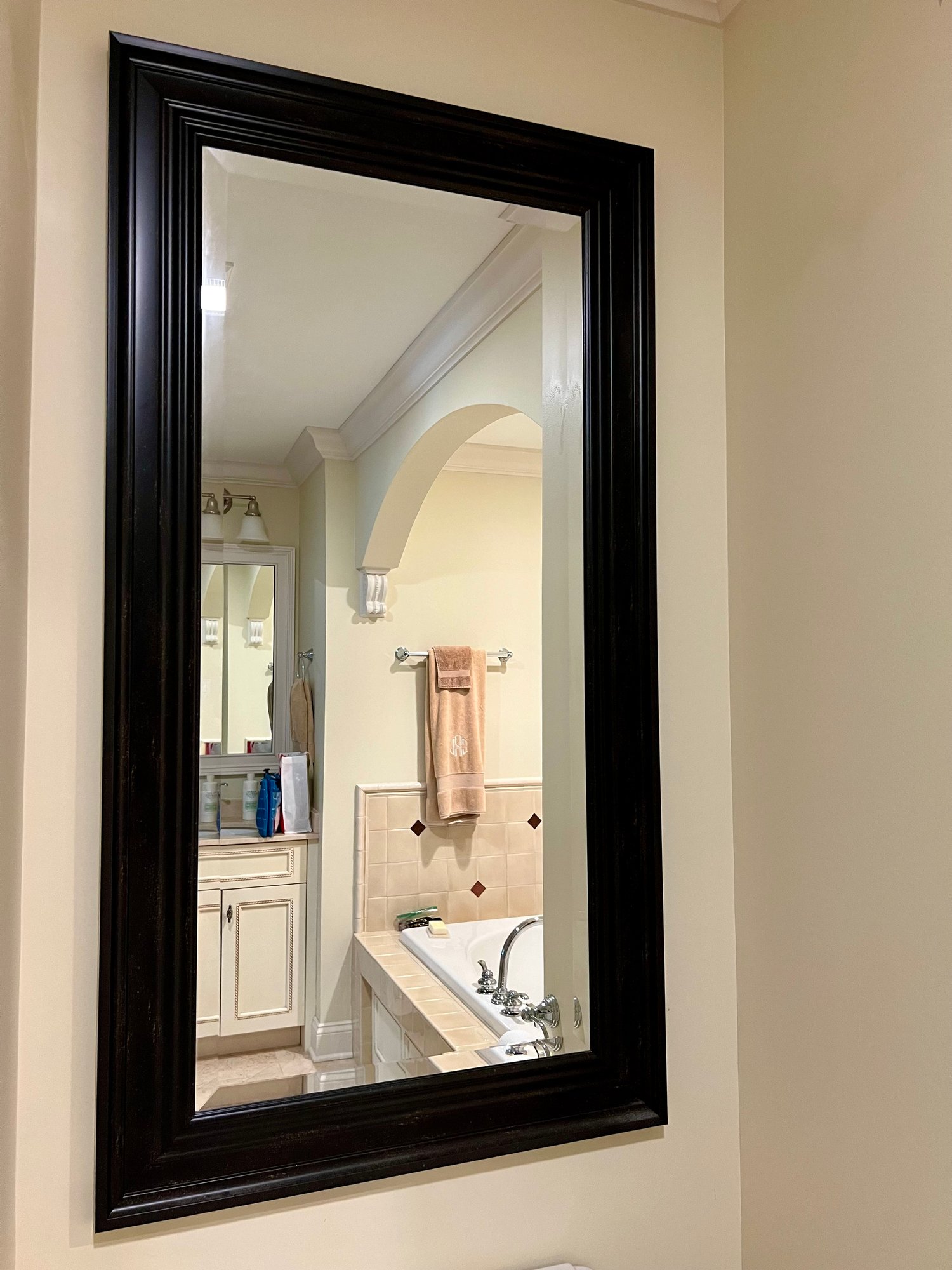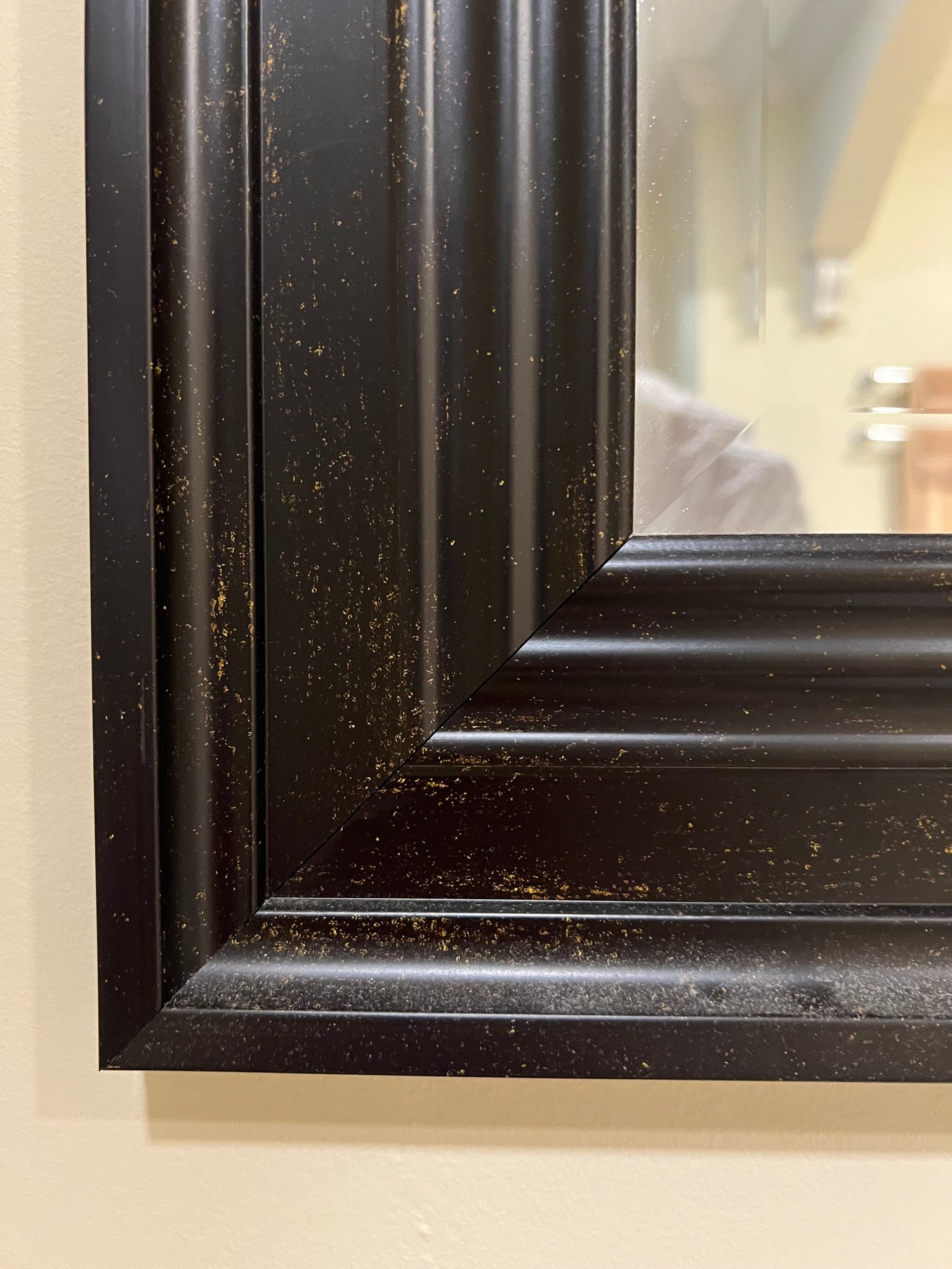 Contemporary beveled mirror in a dark panel style frame with a subtle burnished finish. Home Goods item.