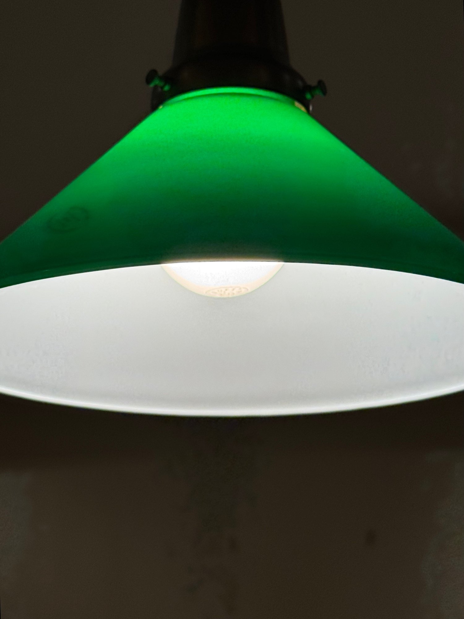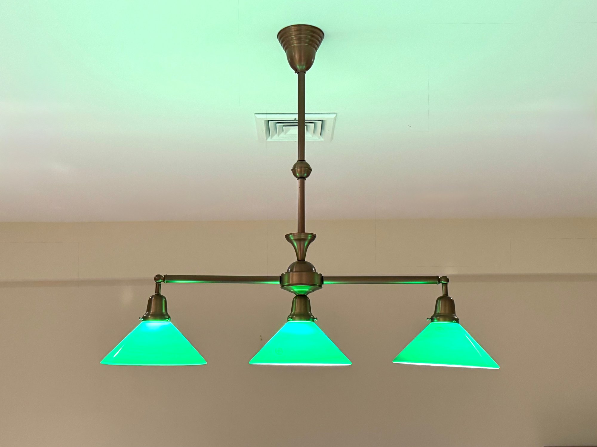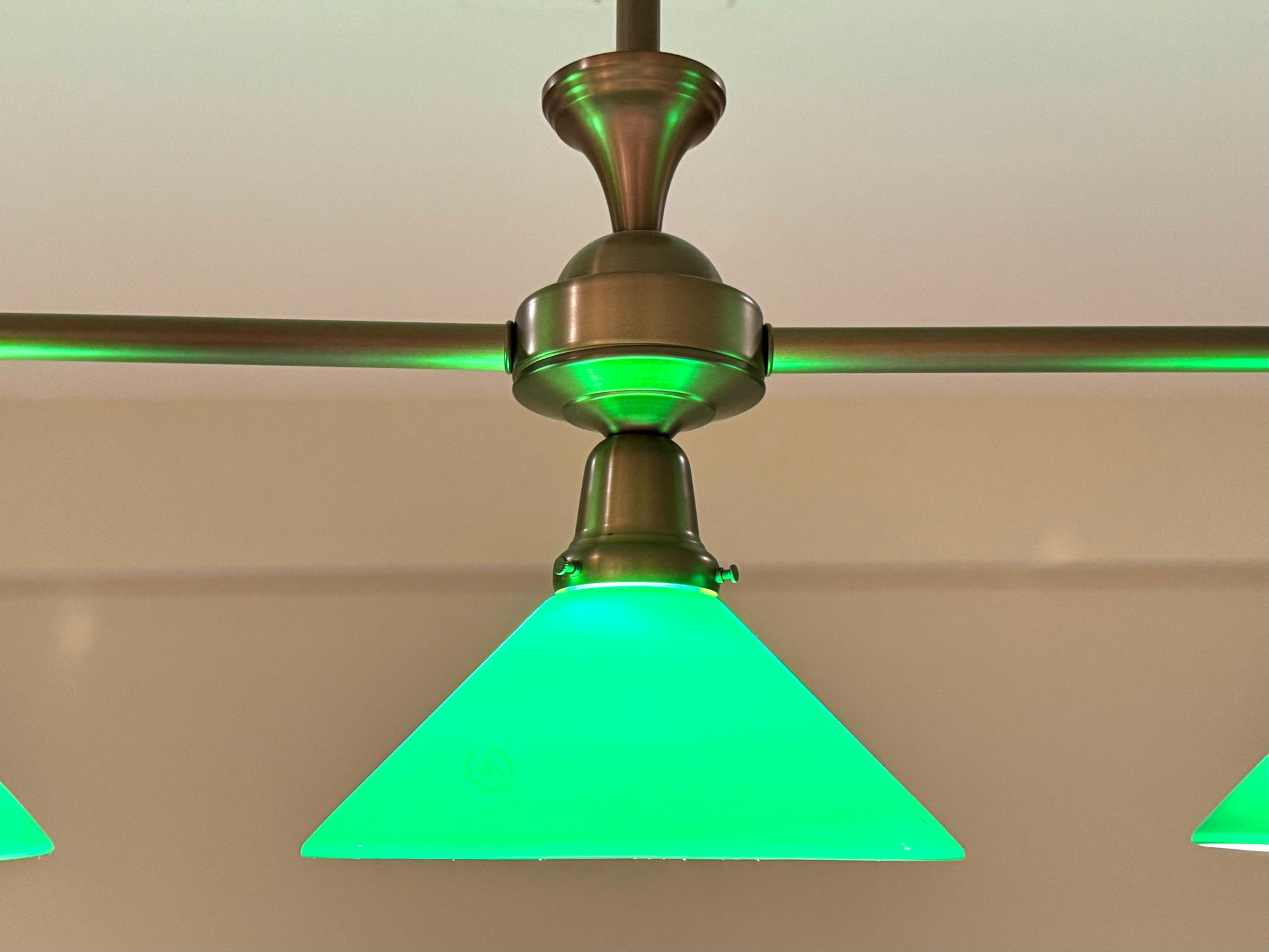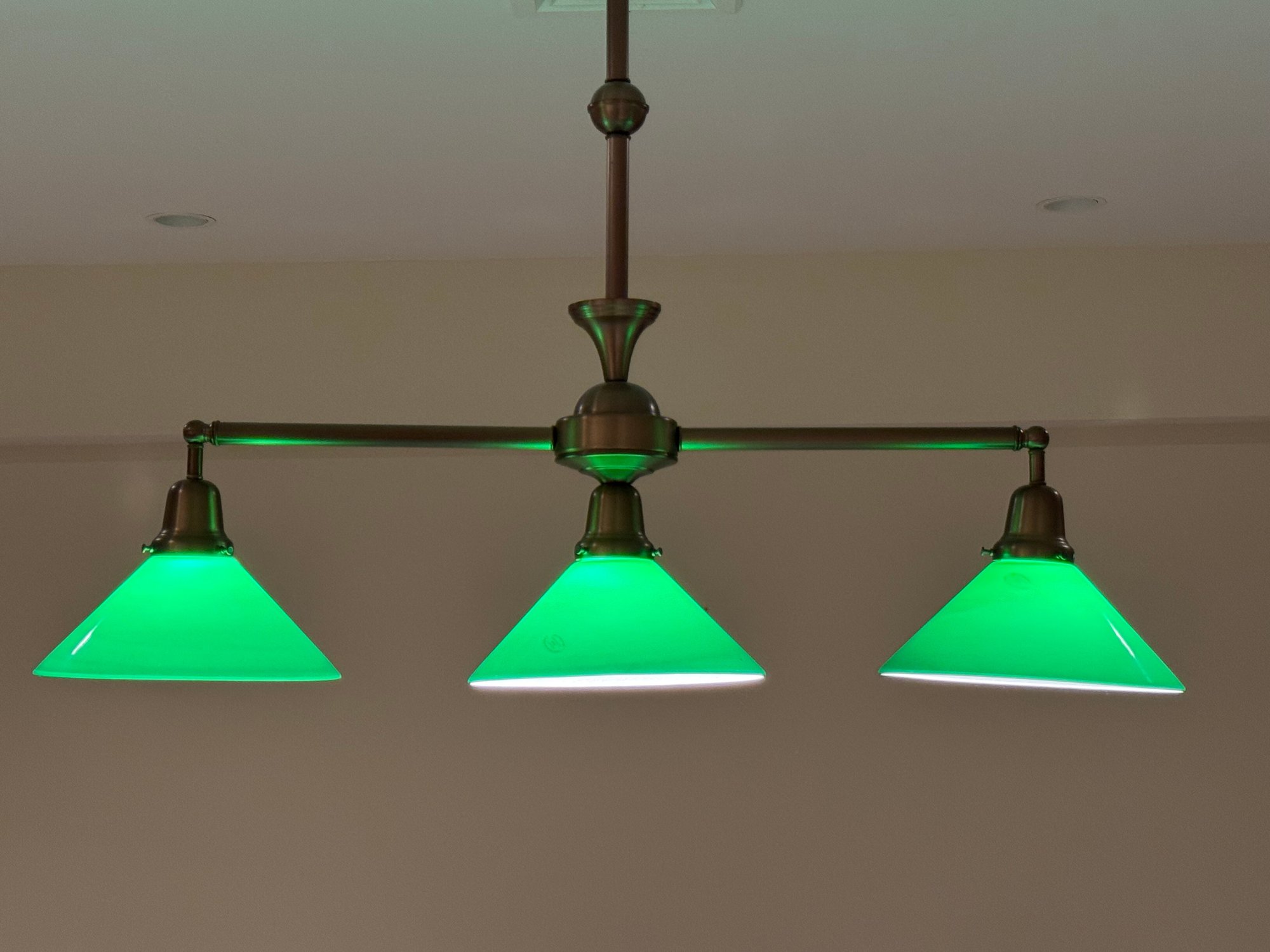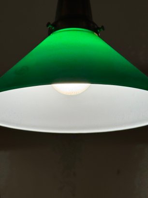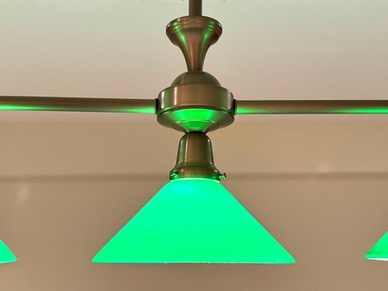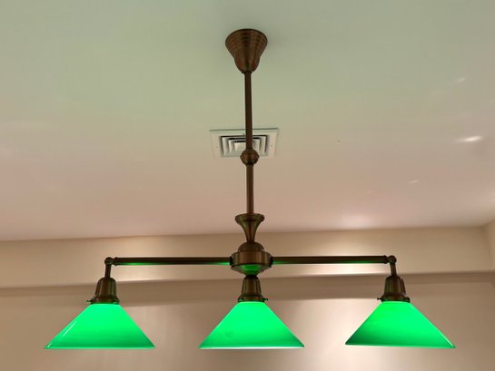 Handsome billard light with three green glass shades with white underline. Size 36 L x 33 H x 9.5 Shade Diameter