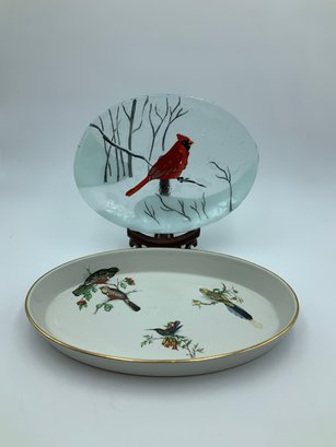 This lot includes 2 beautiful platters. The first is a Fused Glass plate featuring a winter cardinal signed A C Ross - handcrafted by Anne C Ross, an artist who worked on Cape Cod. The second is Pilivite French porcelain by Pilivuyt & Co, a 200 year old company. Both in excellent condition although the gold rim on the Pilivite has some scuffs.