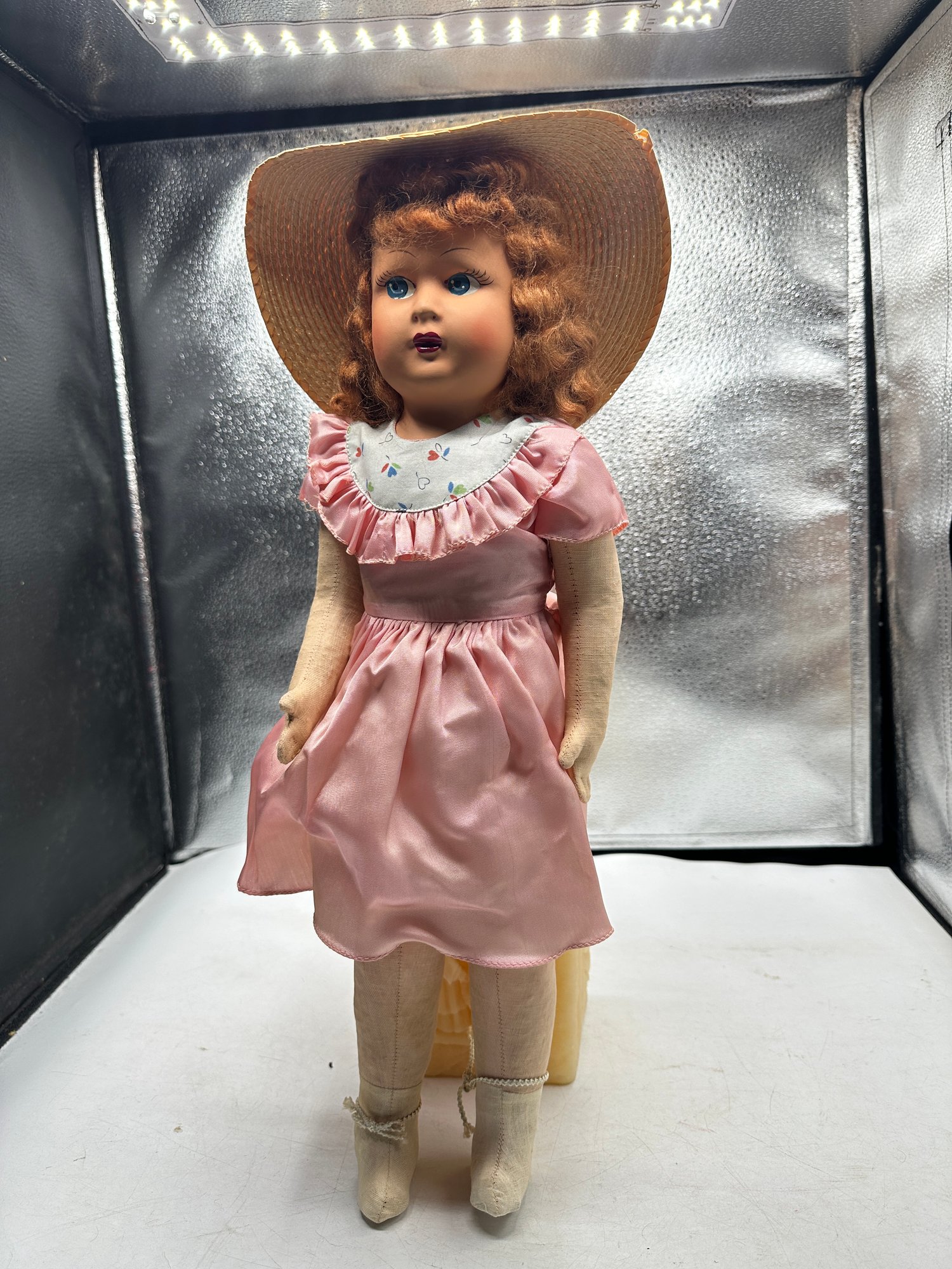 This doll has a soft body but arms and legs feel hard (horsehair?) , blue painted eyes, red hair, and measures 17". The metal things attaching her arms and legs appear old see pictures.