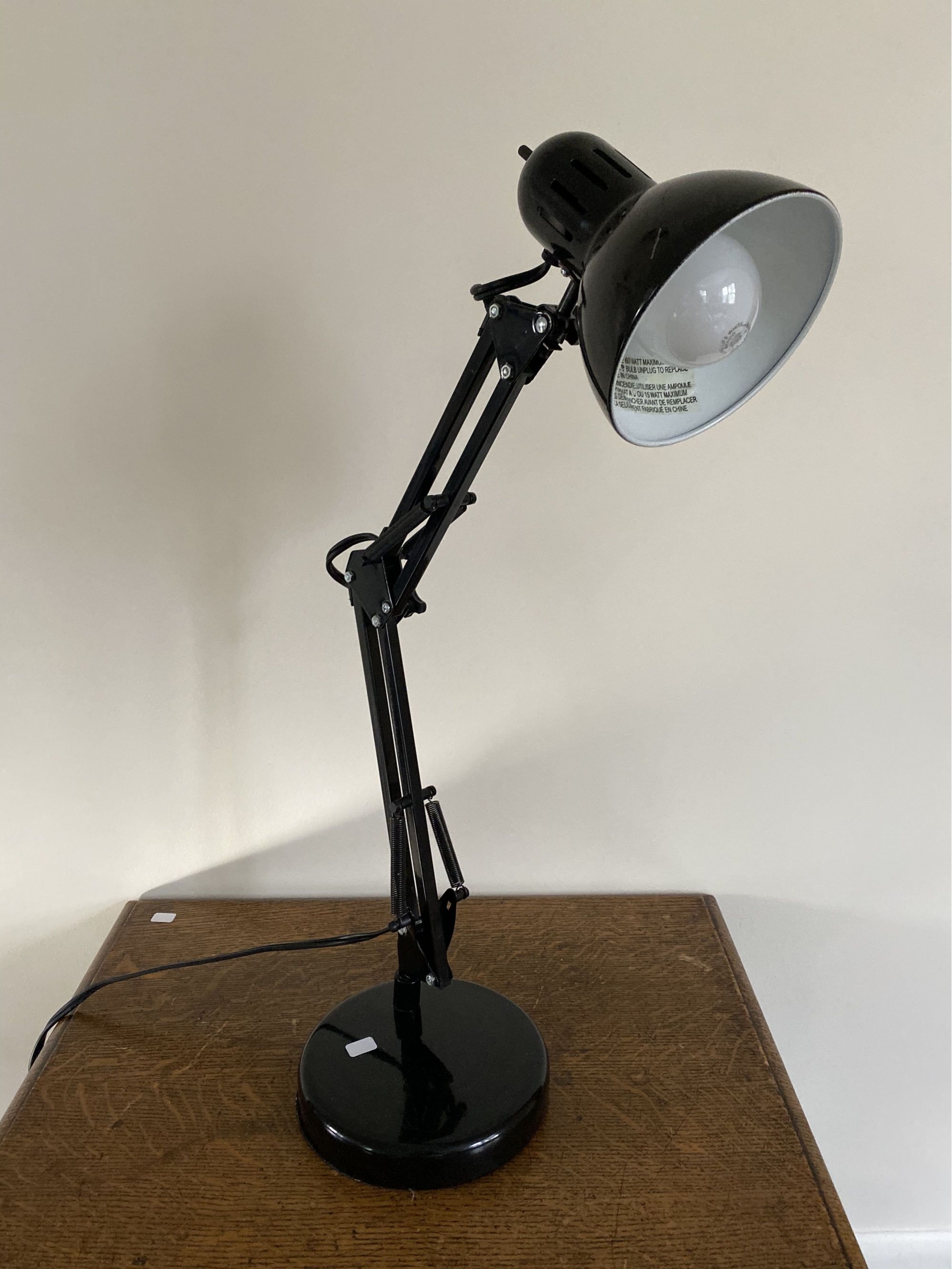 Adjustable desk lamp in black. Please note base is slightly loose. Some scratches but otherwise works well.